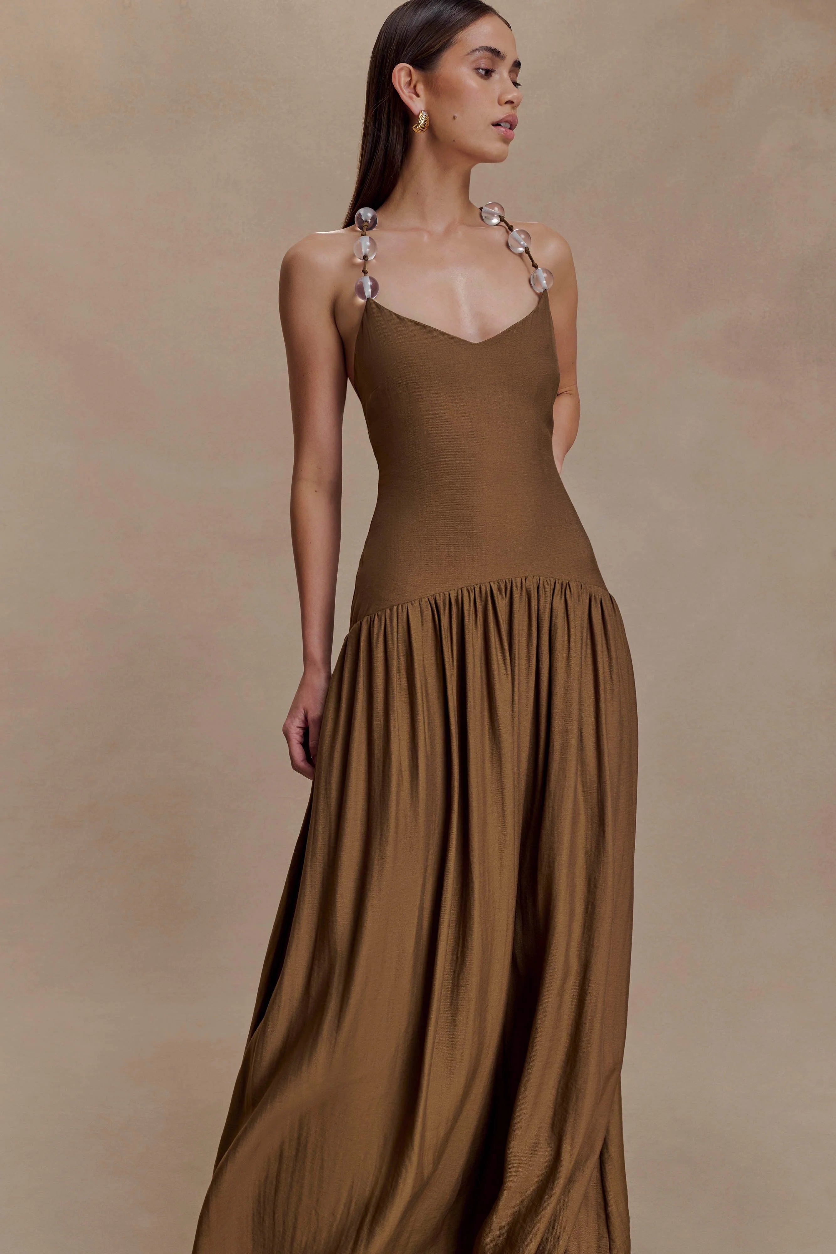 The DARLING Linen Maxi Dress is crafted to capture effortless femininity through refined structure and flow. Featuring a curved neckline and statement beaded straps, it blends natural texture with modern allure. The drop curved waist with gentle gathers creates movement through the A-line skirt, while cross-back adjustable straps offer a personalised fit. Fully lined for comfort and cut to a maxi length, this dress is understated yet impactful—perfect for sunlit occasions and resort moments.