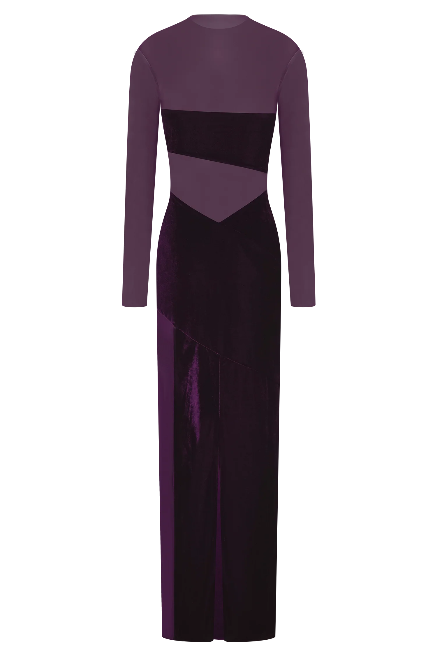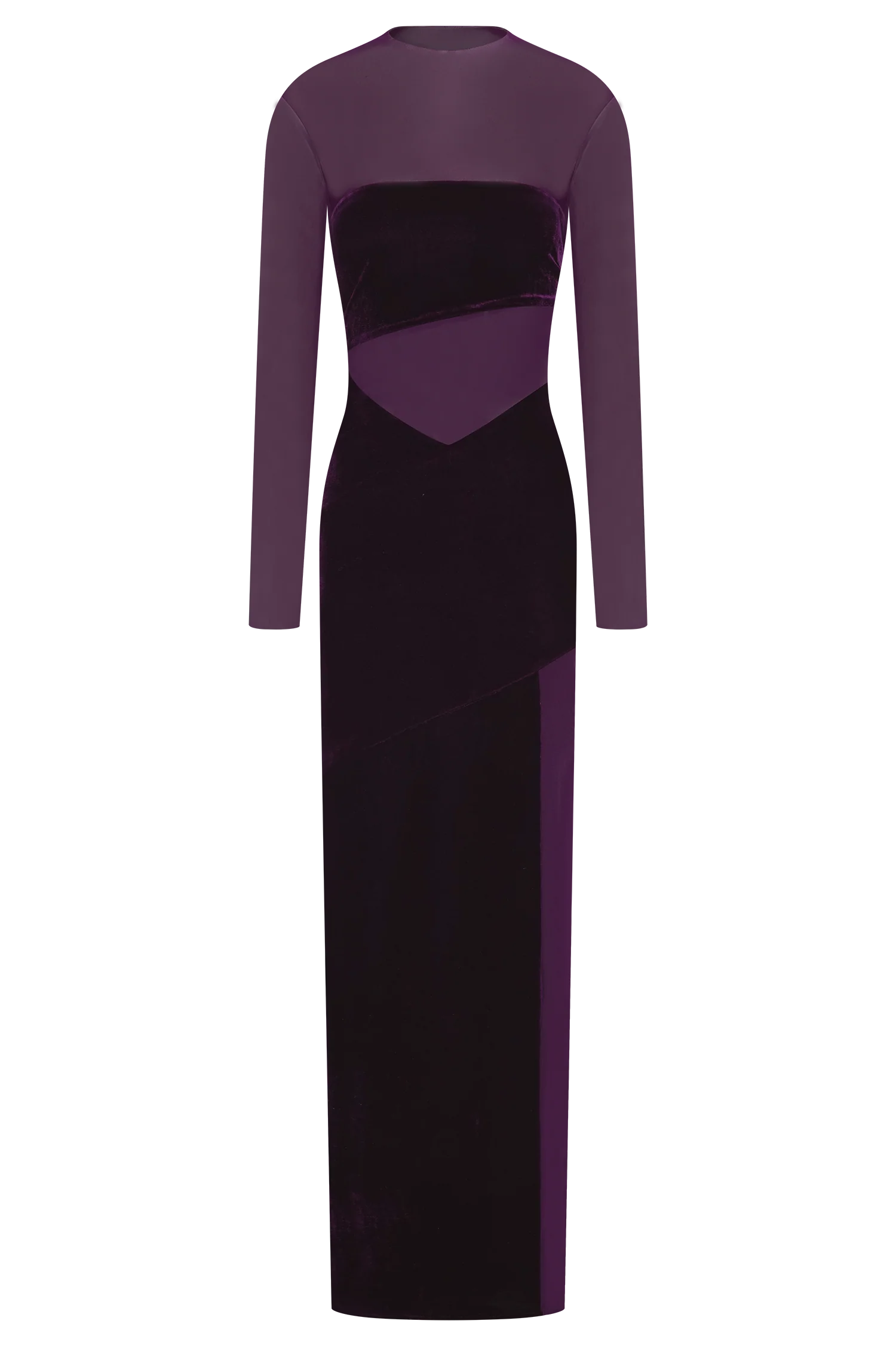 The DAVINA Velvet And Mesh Maxi Dress merges texture and form for a striking after-dark statement. Designed with a high neckline and long sleeves, it’s detailed with velvet and mesh cut-outs that trace the silhouette with precision. The bodycon fit sculpts the frame, while a back leg opening adds subtle movement. Partially lined for balance between coverage and allure, this dress embodies modern sensuality through sleek, structured design.