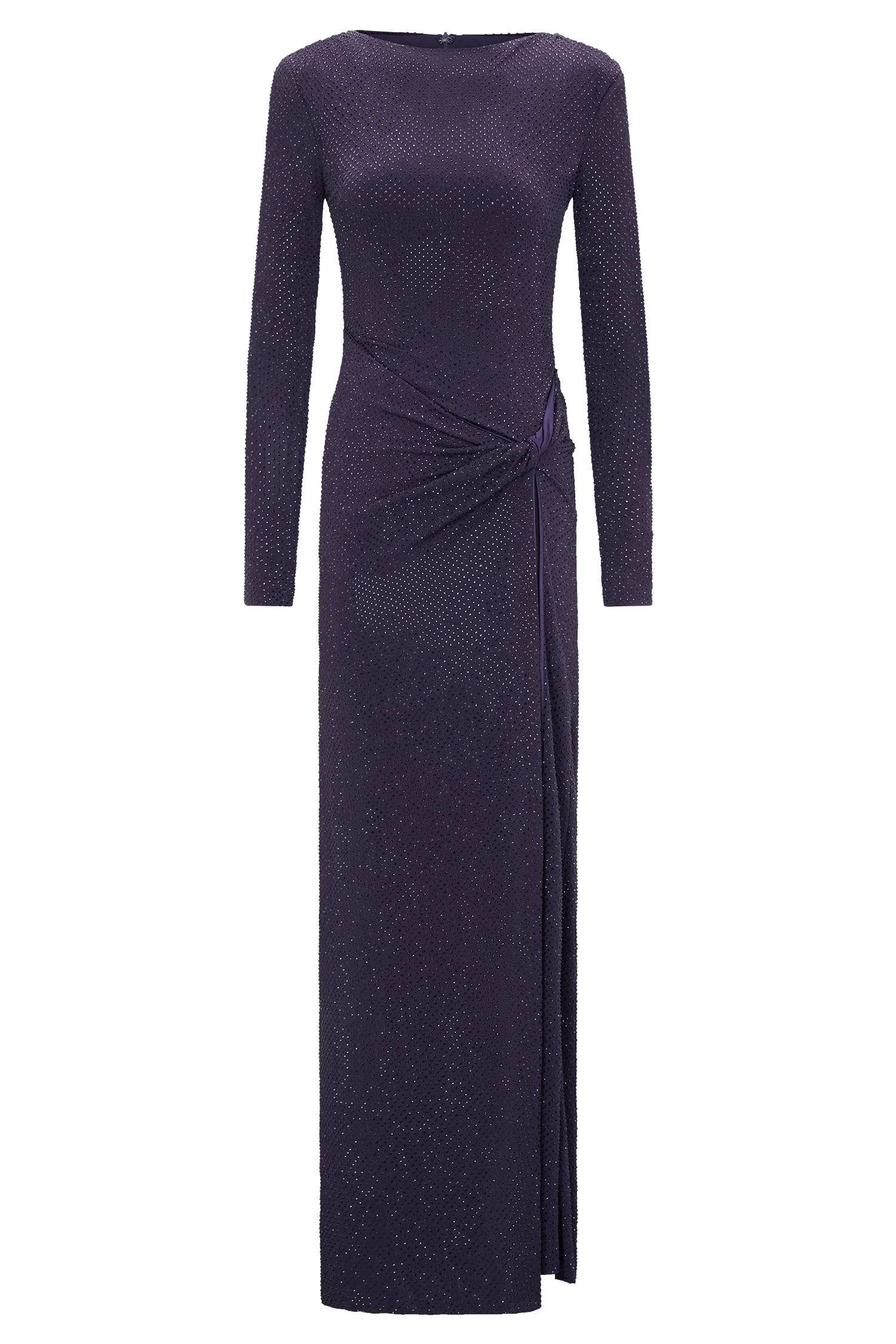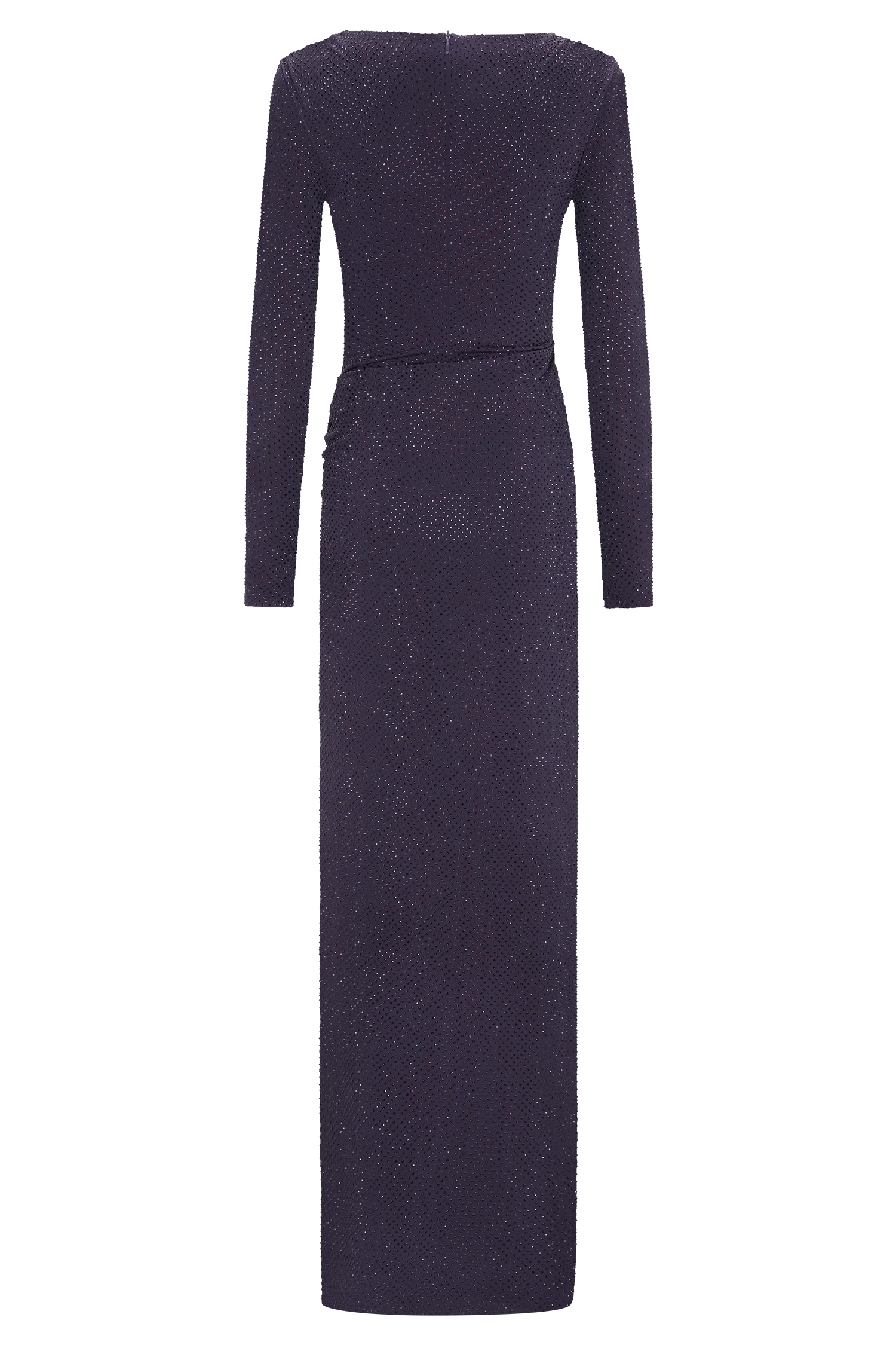 The DEANNA Long Sleeve Diamante Maxi Dress is a statement in sophistication and versatility. Designed with a sleek boat neckline and long sleeves, it features a twist waist detail that accentuates the silhouette in a fitted bodycon cut. The standout feature? Removable shoulder pads — giving you two looks in one, from sharp structure to soft drape. Fully lined for a smooth finish, this dress is complete with a side leg split and back zip closure for ease of wear. Perfect for moments that call for refined glamour with a custom edge.