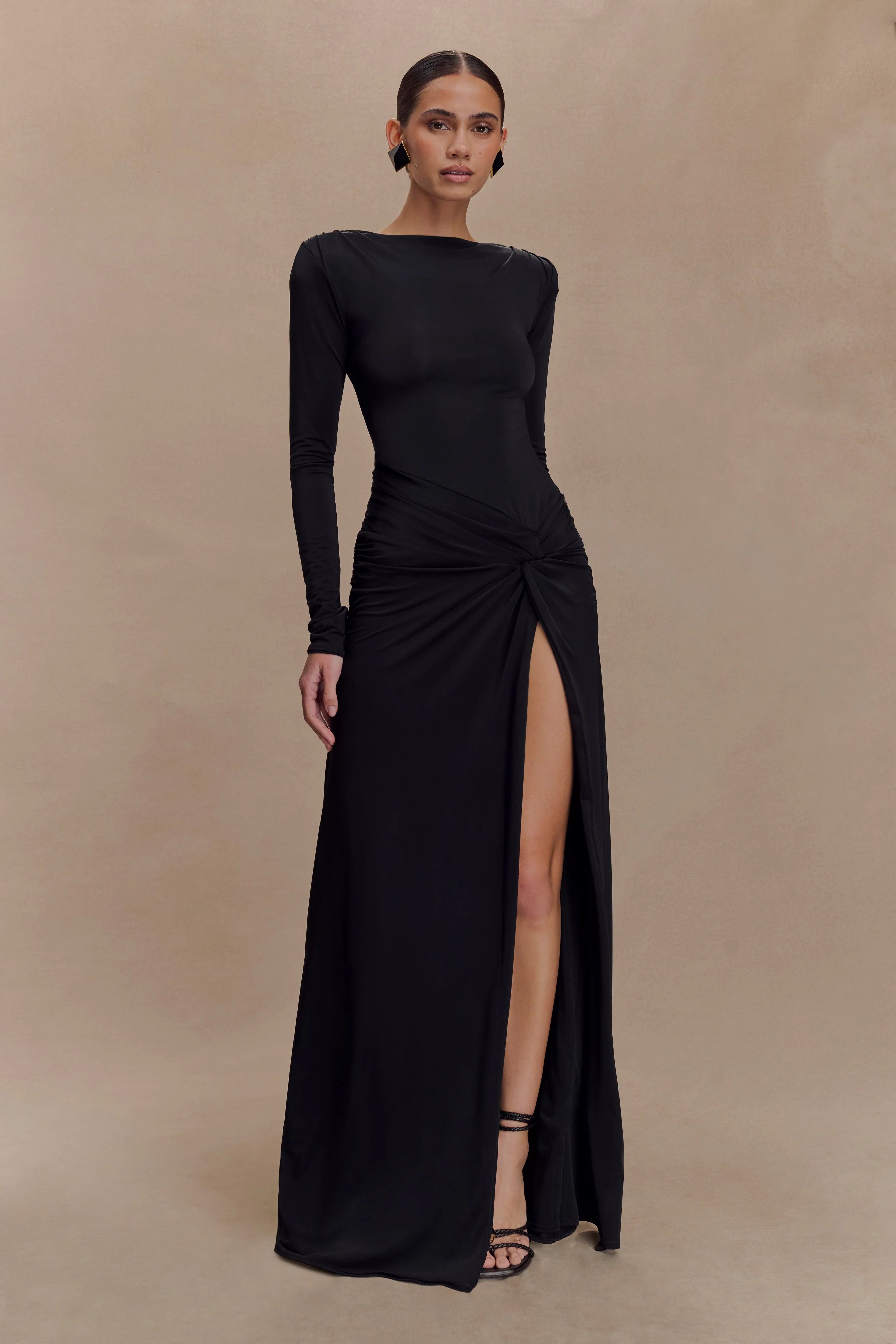 The DEANNA Long Sleeve Gathered Maxi Dress is a confident take on classic evening wear. Framed by a boat neckline and statement shoulder pads, this dress creates a bold yet feminine silhouette. Its bodycon fit is elevated with a front waist twist and gathered hip detail, designed to enhance and define. A thigh-high side split adds subtle drama, while the partially lined finish keeps the look sleek and sculptural. Perfect for nights that call for quiet power and polished allure.