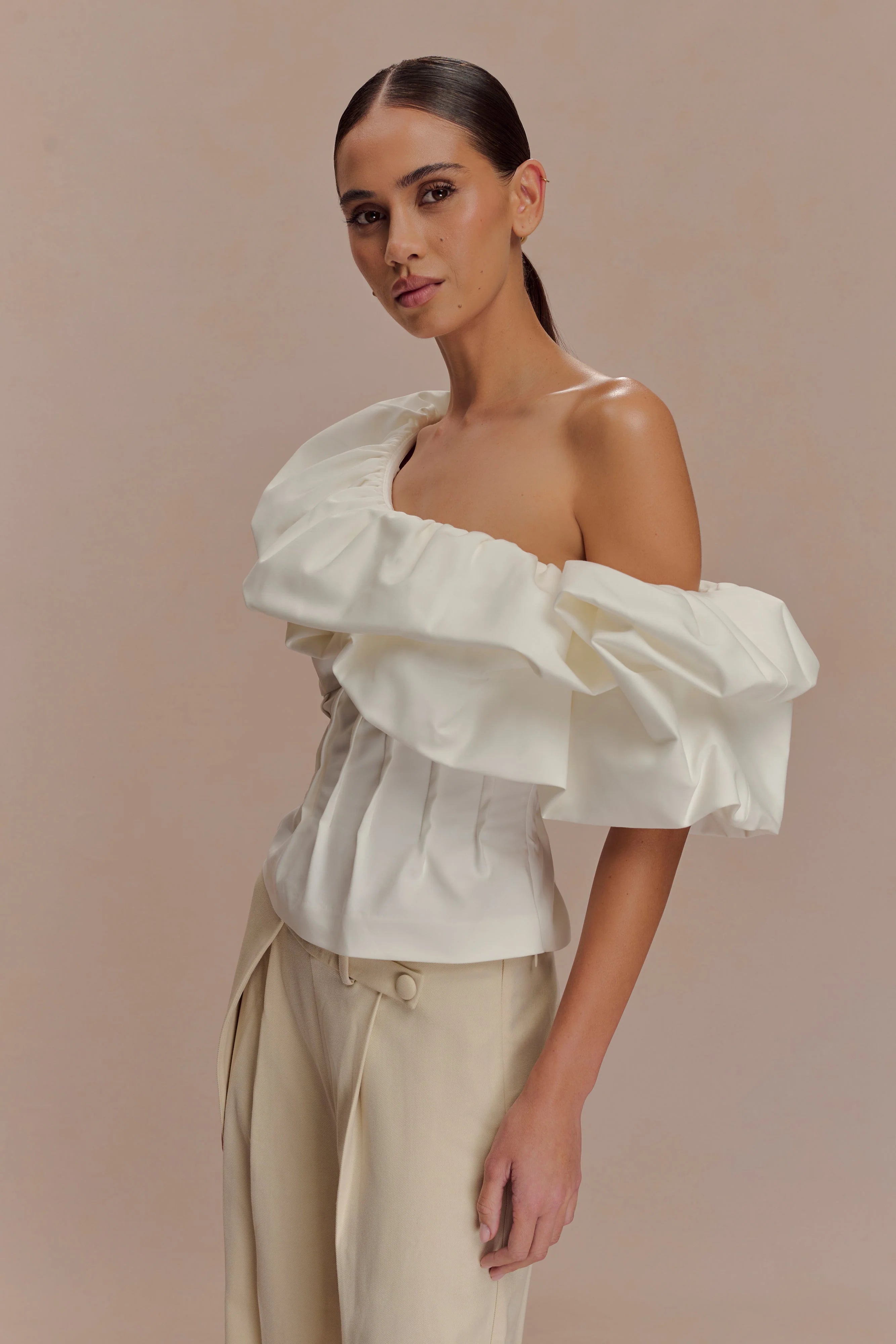 The DEBBIE One Shoulder Bubble Top is a bold yet feminine take on modern occasion dressing. Designed with a bubble-style asymmetric neckline and soft pleating through the bodice, this top creates a sculptural silhouette with ease. The elasticated neckline ensures comfort and flexibility, while the invisible side zip offers a seamless fit. Finished with a flared peplum hem and partial lining, this top is perfect for adding drama to tailored bottoms or balancing out sleek skirts with playful proportion.