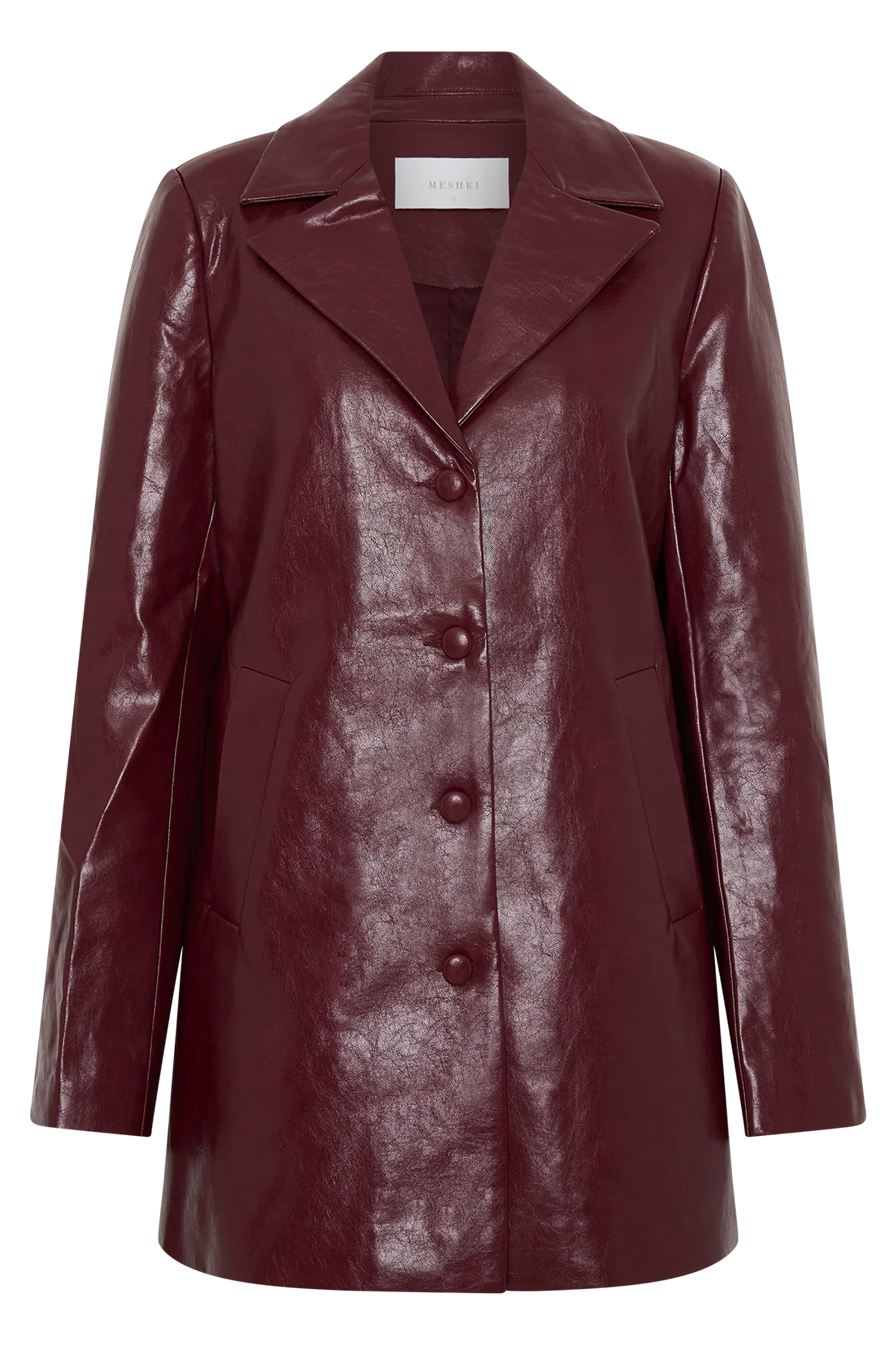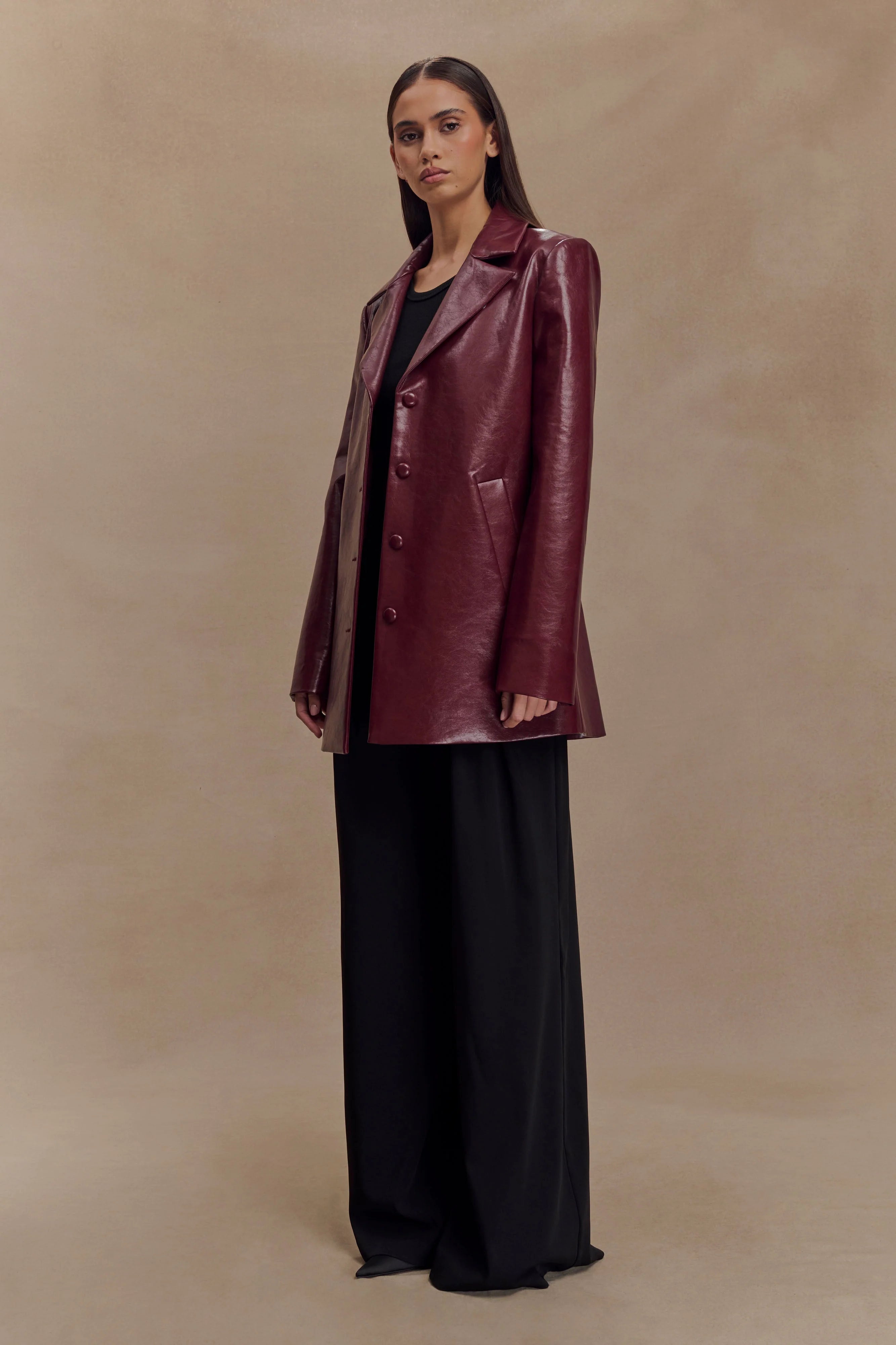 Make a commanding entrance in the DEBORAH Faux Leather Coat, a bold outerwear statement with sleek sophistication. Designed with a peaked lapel collared neckline and structured shoulder pads, this coat exudes confidence and edge. The glossy patent PU leather adds a modern touch, while the centre front button closure and full lining ensure both style and comfort. Mid-length for versatile layering, this coat is your go-to for elevated outerwear with attitude.