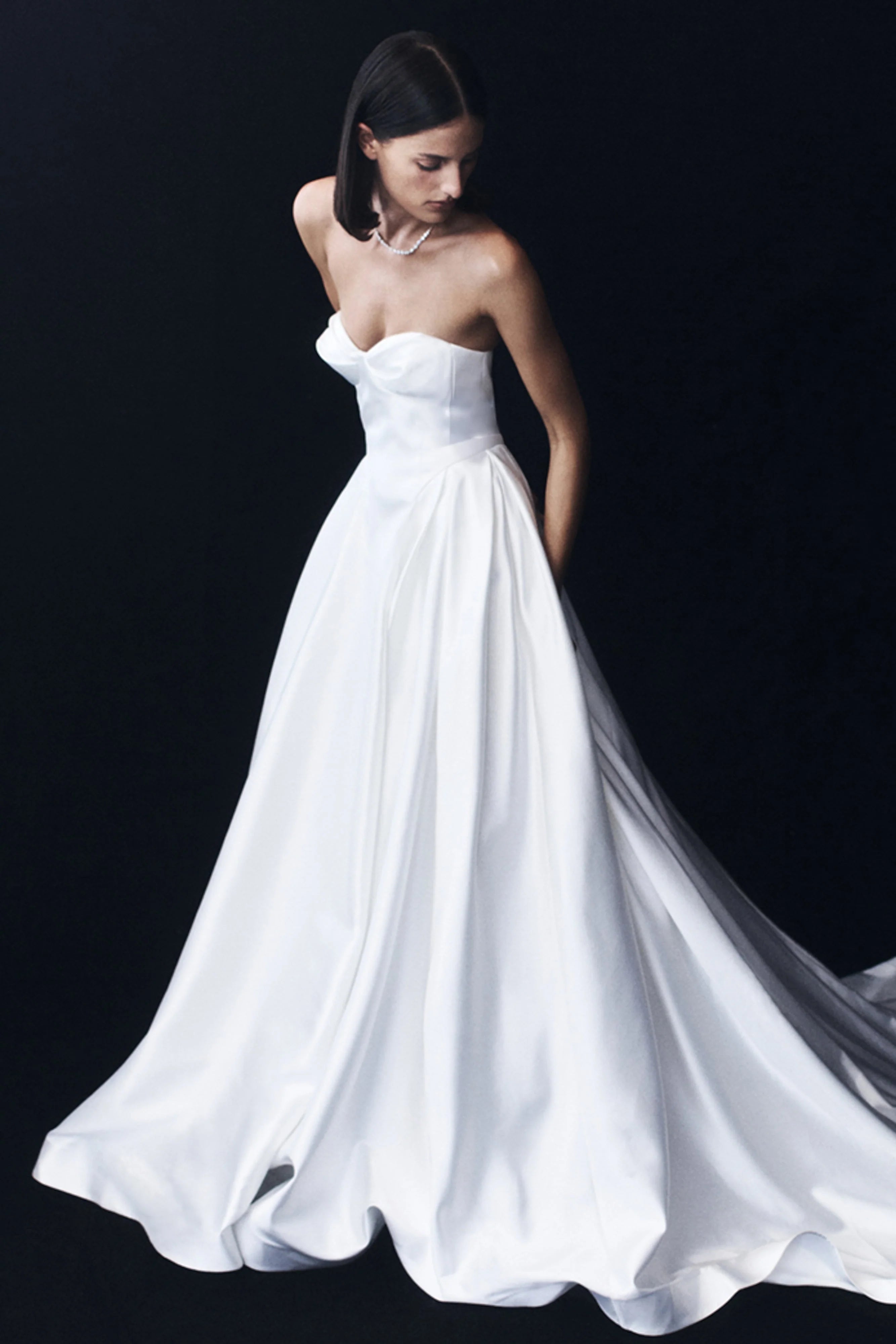 The DELPHINE Satin Strapless Maxi Gown is the epitome of modern bridal sophistication. Designed with a romantic princess neckline and a corset-shaped bodice, this gown sculpts and supports with built-in bust cups and an internal waist stay for a flawless fit. The full skirt cascades effortlessly into a sweeping train, enhanced by structured tulle and a refined horsehair hem for graceful movement. Finished with an internal bustle and discreet back zip with hook-and-eye closure, the Delphine gown is designed for breathtaking entrances and unforgettable moments.