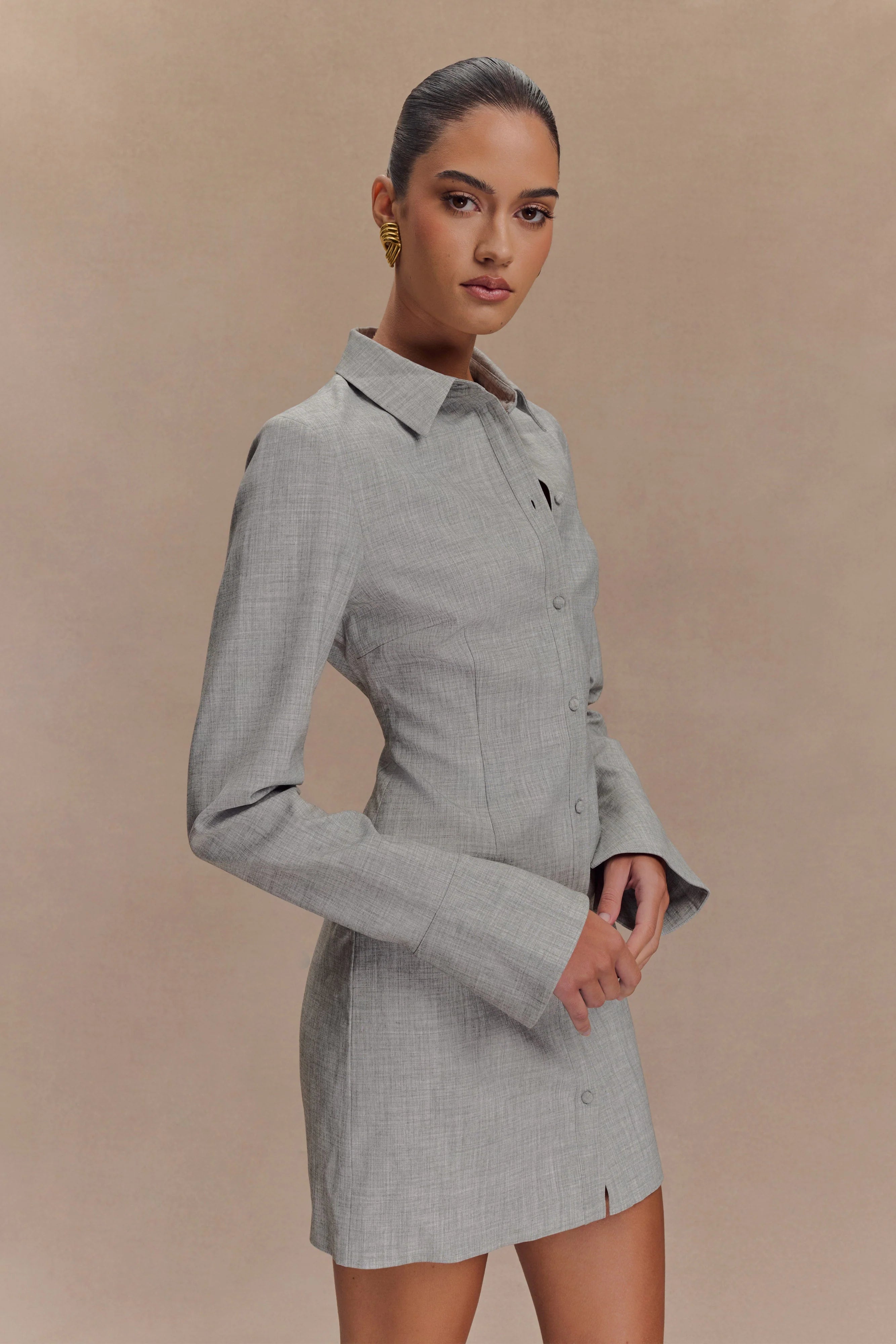 The DORIAN Fitted Shirt Mini Dress exudes timeless elegance with its classic design and sophisticated details. Featuring a collared neckline and a functional centre front button closure, this dress offers a tailored, polished look. The long sleeves with flared cuffs bring a modern edge, while the mini length adds a playful yet polished touch. A centre back vent ensures ease of movement, and the unlined construction offers a lightweight feel. This dress strikes the perfect balance between chic and sophisticated, making it ideal for both stylish nights out and elevated daytime events.