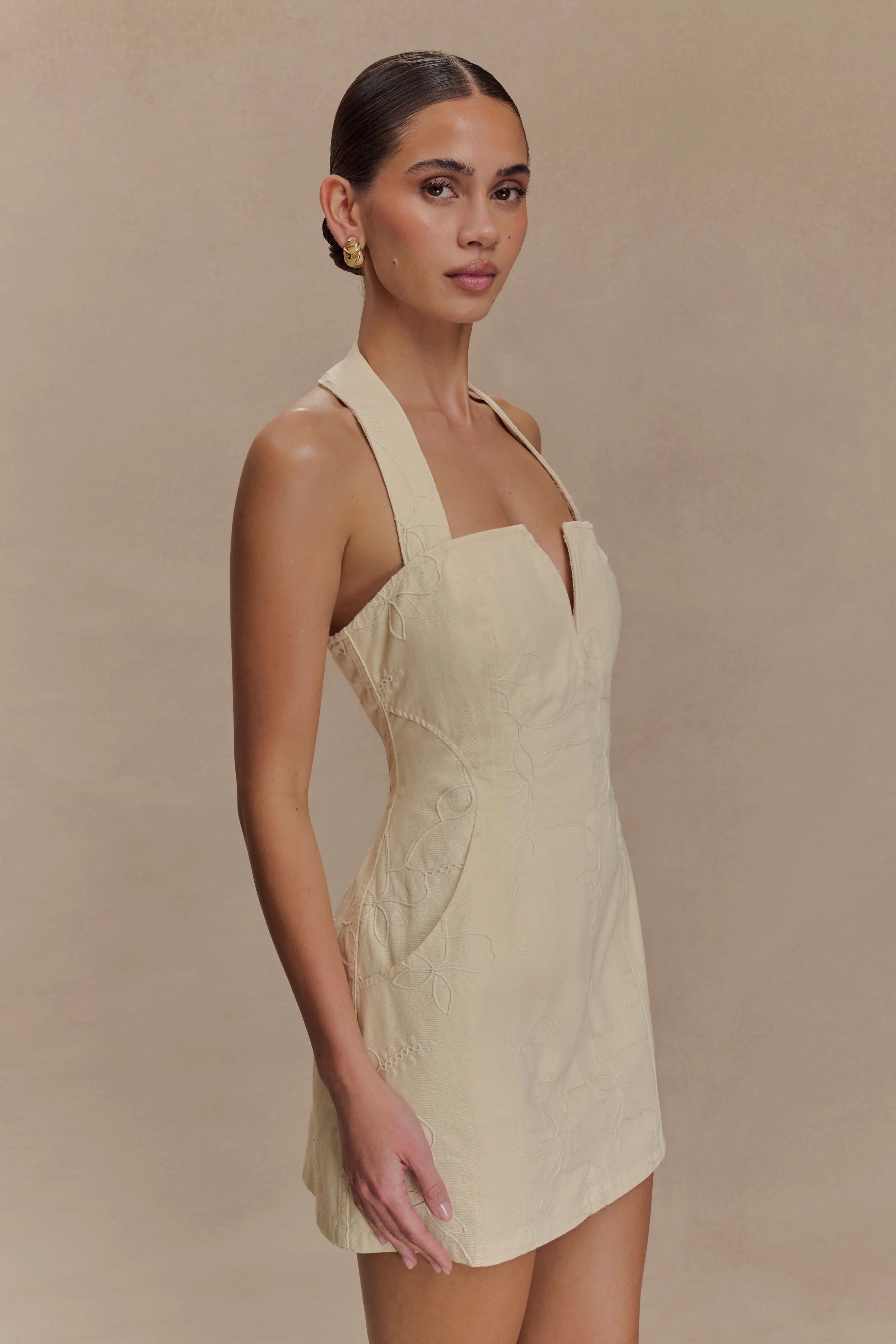 The EBONY Embroidered Denim Mini Dress is your new denim statement with a romantic twist. Crafted from embroidered denim fabrication, this mini features a halter neckline with a secure button closure and a flattering V-neck detail that frames the décolletage. Designed for a sculpted fit, it hugs the body in all the right places and finishes with a clean zip-back closure. A modern take on a classic silhouette, this dress brings texture and edge to your summer wardrobe.