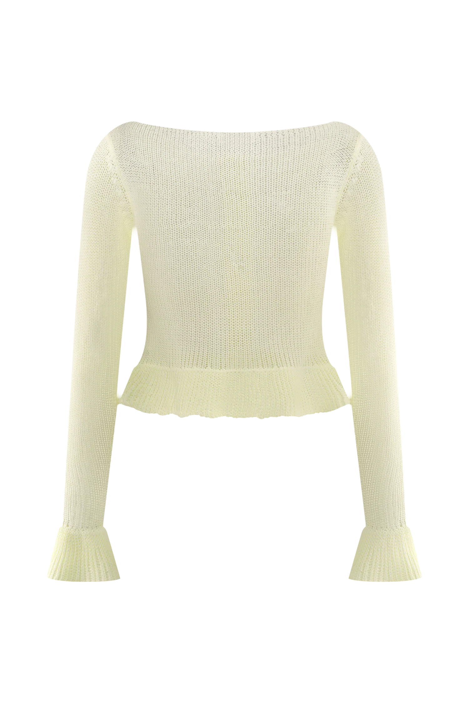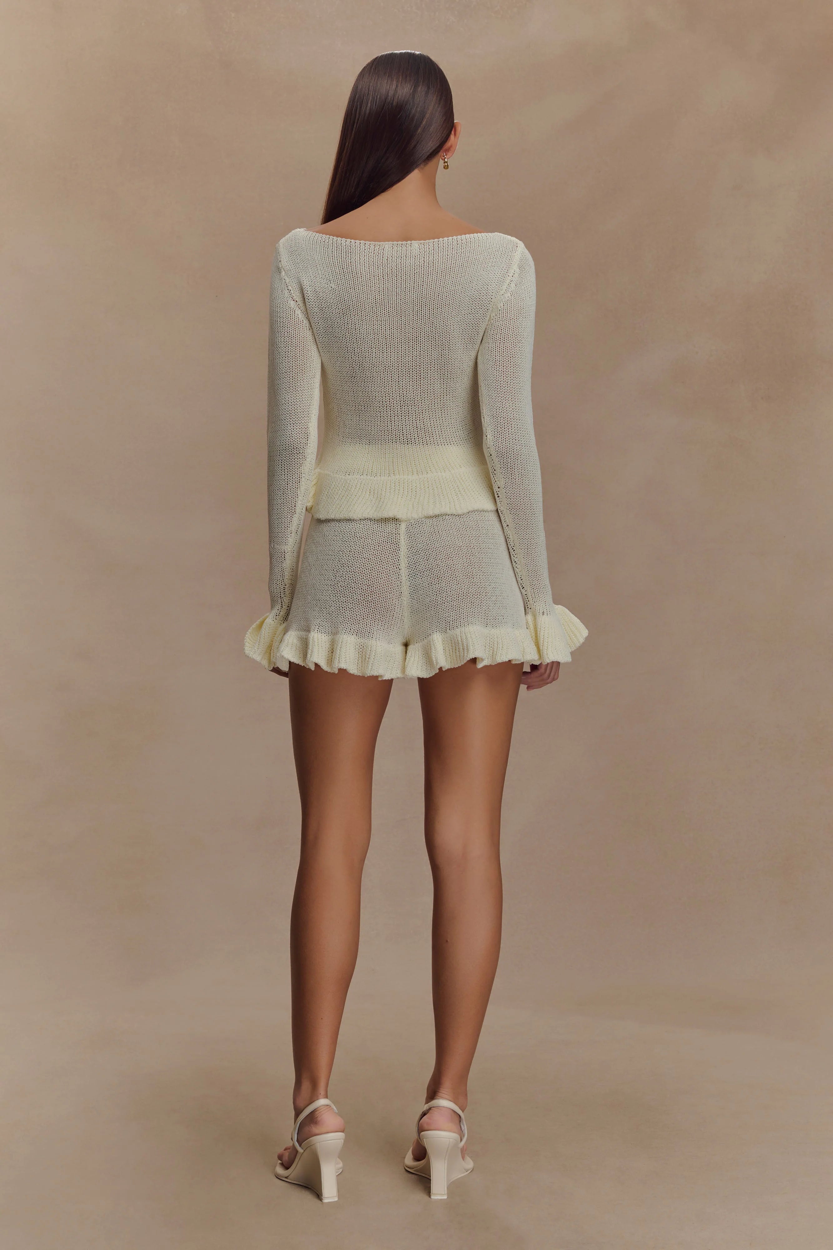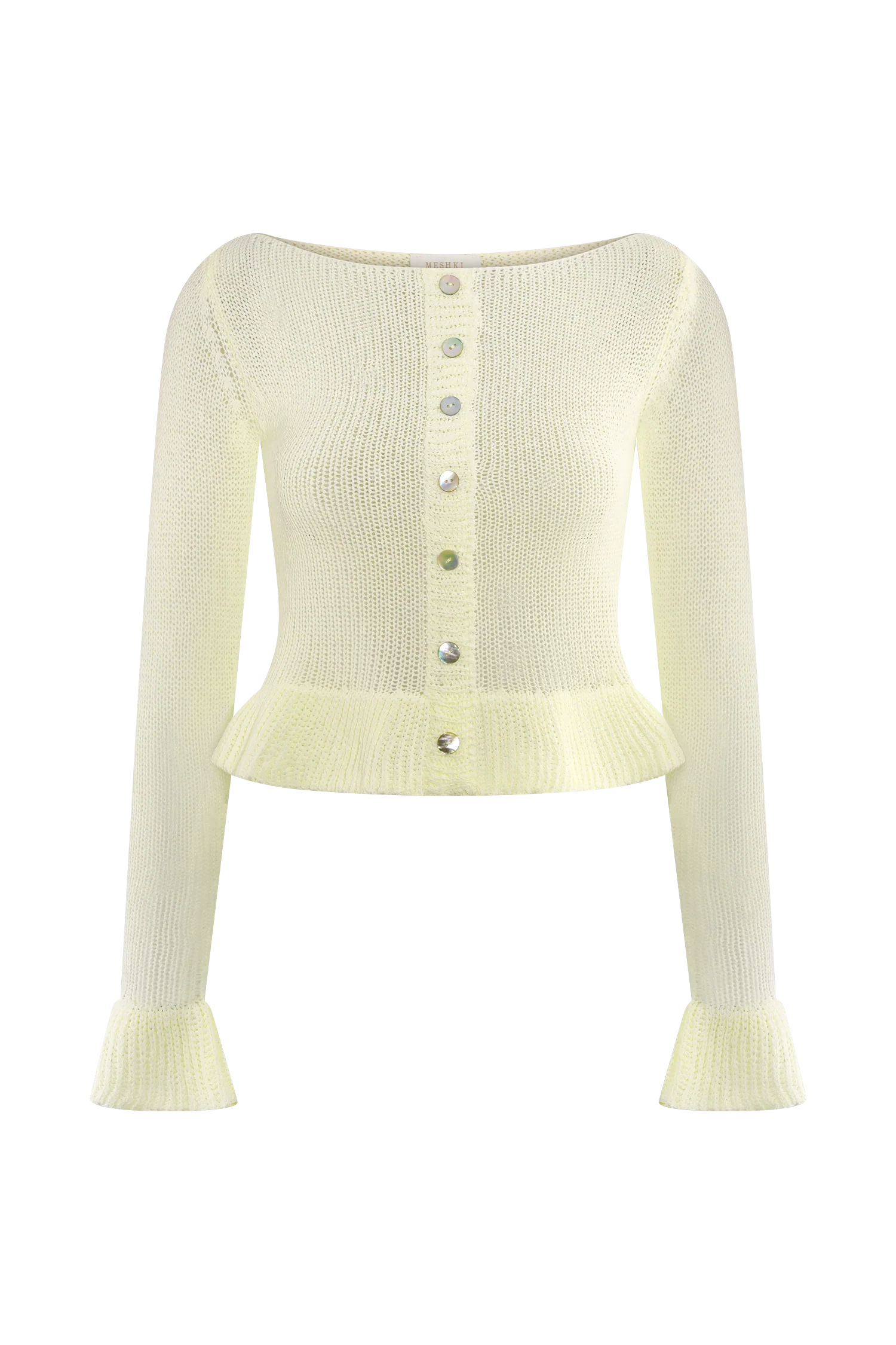 Add a touch of charm to your everyday life with the ELEANOR Knit Frill Cardigan, a playful piece with romantic detailing. Featuring a scoop neckline, delicate shell buttons, and ruffled hems at the sleeves and waist, this cardigan brings a feminine twist to classic knitwear. The non-functional front placket keeps the silhouette clean and polished, while the unlined finish offers lightweight comfort. Pair with the for a co-ord that’s equal parts cosy and chic.