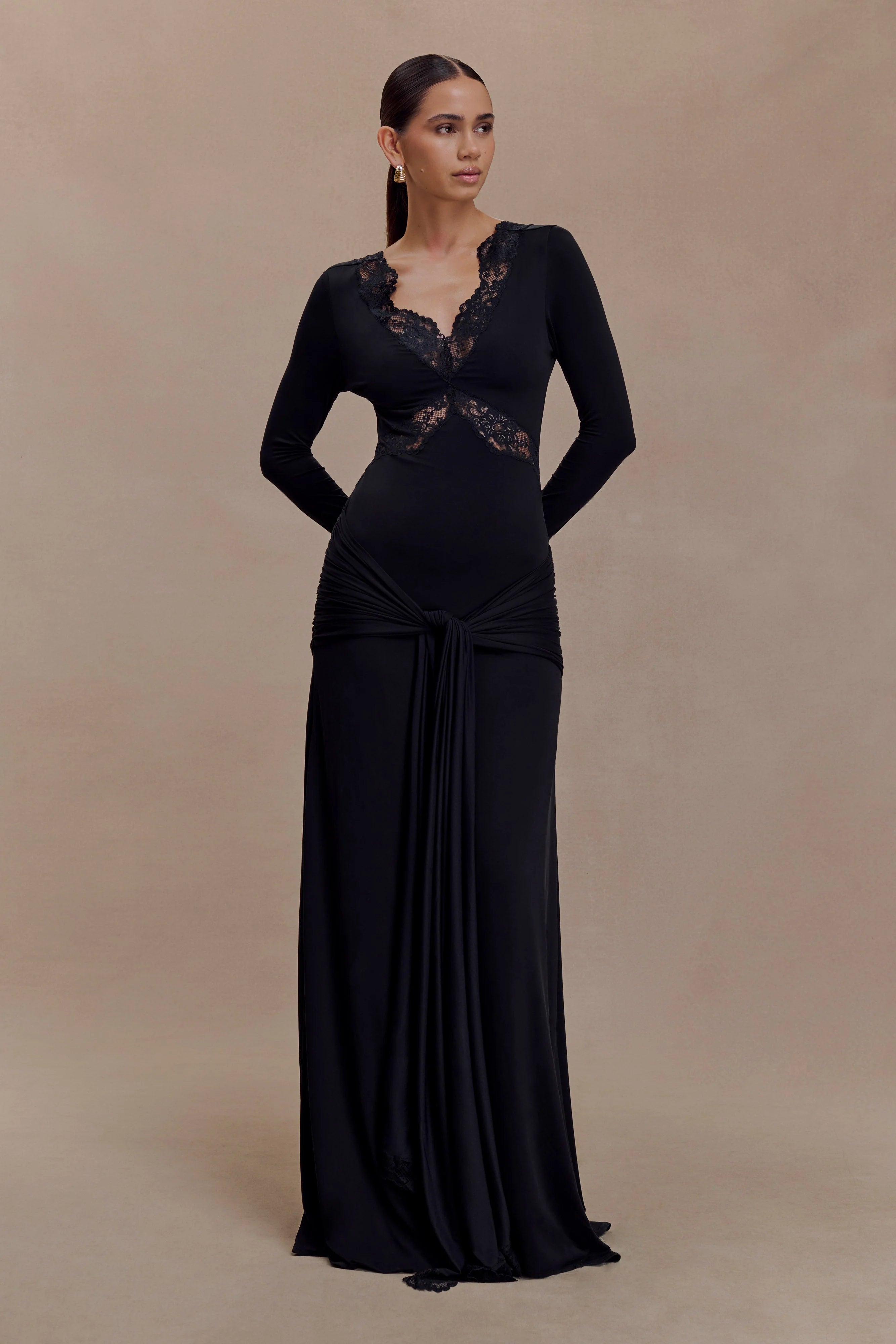 The ELECTRA Slinky Lace Maxi Dress blends sultry detail with fluid design. Featuring a deep V lace neckline and fitted silhouette, this dress hugs the body while lace cut-outs add delicate intrigue. A cascading front-side tie drape brings graceful movement, while flared layered sleeves evoke a sense of vintage romance. Partially lined for contrast and comfort, this dress is designed to turn heads—whether it’s a moonlit dinner or a statement-making soirée.