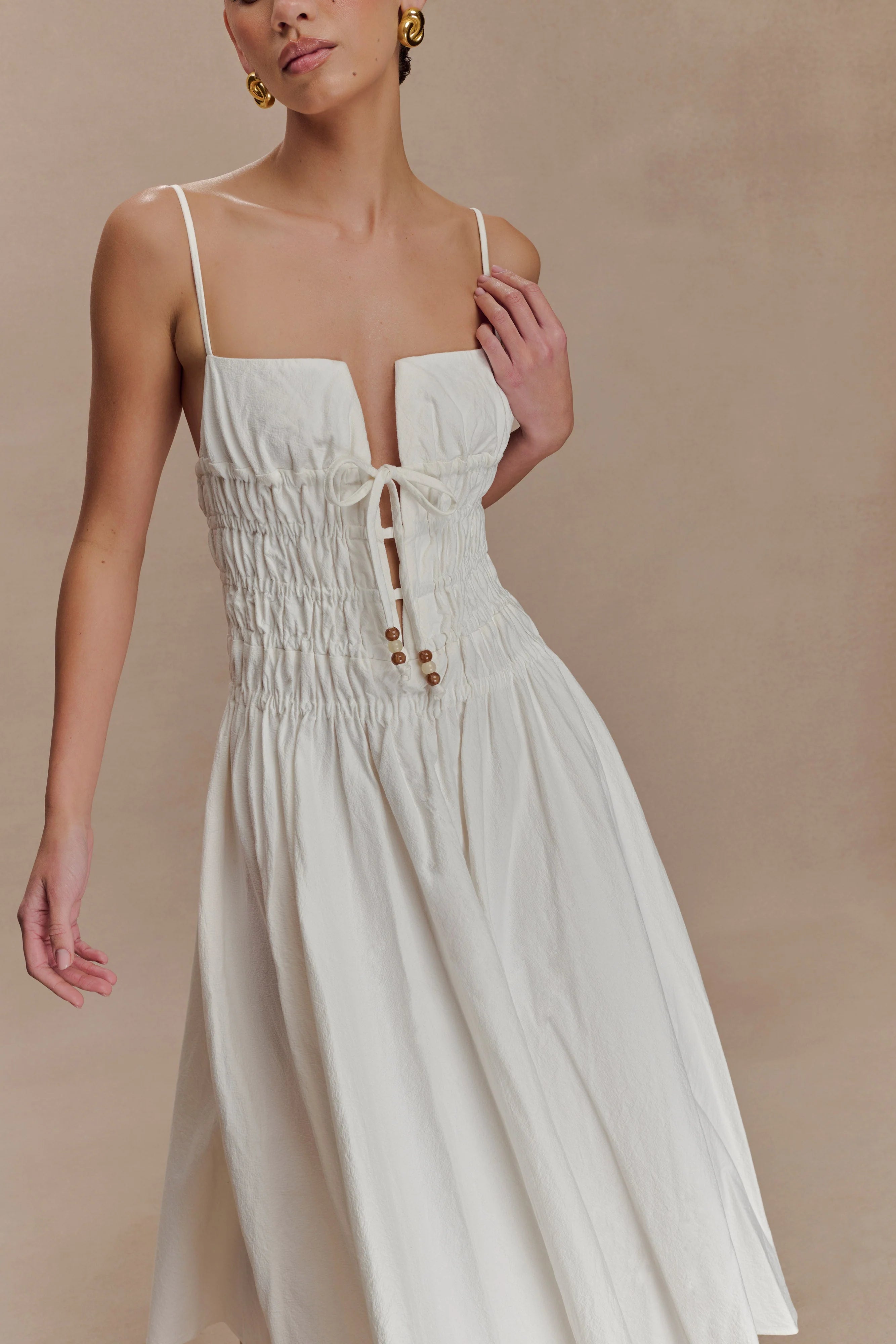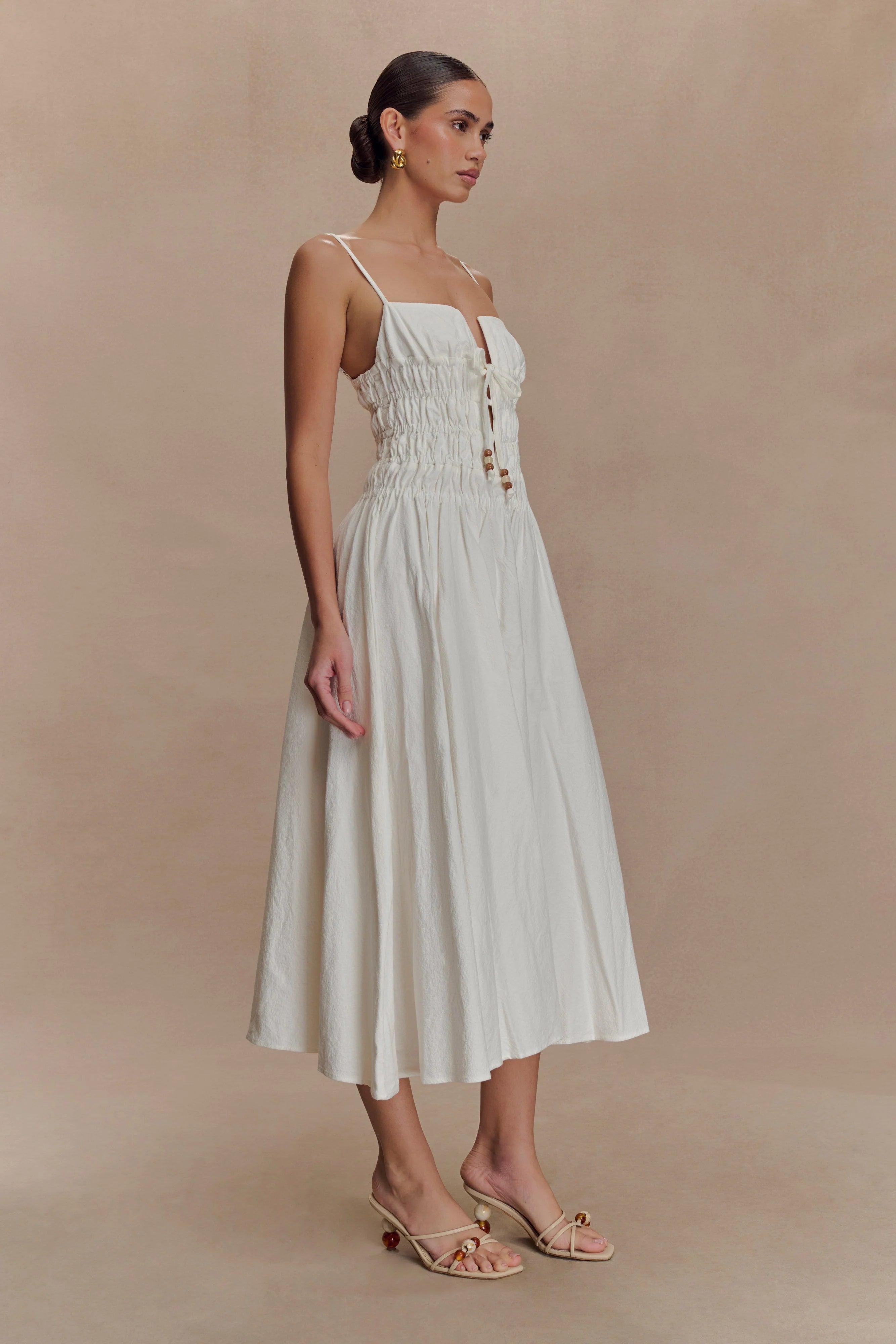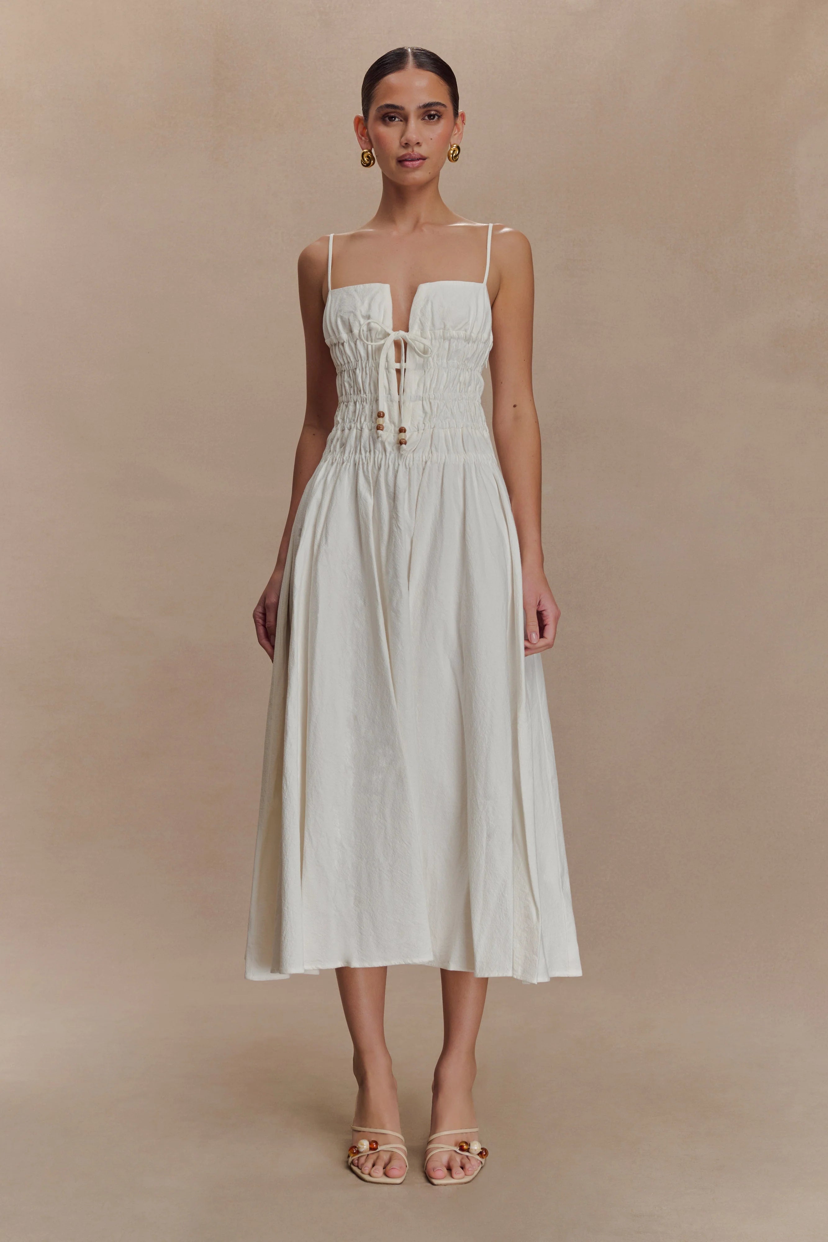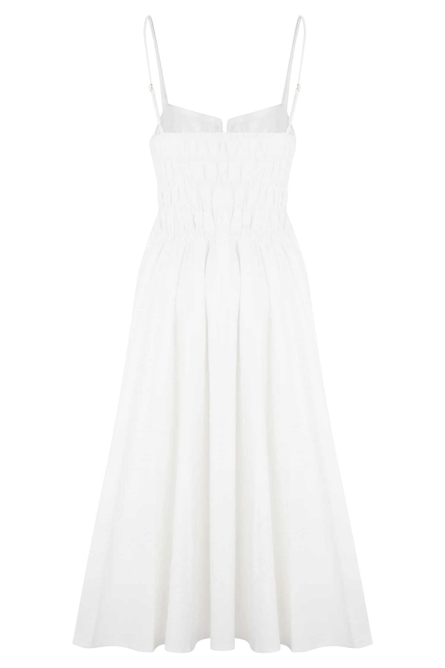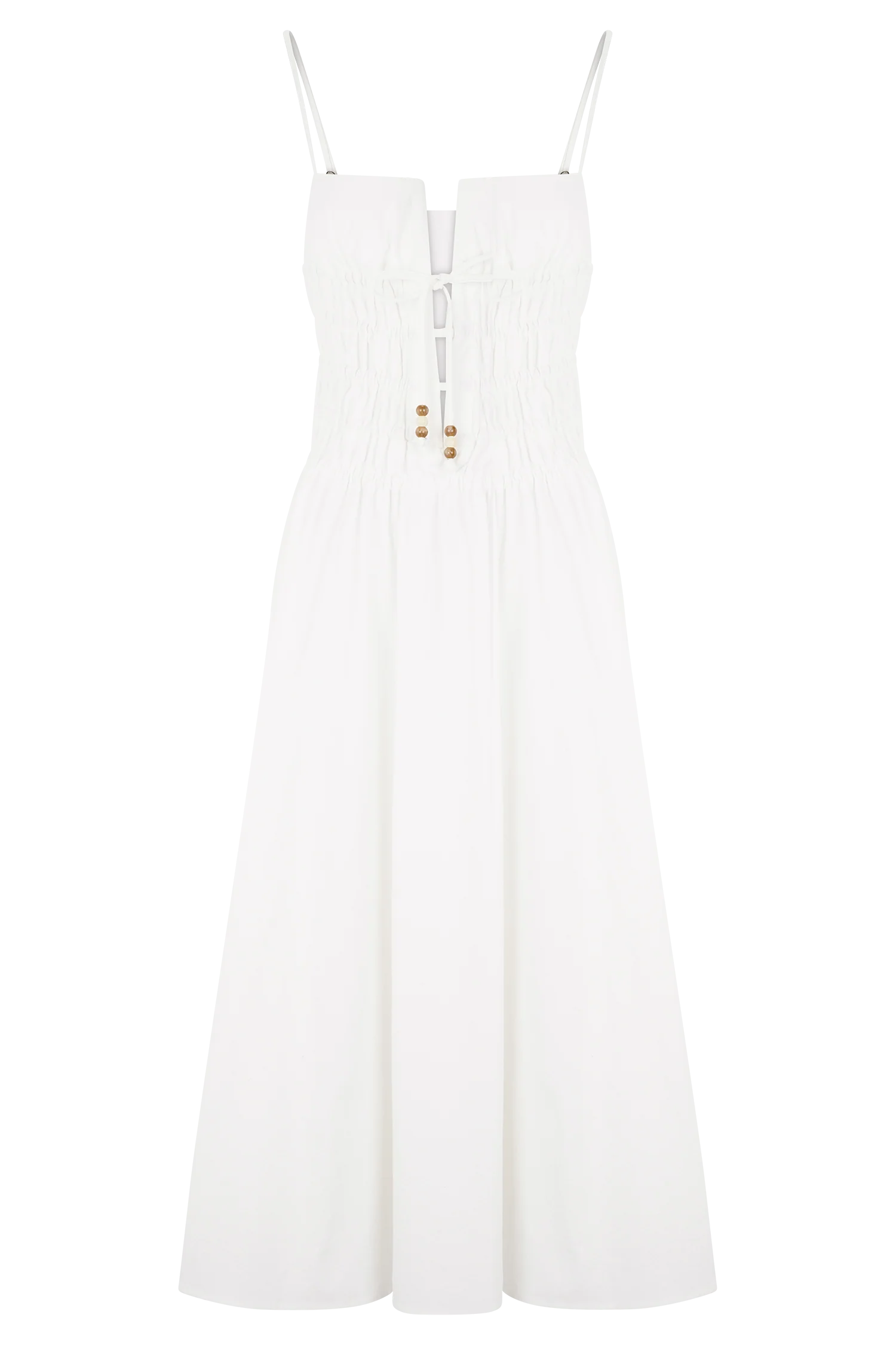 The ELIAS Shirred Cotton Midi Dress is a playful take on feminine summer styling. Crafted with a fully shirred bodice that sculpts and supports, this midi dress is detailed with delicate adjustable straps and contrast-beaded front ties for a touch of artisanal charm. An invisible side zip ensures a seamless fit, while the softly flared skirt offers ease and movement for warm-weather days. Fully lined for comfort, this dress brings effortless appeal to sun-drenched escapes and everyday elegance.