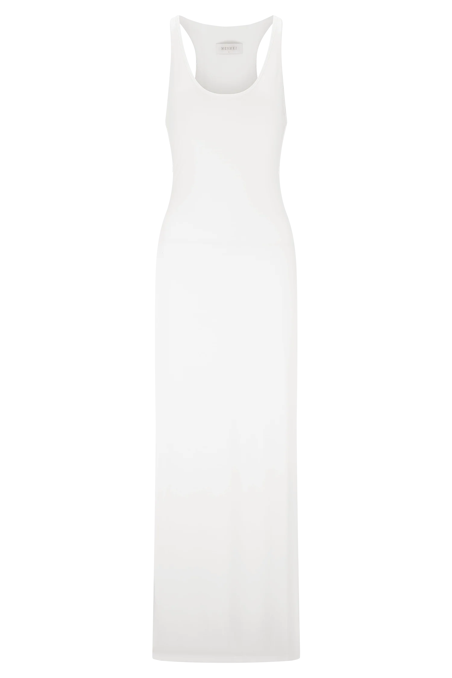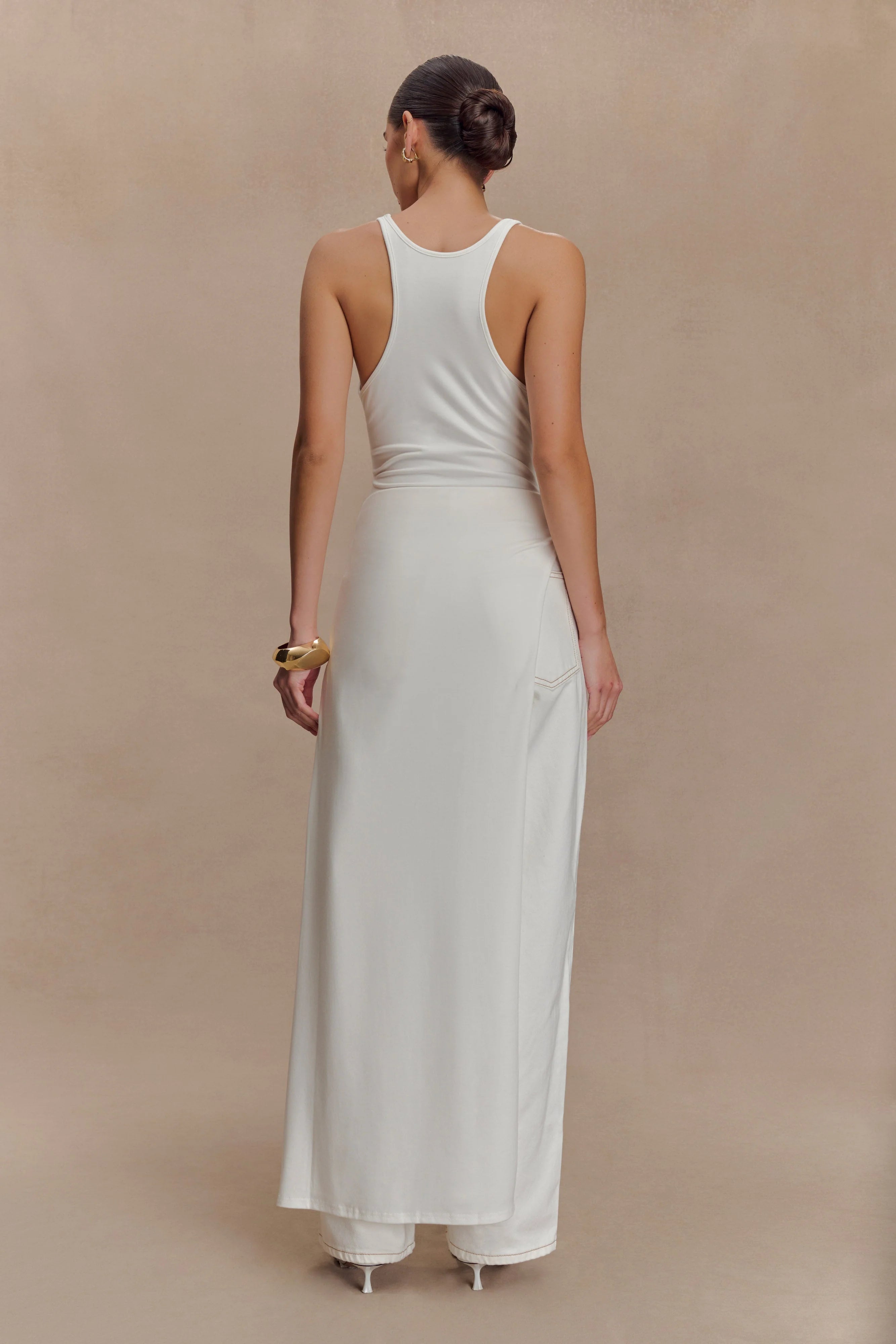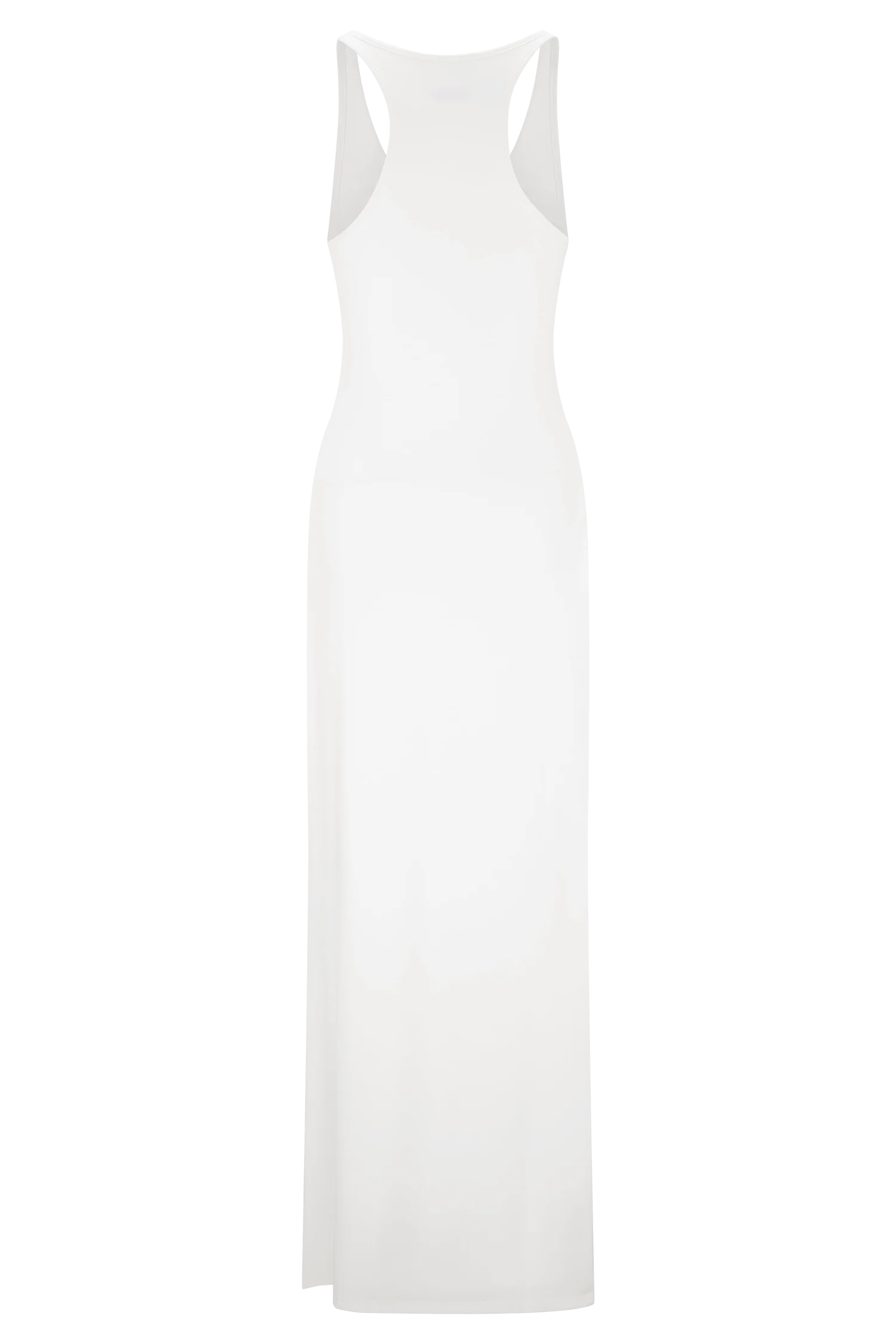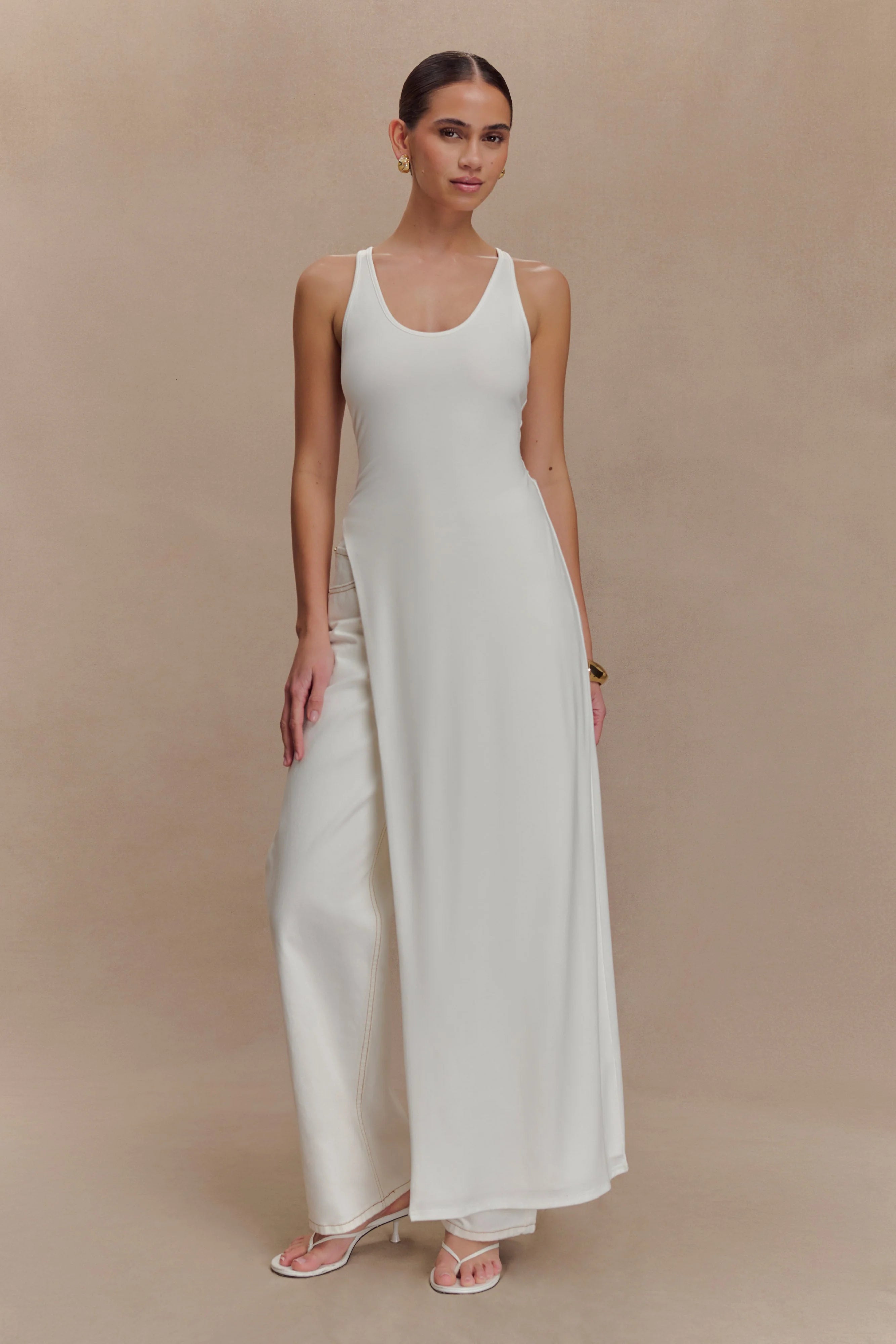 The ELLERIE Longline Racerback Top is a sleek staple designed to elevate everyday dressing. Featuring a scoop neckline and bold racerback silhouette, this bodycon top is cut with a longline hem and side split cut-out for added edge. Unlined and designed to contour, it’s perfect for layering or standing solo. Pair with denim, tailored trousers, or a matching mini for effortless impact.