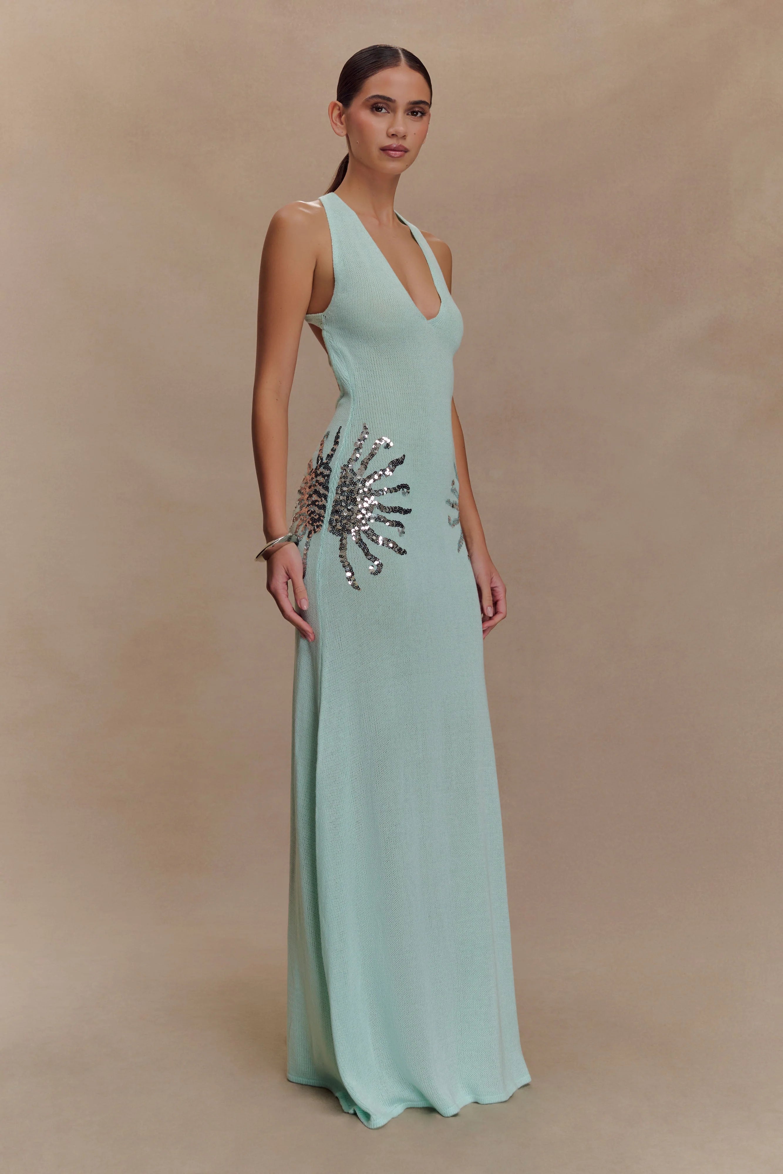The ELLINGTON Knit Maxi Dress with Sequin is a relaxed yet radiant silhouette designed for sun-drenched days and glowing evenings. Featuring a V neckline and crossover back straps, this open-back knit maxi drapes effortlessly over the body with a soft, unlined finish. A touch of sparkle comes through with sequin sunburst details at the hips, adding subtle shine to this easy, elevated piece. Perfect for holiday escapes, sunset dinners, or coastal strolls with a hint of glam.