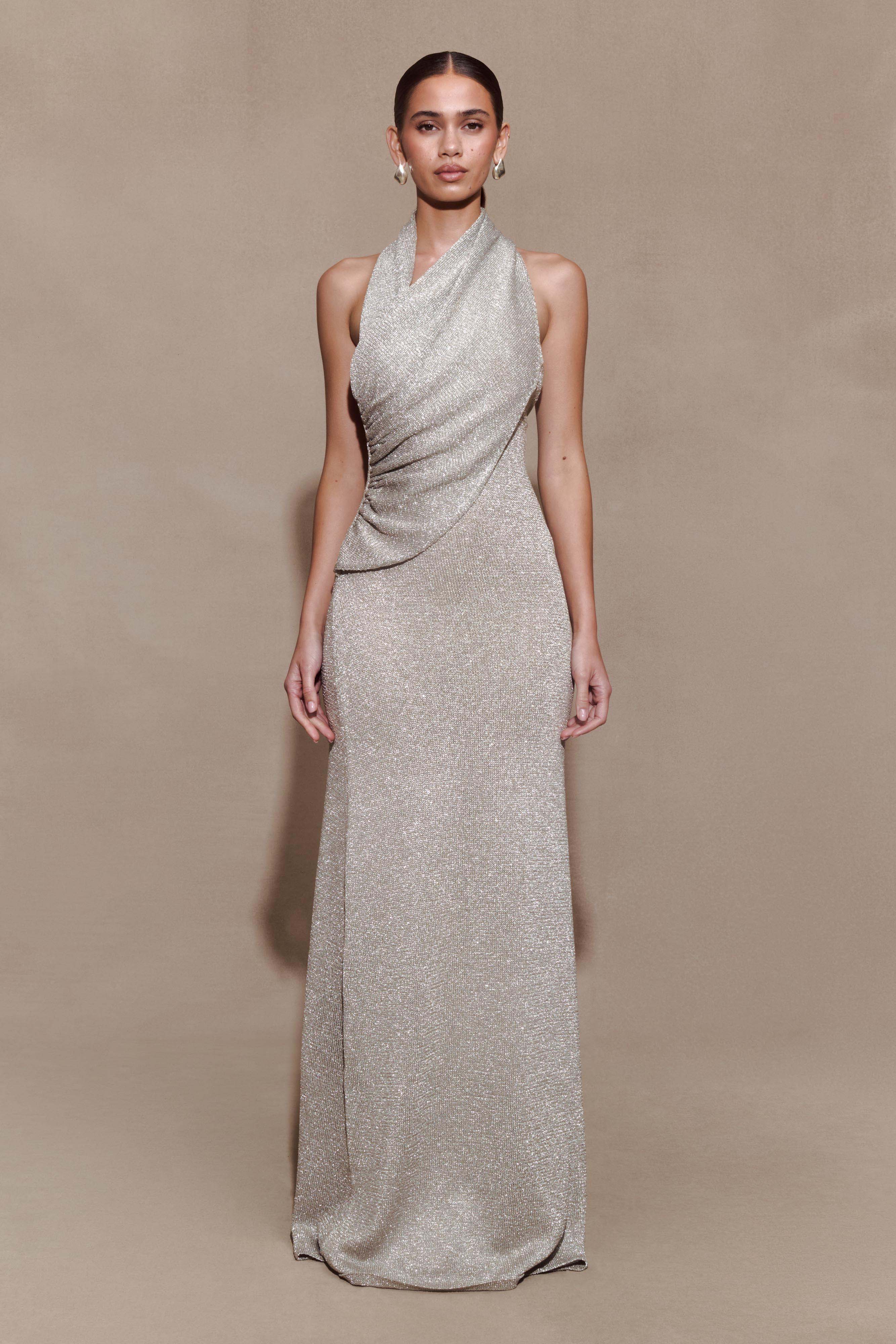 The ELMA Lurex Knit Halter Maxi Dress captures sleek allure through its fluid form and subtle shimmer. Designed with an asymmetrical halter neckline and open back, it frames the shoulders with sculptural ease. Draped gathering at the waist creates a flattering silhouette, while the lurex knit fabrication catches the light in tones of plum and silver. Cut to a maxi length and left unlined for a natural drape, this dress is the epitome of effortless evening glamour.