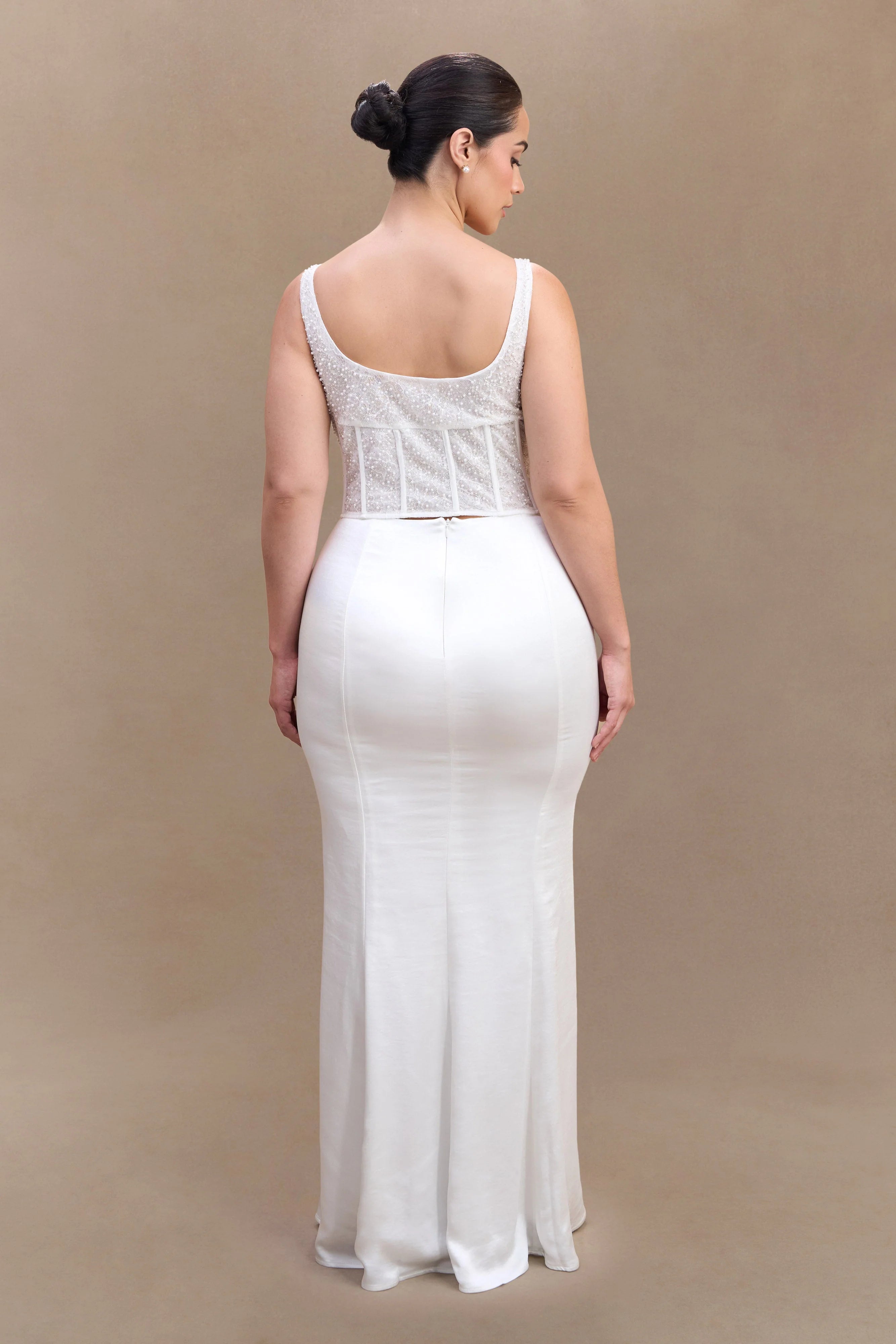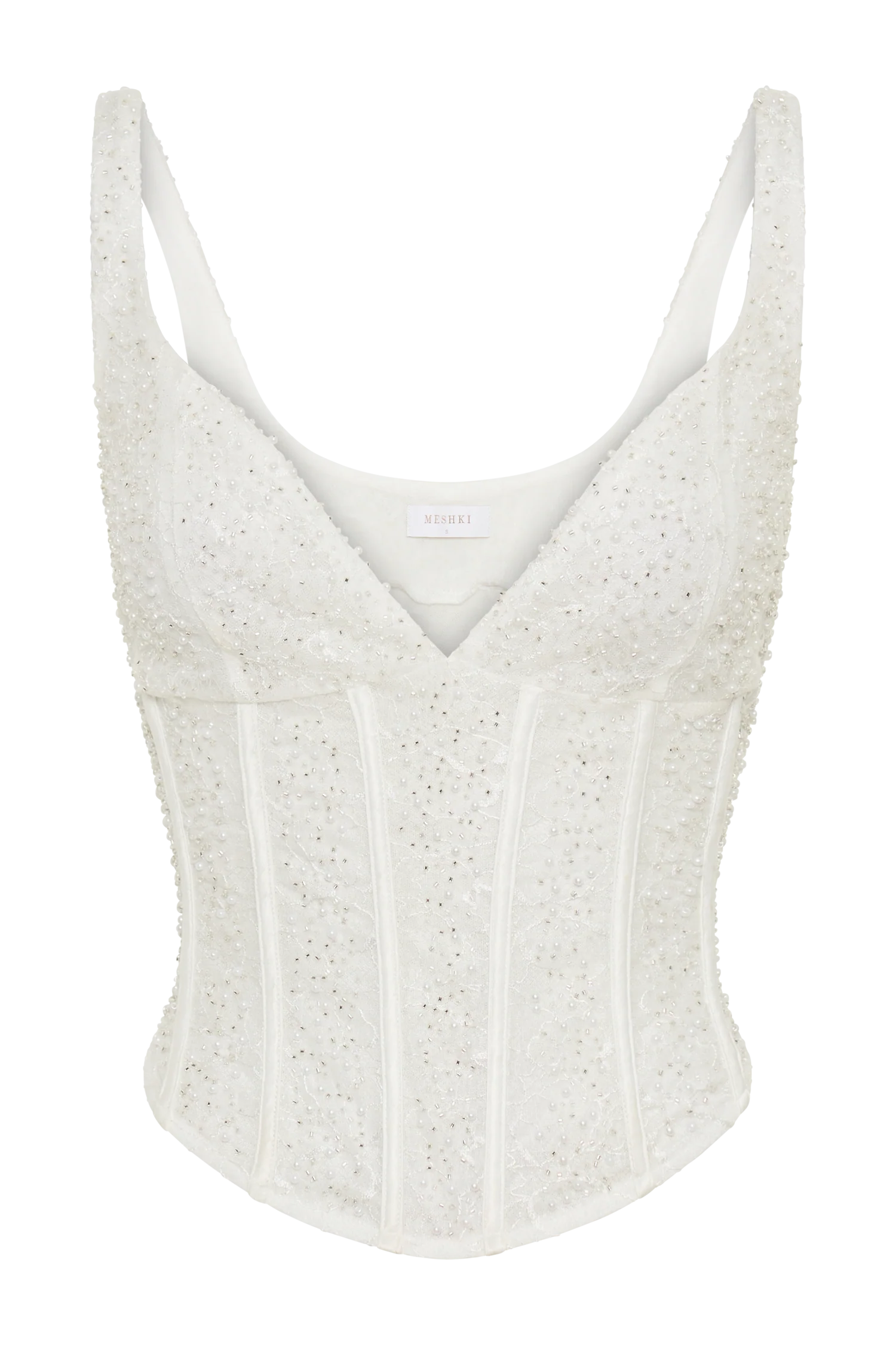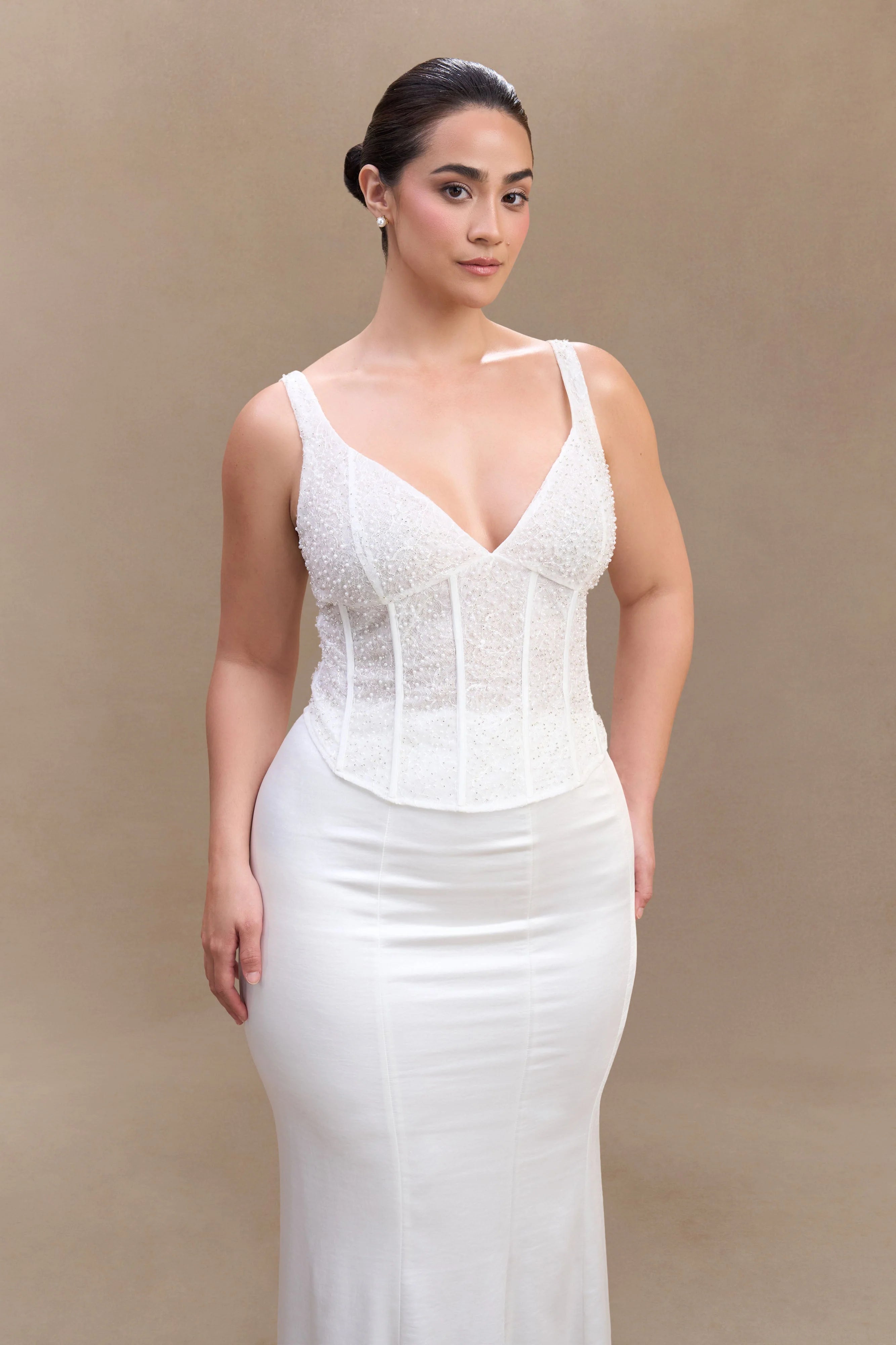 Elevate your ensemble with the ELSIE Pearl Beaded Bustier Top, a symbol of timeless sophistication and allure. Boasting a flattering V neckline and custom cups, this top offers both style and support. Structured with boning, it ensures a polished silhouette, while the scooped back adds a hint of glamour. Designed with a shaped waist to enhance your curves and featuring a convenient side zip for effortless wear, the Elsie top is a must-have addition to your wardrobe.