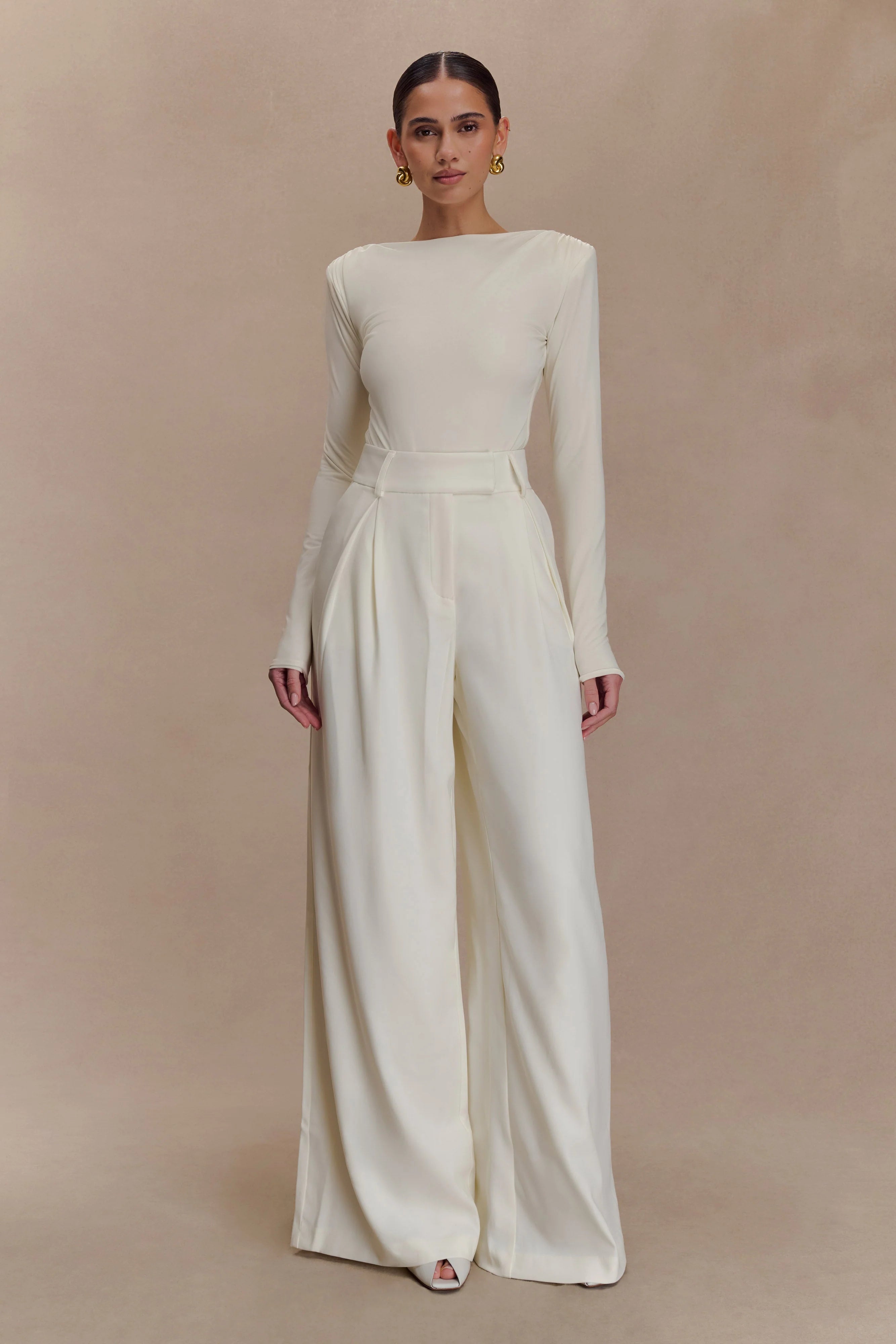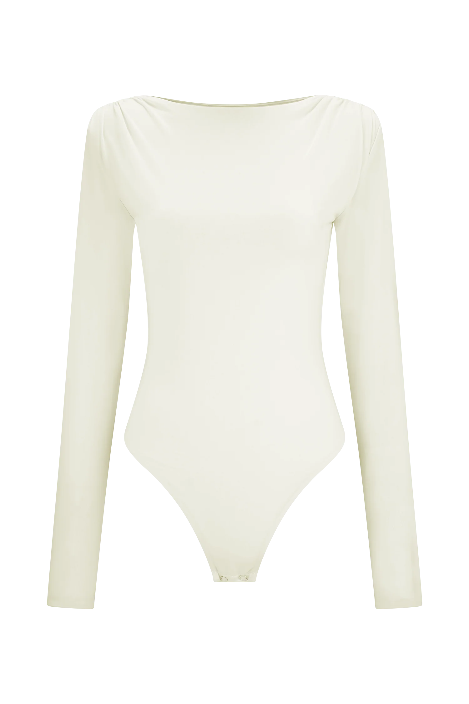 The ELSIE Shoulder Pad Bodysuit is a refined staple with a structured twist. Featuring a clean boat neckline and sharp shoulder pads, this design delivers a powerful silhouette while maintaining everyday versatility. The long sleeves and high leg cut balance coverage with a flattering edge, and the snap button gusset ensures seamless wear. Partially lined for a smooth fit, this bodysuit is the ultimate base layer for sleek tailoring or statement separates.