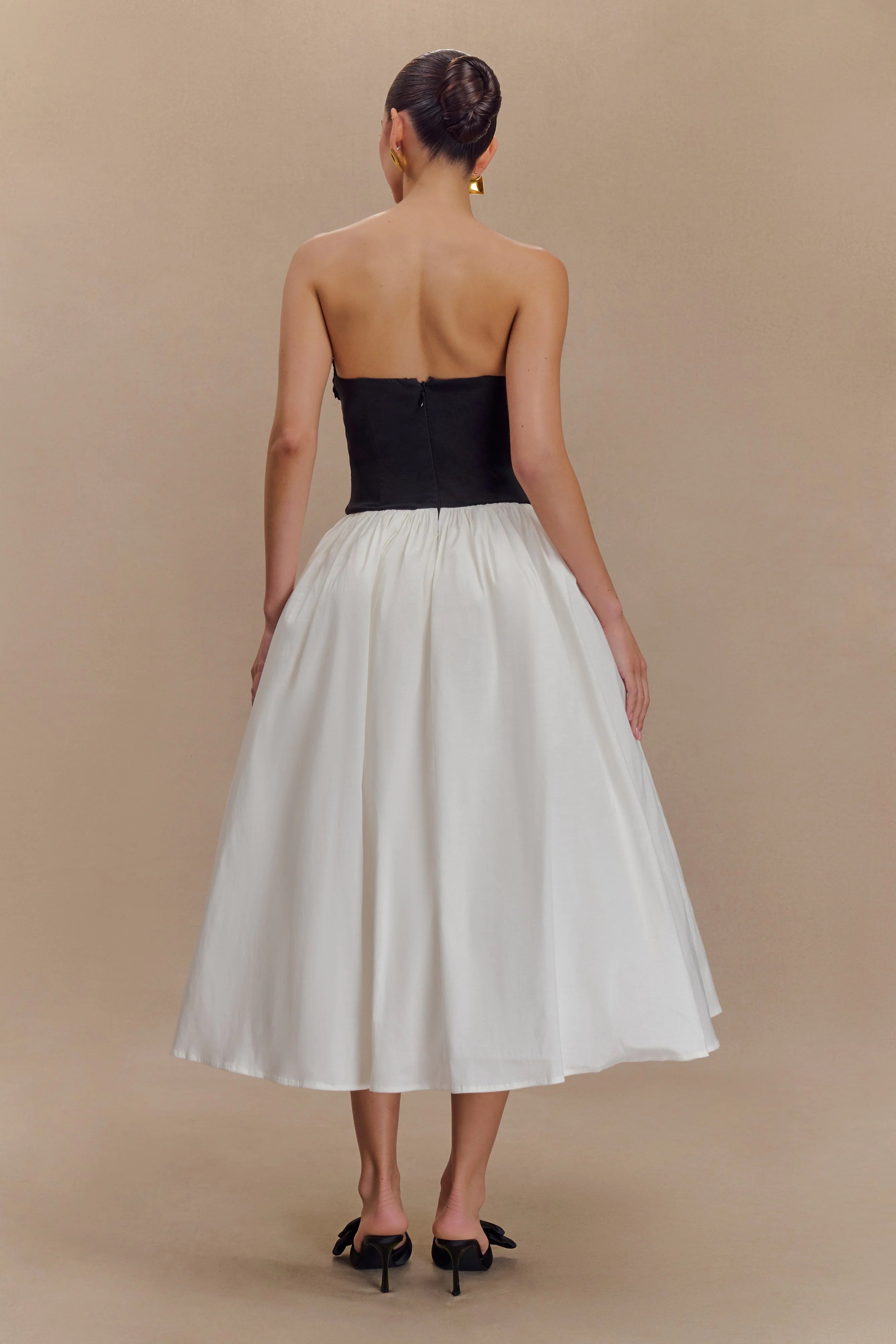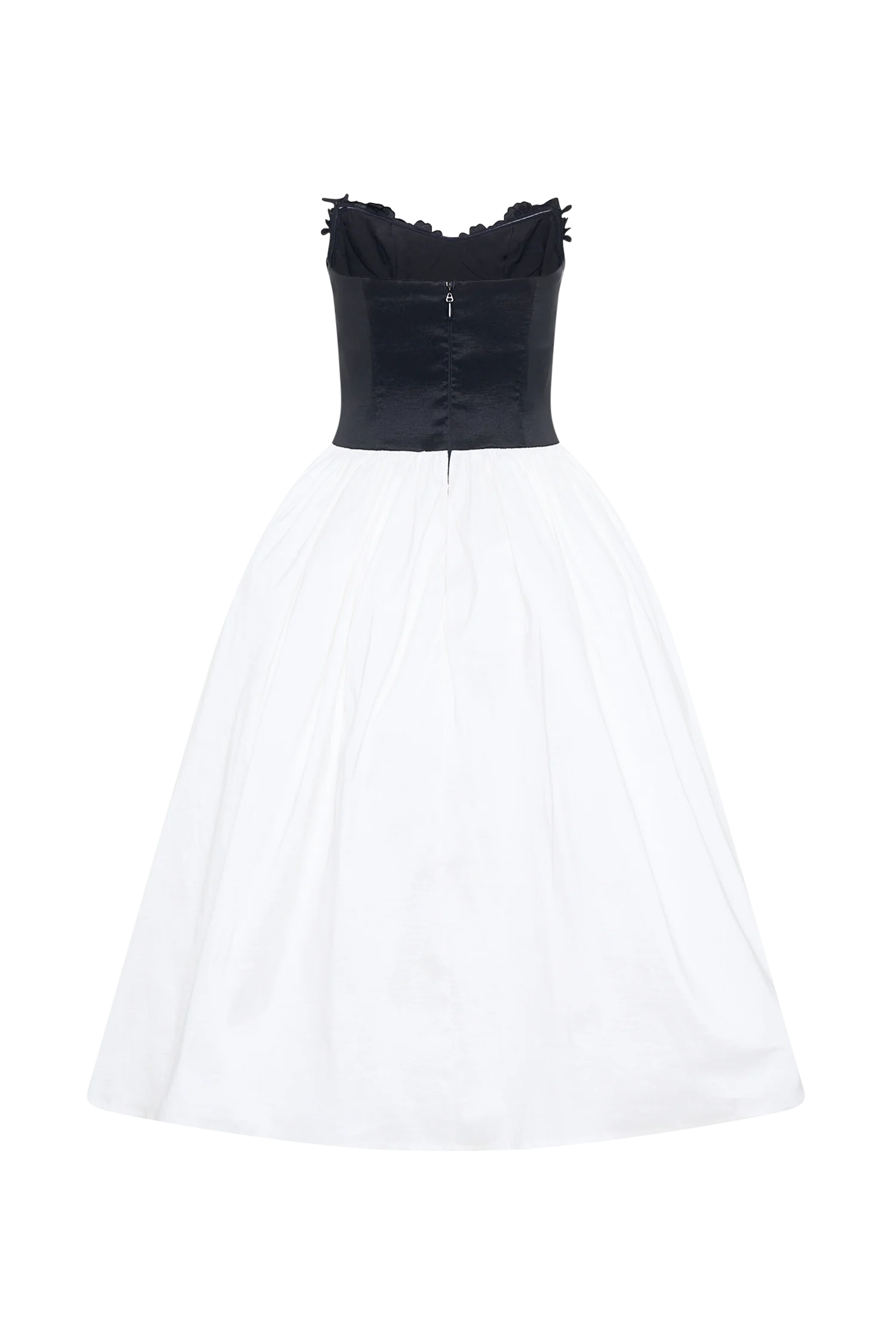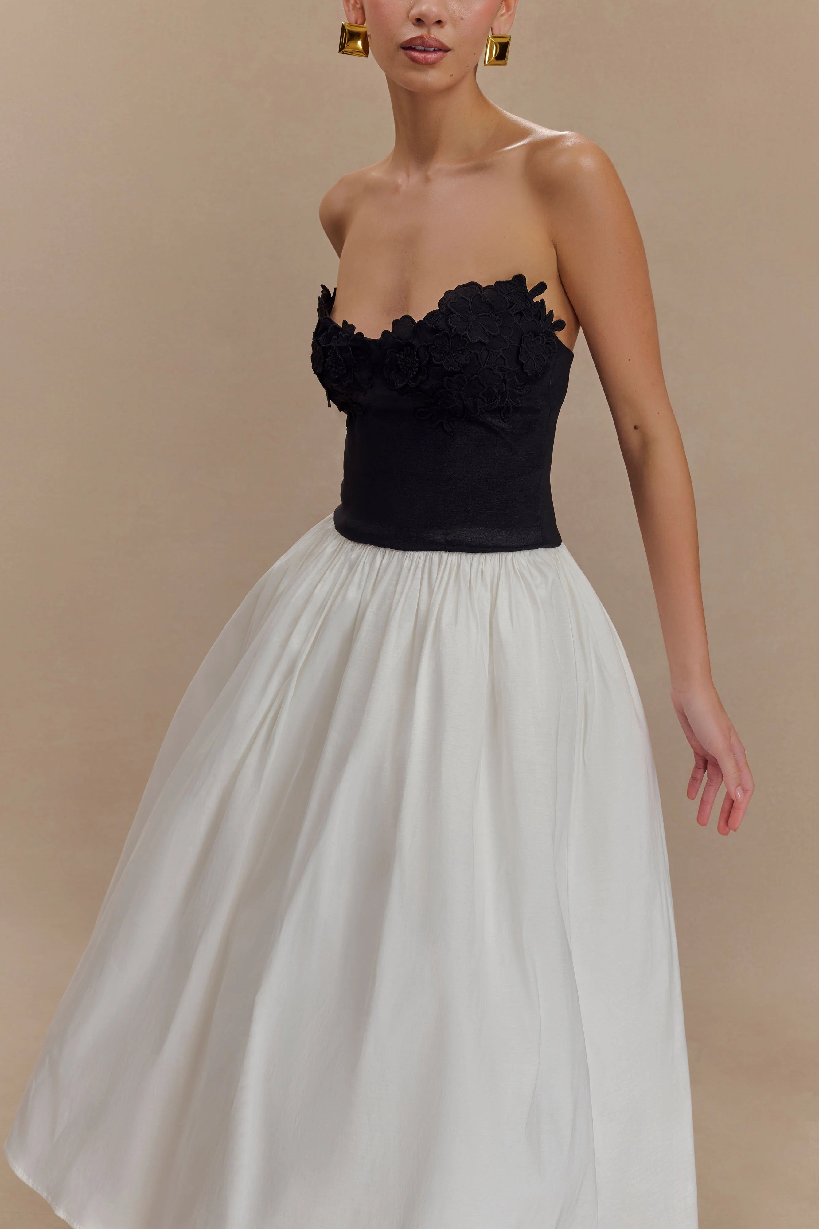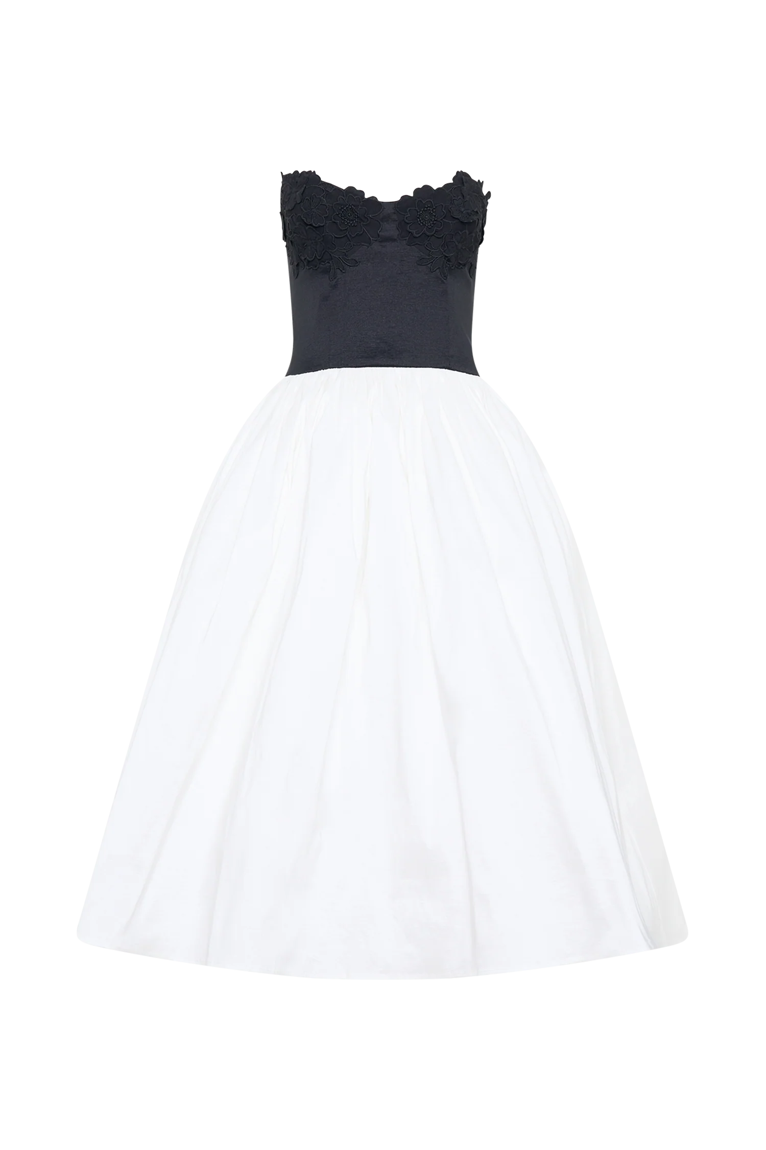 The ELYSSA Embroidered Midi Dress combines timeless elegance with modern sophistication. Featuring a fitted bodice and strapless design, it offers a sleek, flattering silhouette enhanced by delicate lace detail on the bust cups. The drop waist flows into a gathered full skirt, creating a beautifully structured shape that moves with grace. With its midi length and centre back zip for easy dressing, this dress is the perfect choice for any formal event or special occasion, effortlessly blending classic style with contemporary charm.