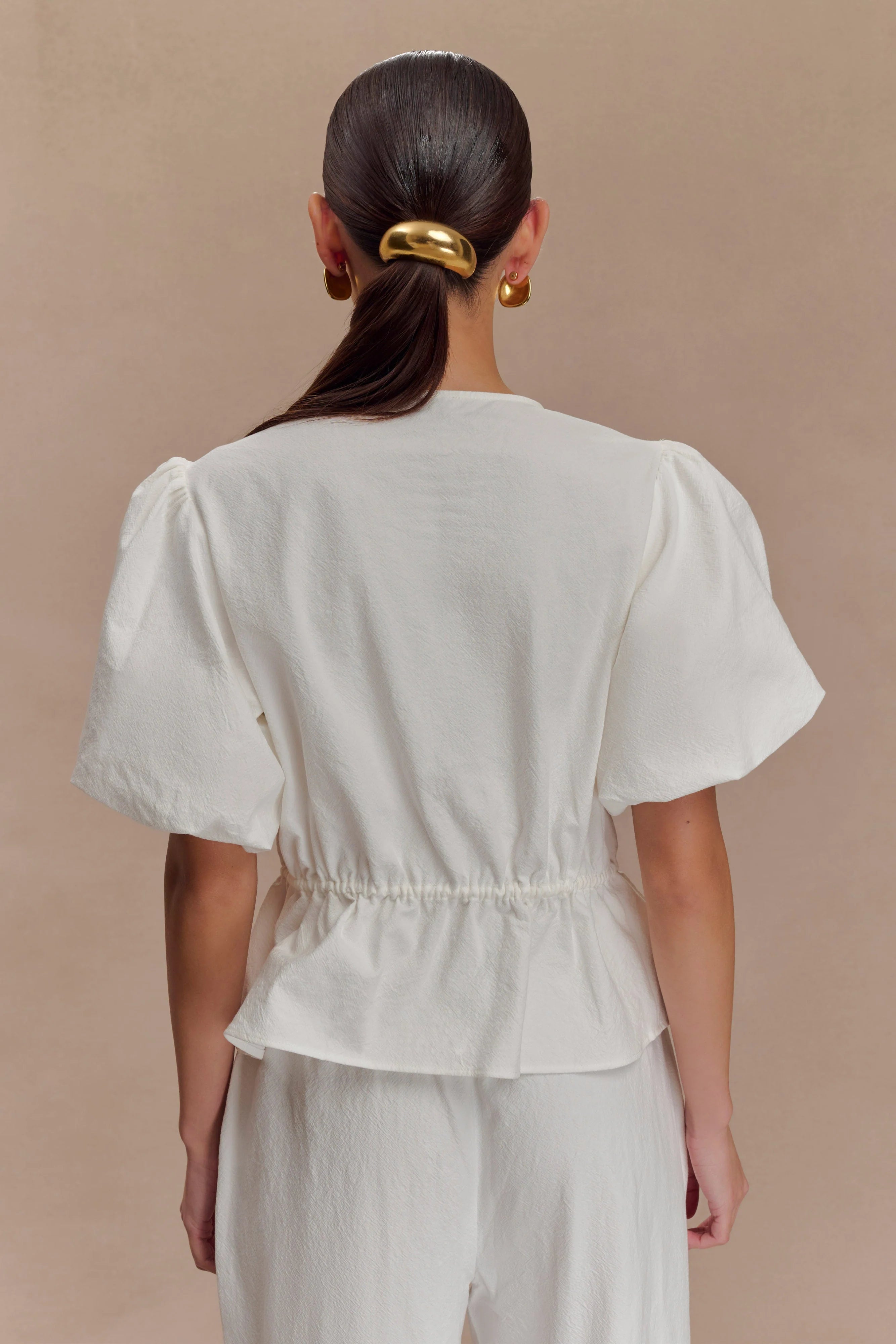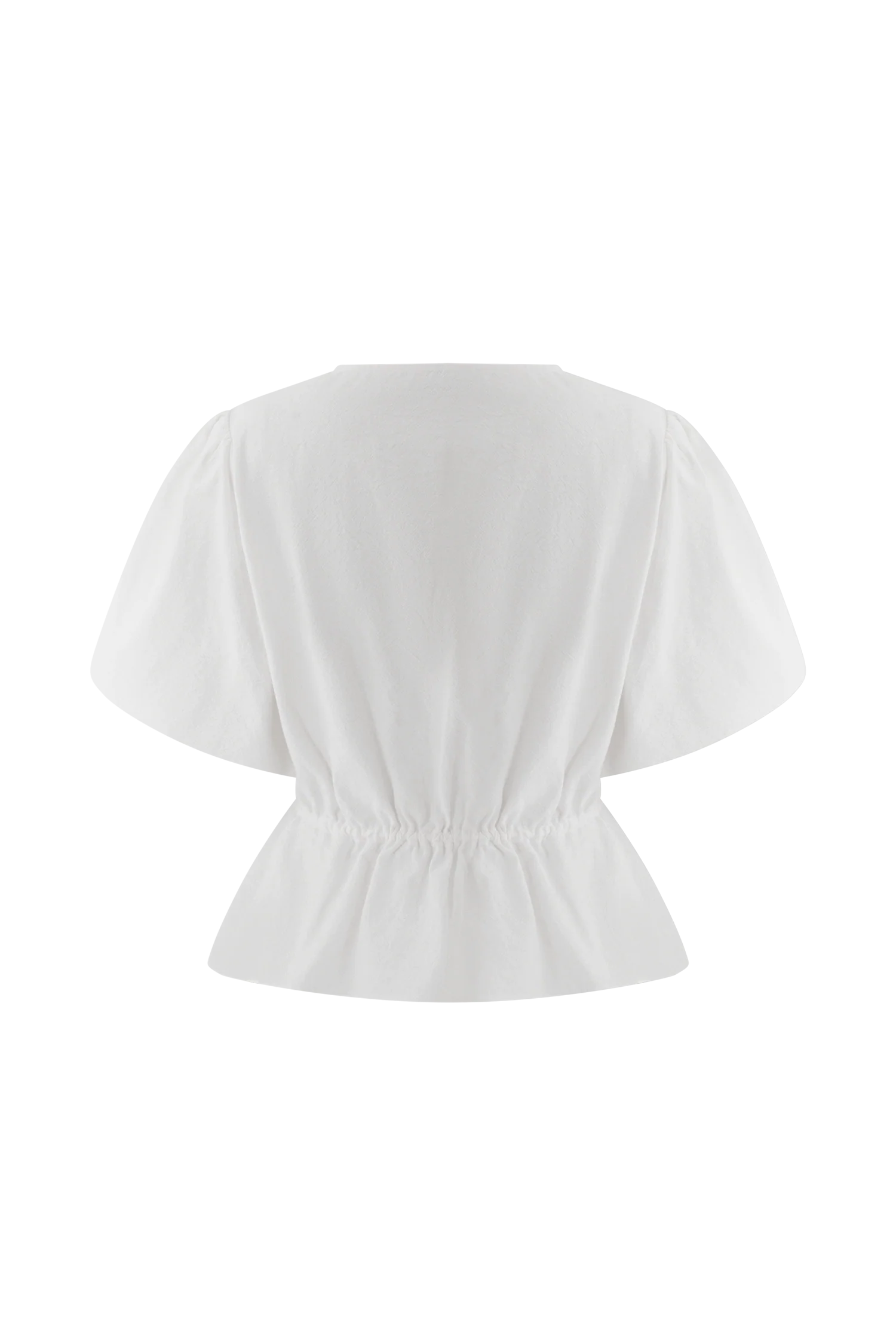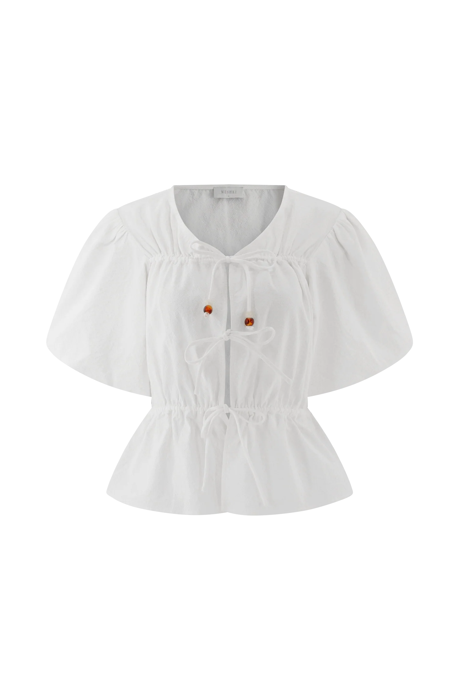The EMILIE Puff Sleeve Cotton Top is a romantic take on warm-weather dressing. Featuring voluminous puff sleeves with elasticated hems and a feminine peplum silhouette, this cotton top ties at the front with a beaded bow detail for a touch of texture and whimsy. Perfect for sunny days, picnics, or weekend escapes, this top pairs effortlessly with high-waisted denim or flowy skirts for a soft, structured finish.