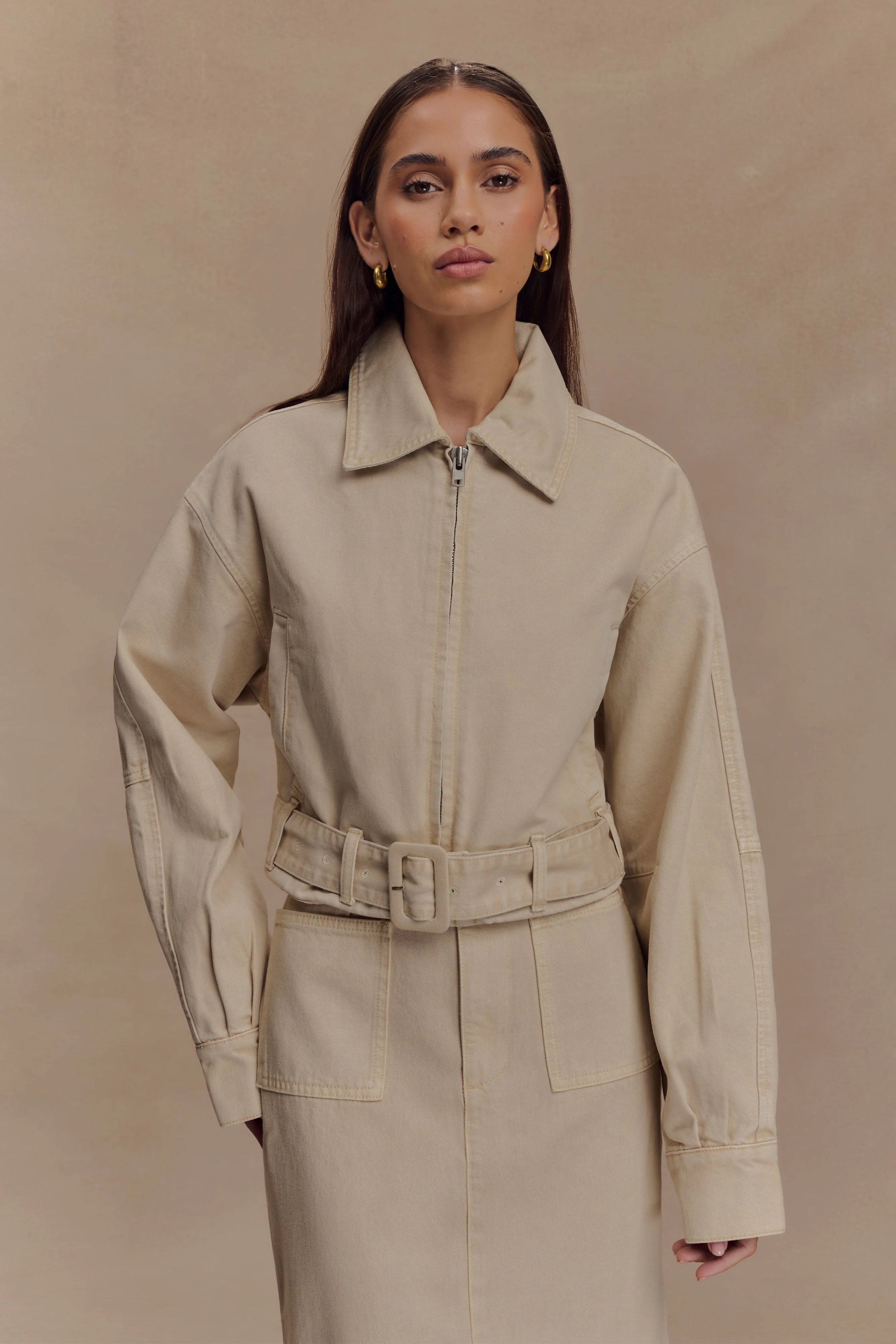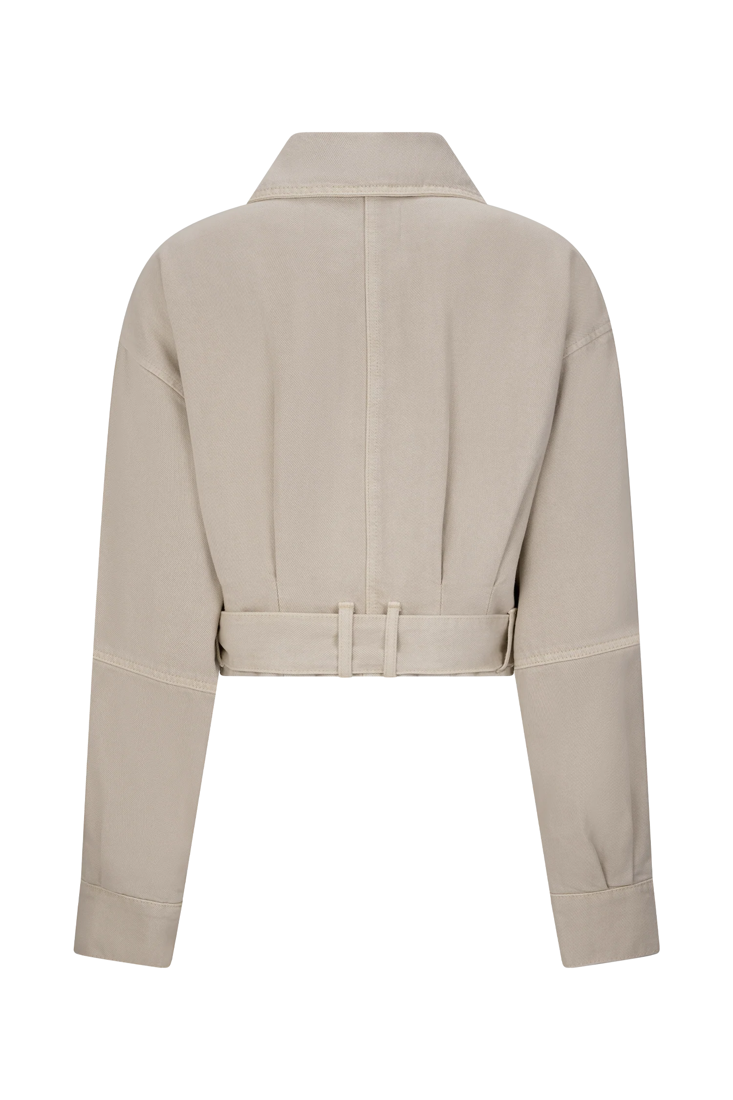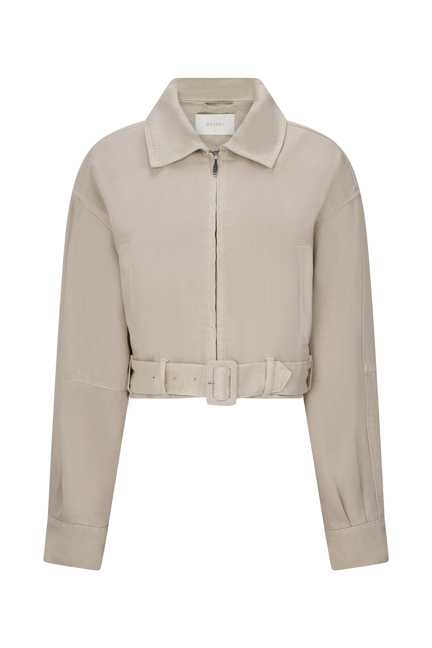 The FALLON Cropped Denim Jacket is your go-to layering piece with a fresh edge. Featuring a collared neckline, front zip opening, and long sleeves, this unlined jacket is elevated by a waist belt and buckle with functional belt loops for a cinched silhouette. A slightly gathered hem adds a soft touch to its structured shape, making it the perfect blend of utility and style. Pair with the for a coordinated denim look that’s effortlessly modern.