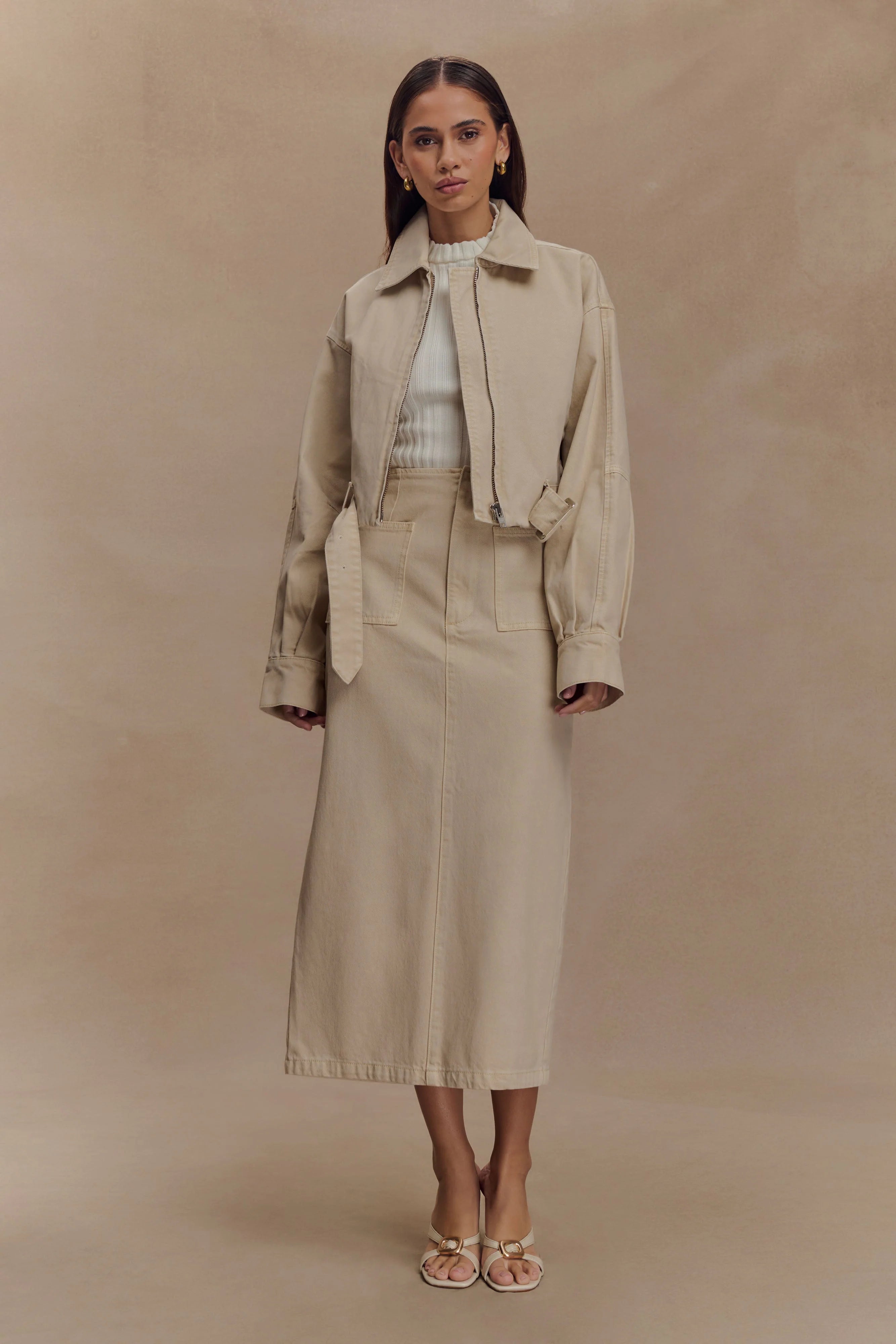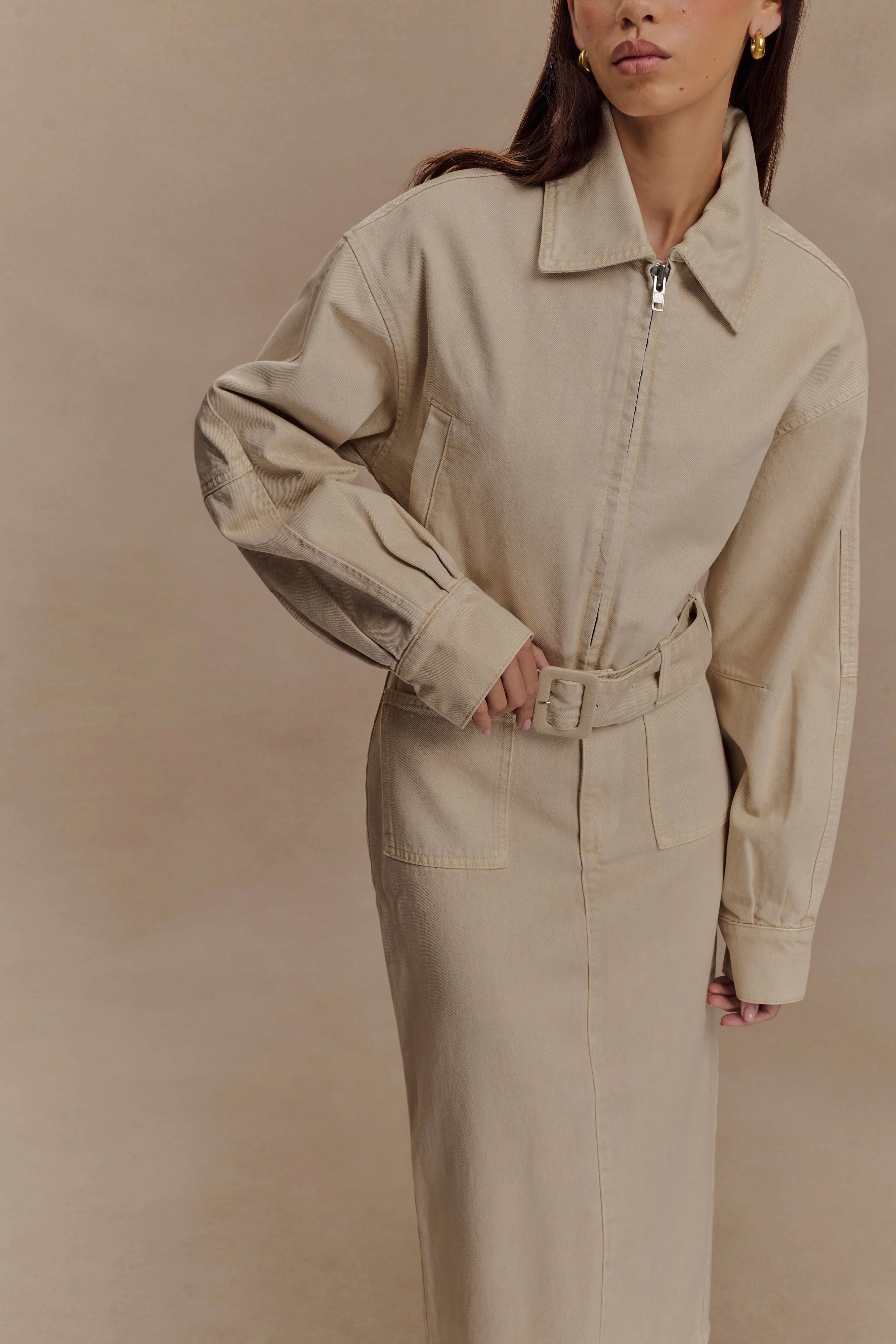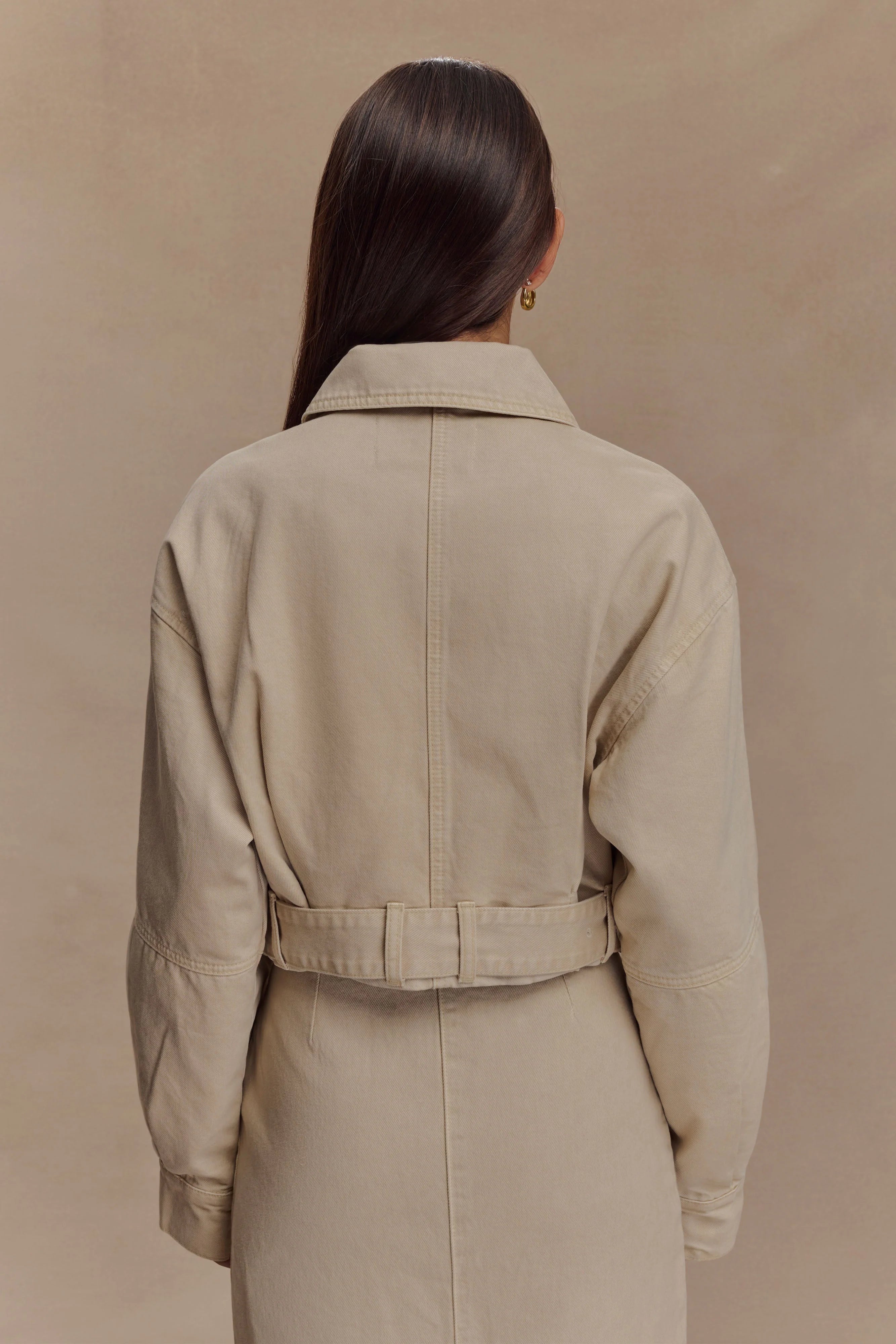 The FALLON Cropped Denim Jacket is your go-to layering piece with a fresh edge. Featuring a collared neckline, front zip opening, and long sleeves, this unlined jacket is elevated by a waist belt and buckle with functional belt loops for a cinched silhouette. A slightly gathered hem adds a soft touch to its structured shape, making it the perfect blend of utility and style. Pair with the for a coordinated denim look that’s effortlessly modern.