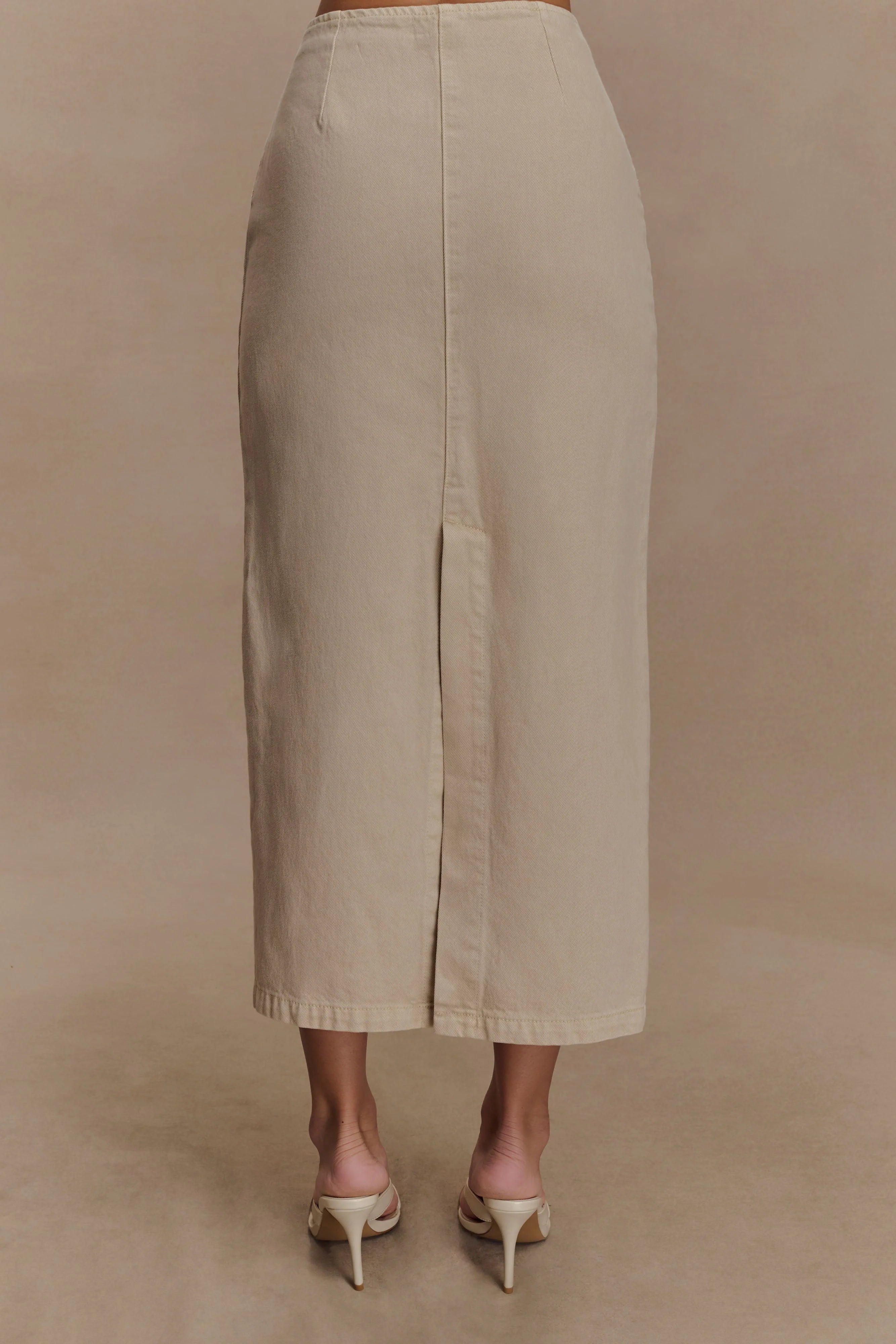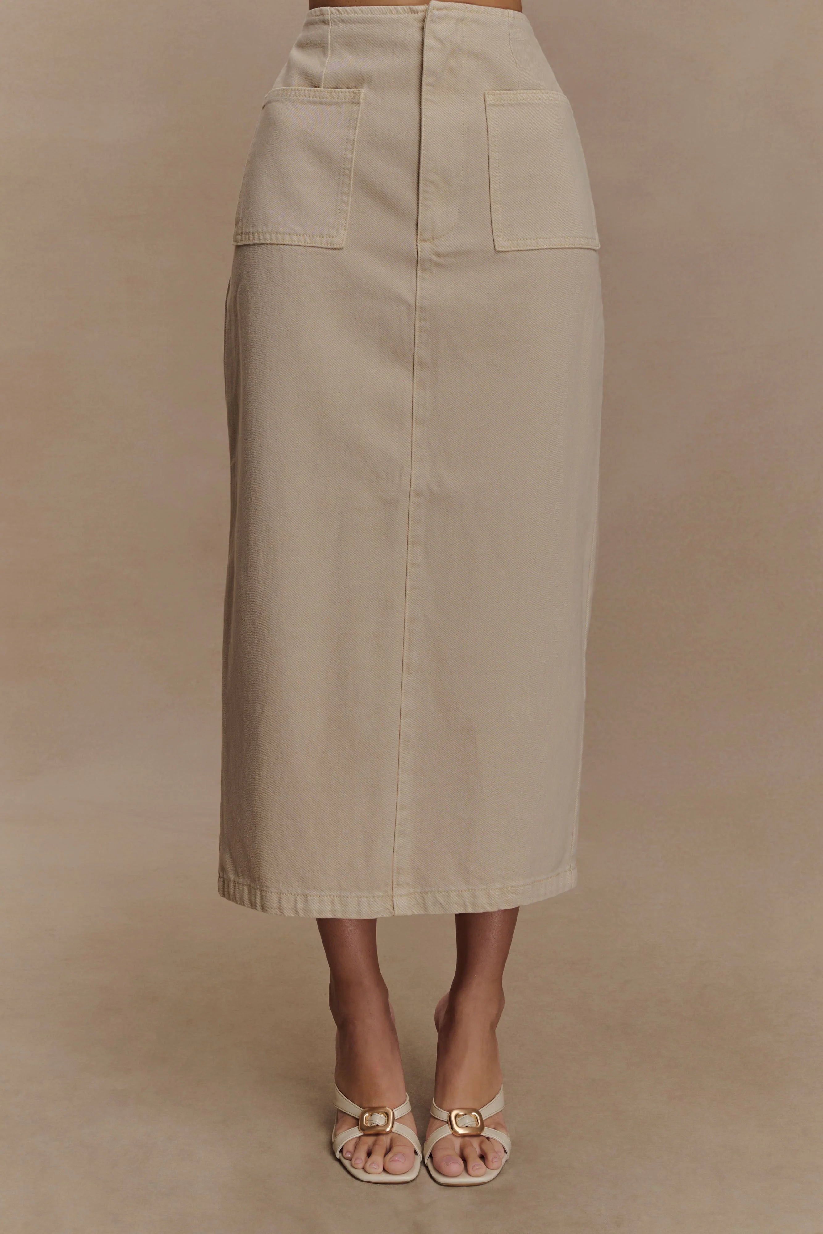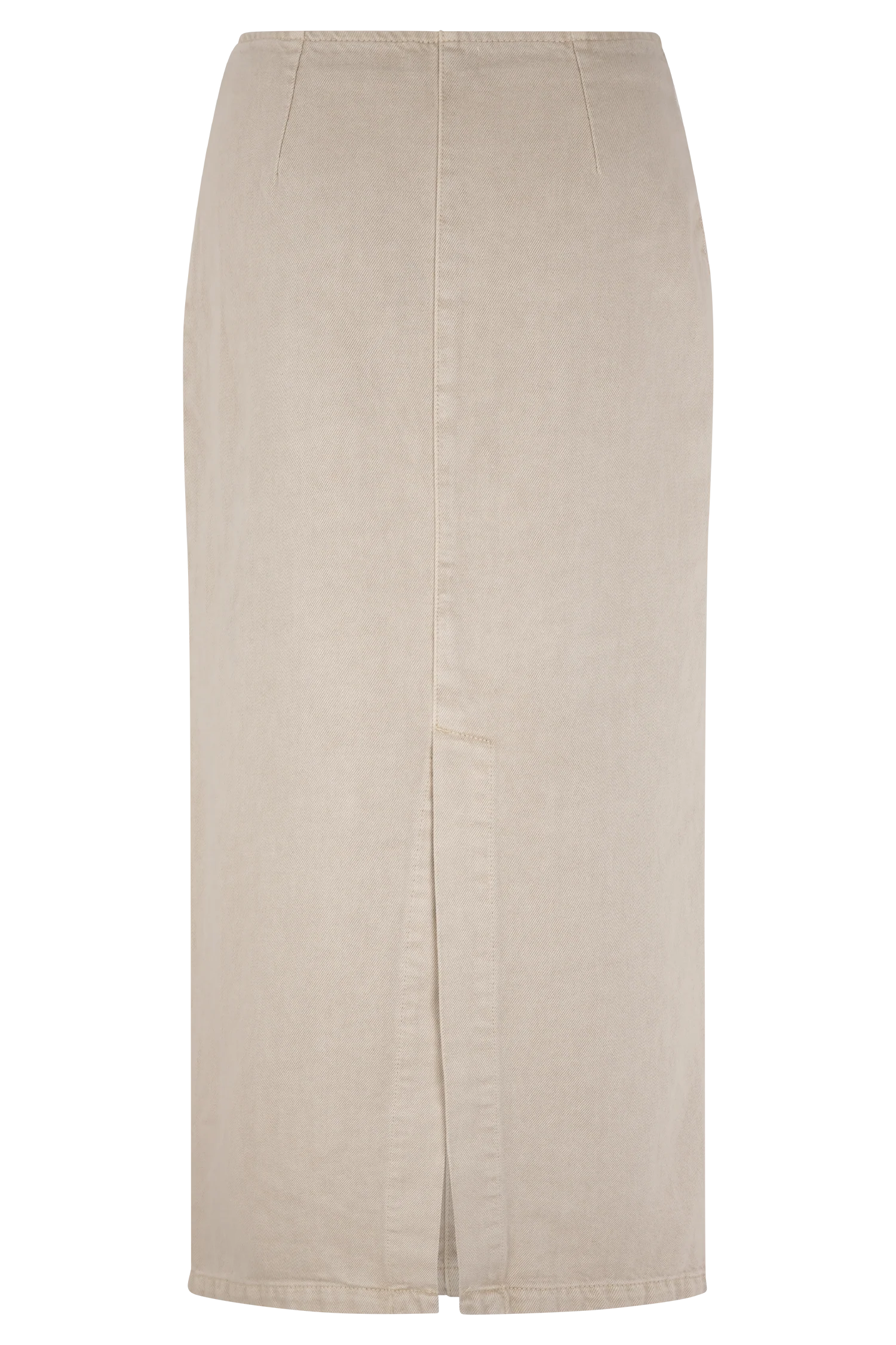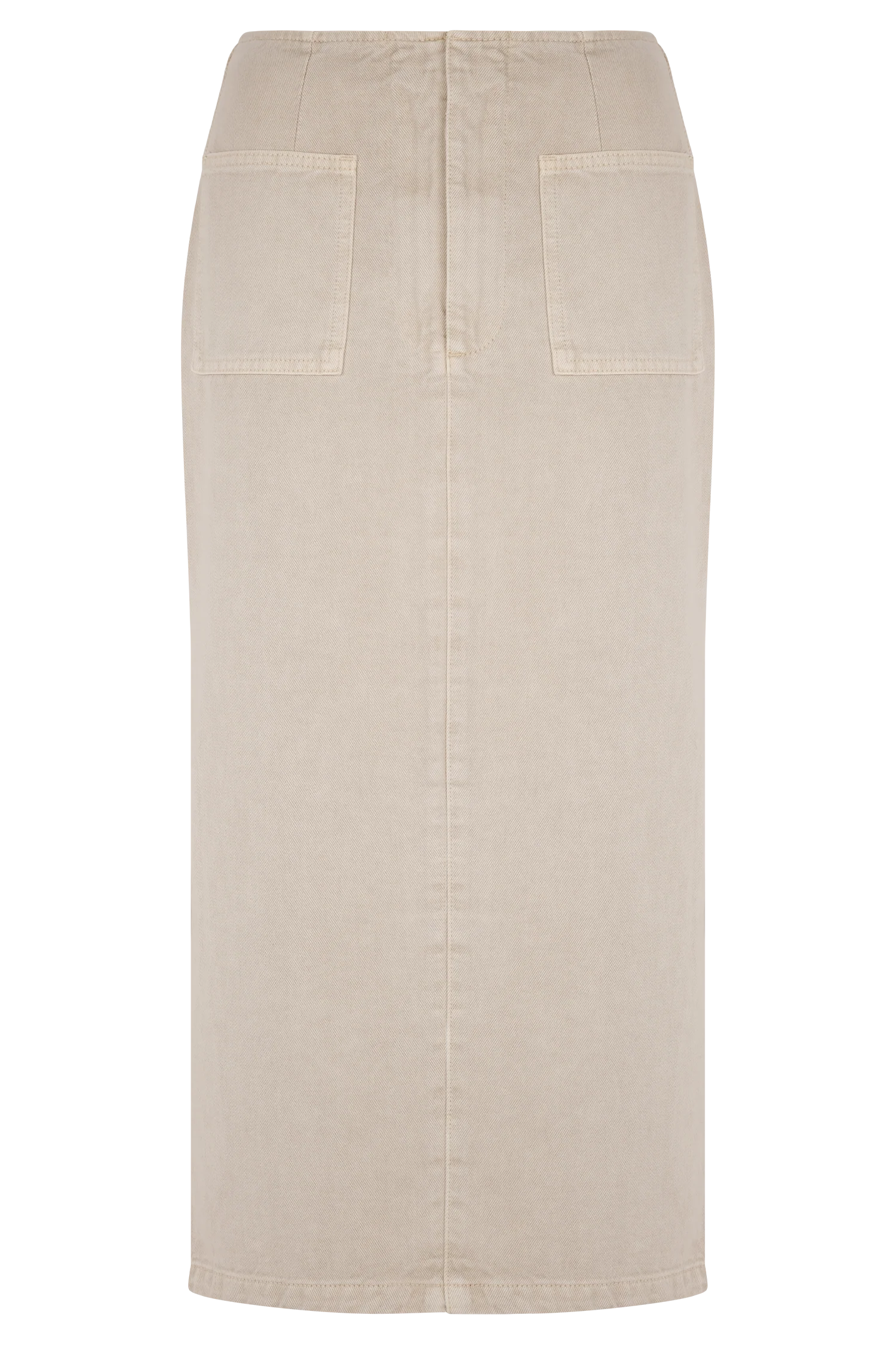 The FALLON Denim Midi Skirt is a modern essential with a clean, elongated silhouette. Designed in a maxi column shape with a mid-rise fit, this skirt features a sleek, waistband-free finish for a minimalist look. Front patch pockets and subtle darting add structure and shape, while the fly opening and back split ensure ease of movement. Pair with the for a contemporary take on double denim.