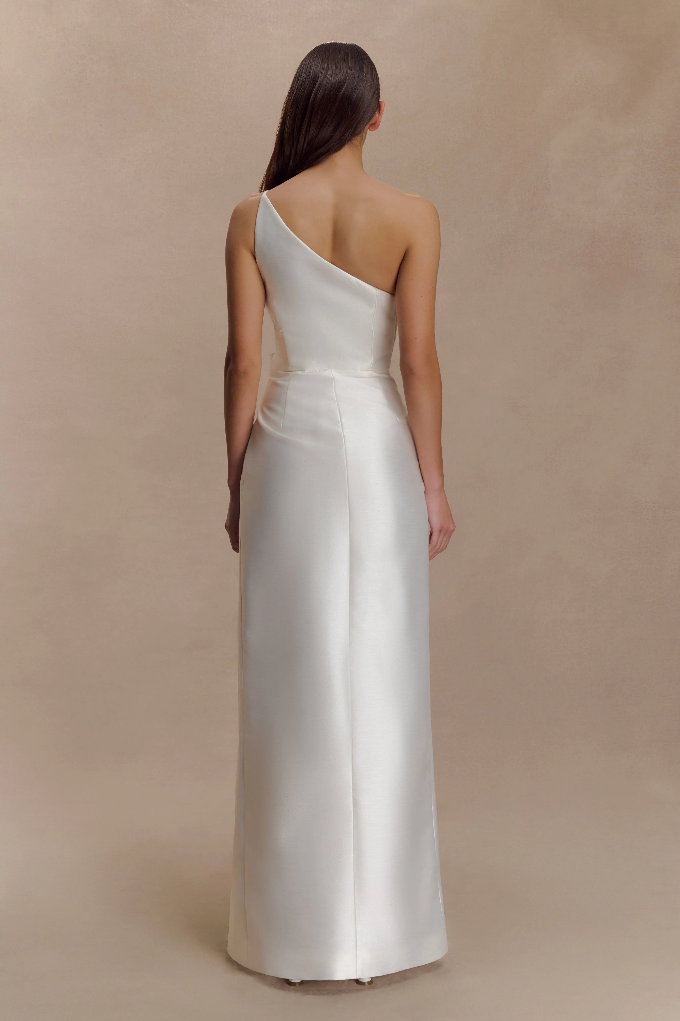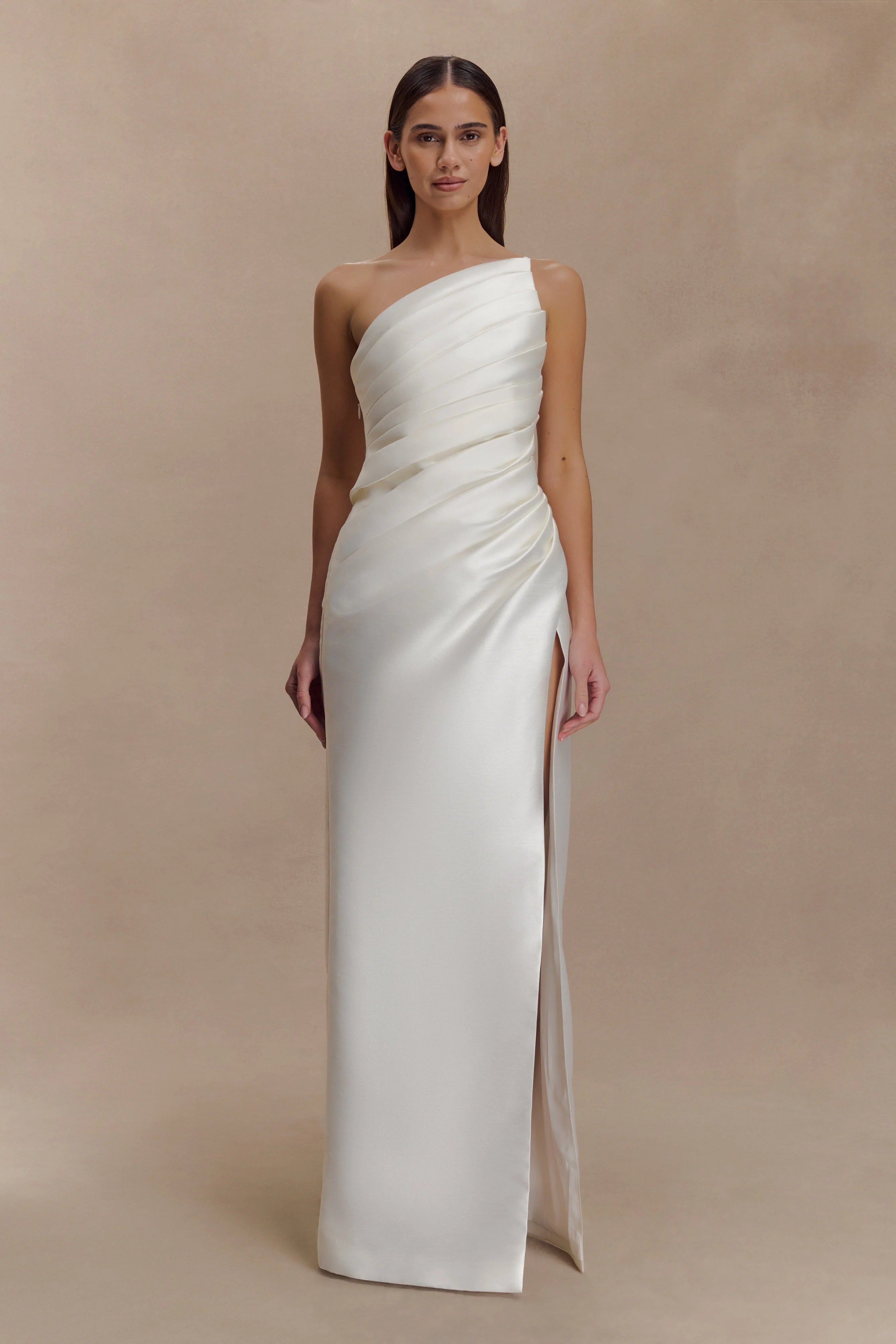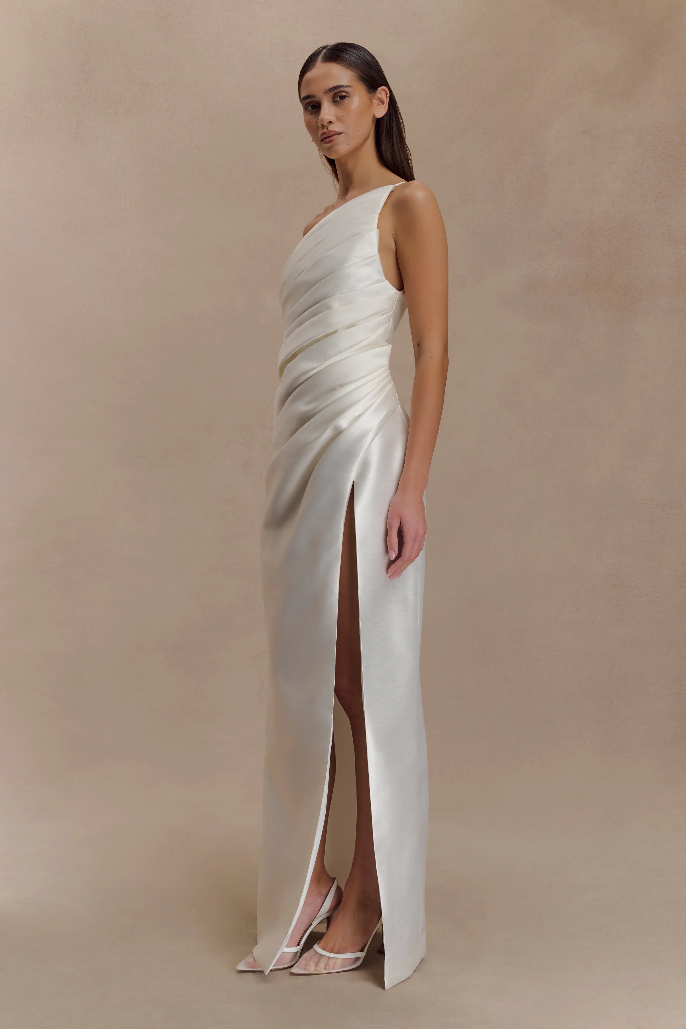 The FRANCINE One Shoulder Maxi Dress is designed to command attention with its asymmetrical neckline and flattering, form-fitting silhouette. A gathered bodice adds soft texture and shape, while an internal waist stay and full lining ensure secure, comfortable wear. Finished with a thigh-high leg split and invisible back zip, this dress moves with ease and elegance—perfect for evenings that call for timeless sophistication and a touch of drama.