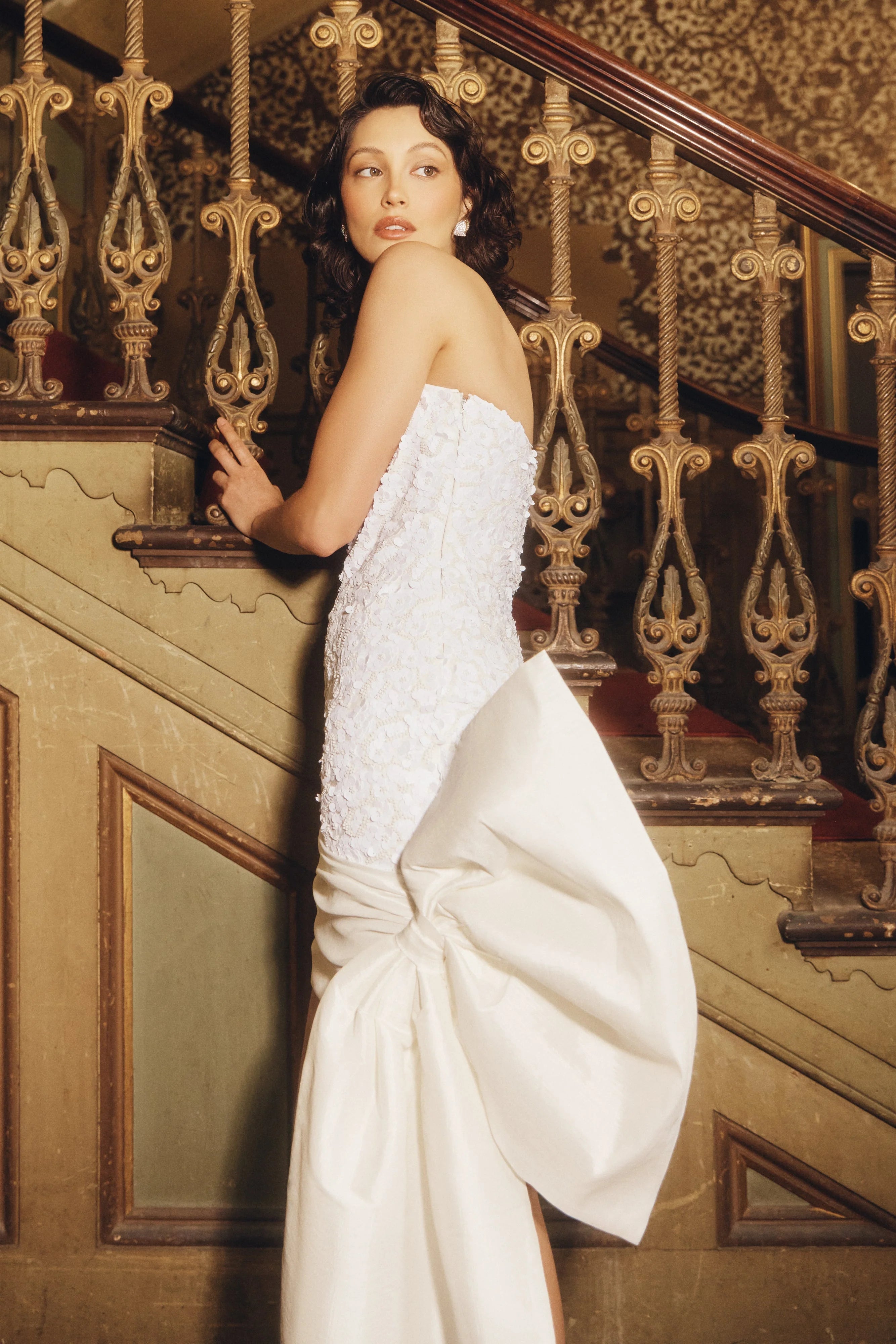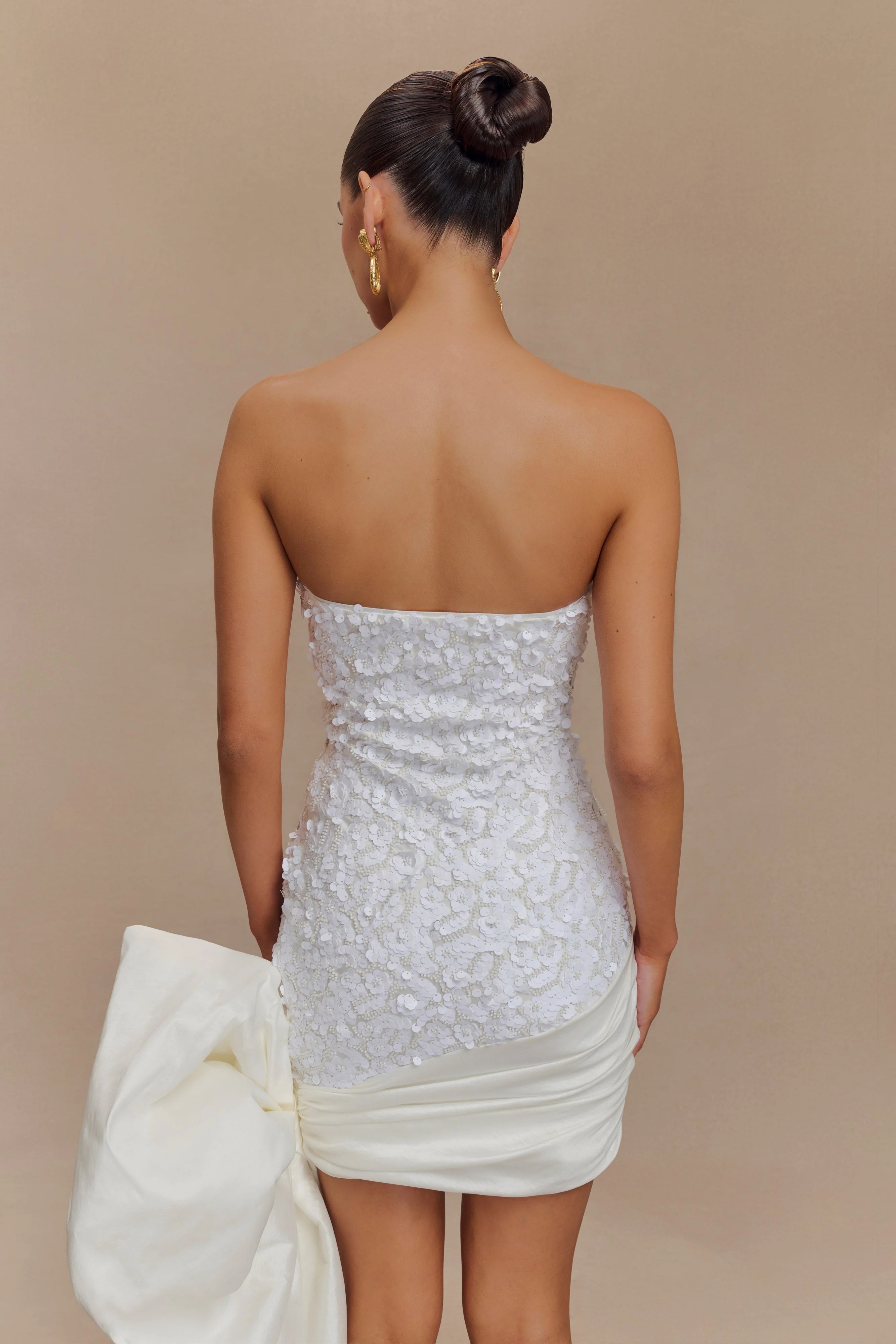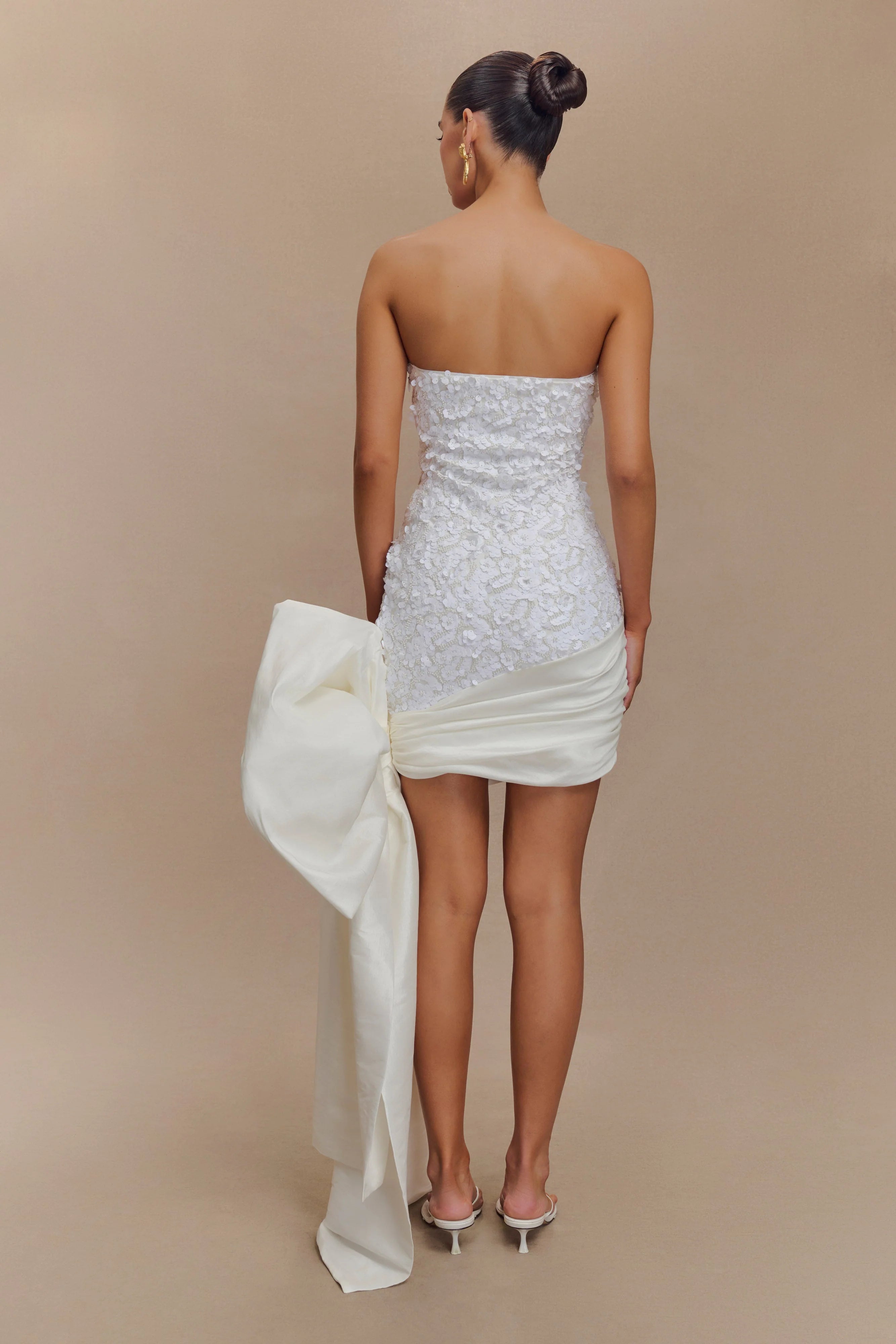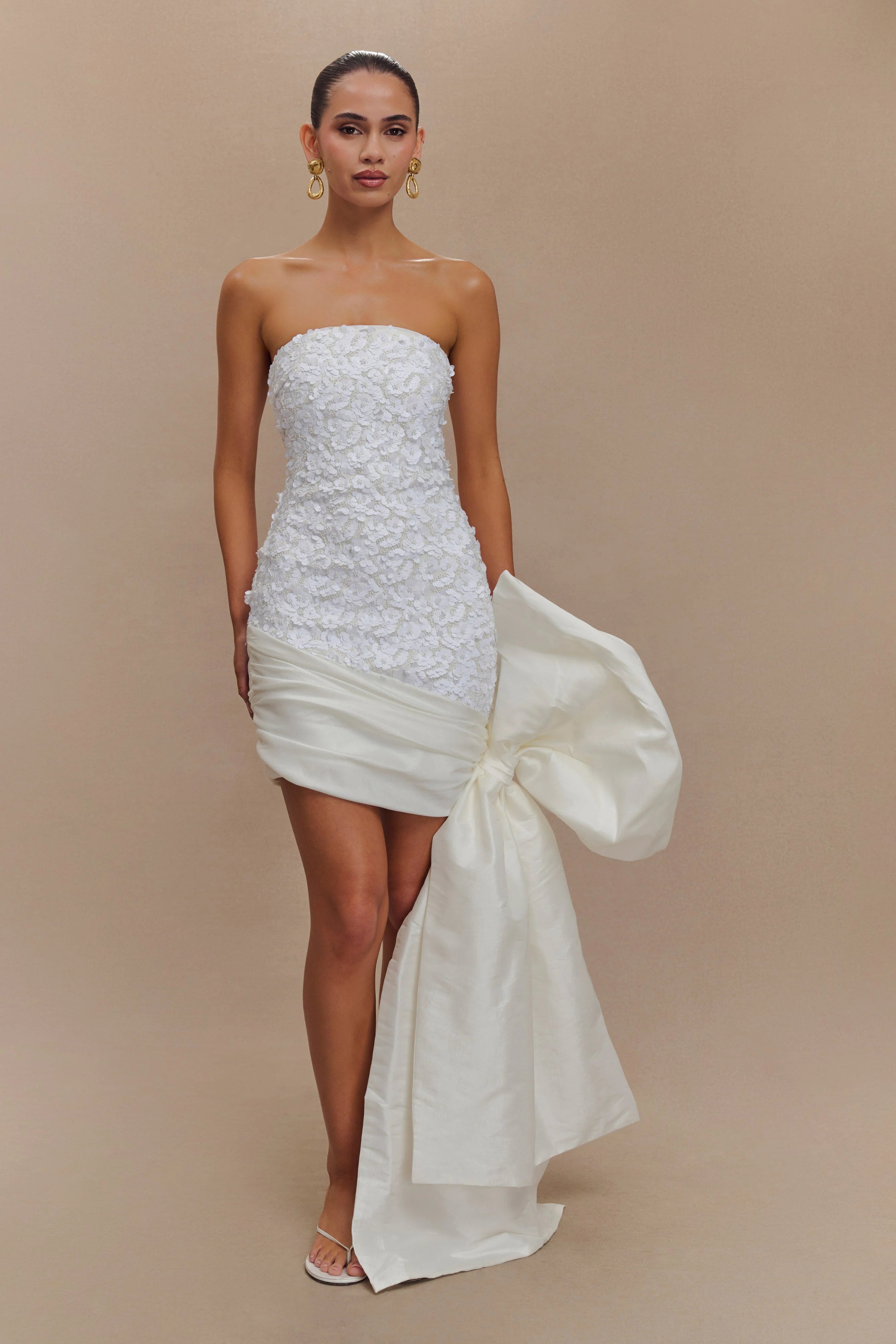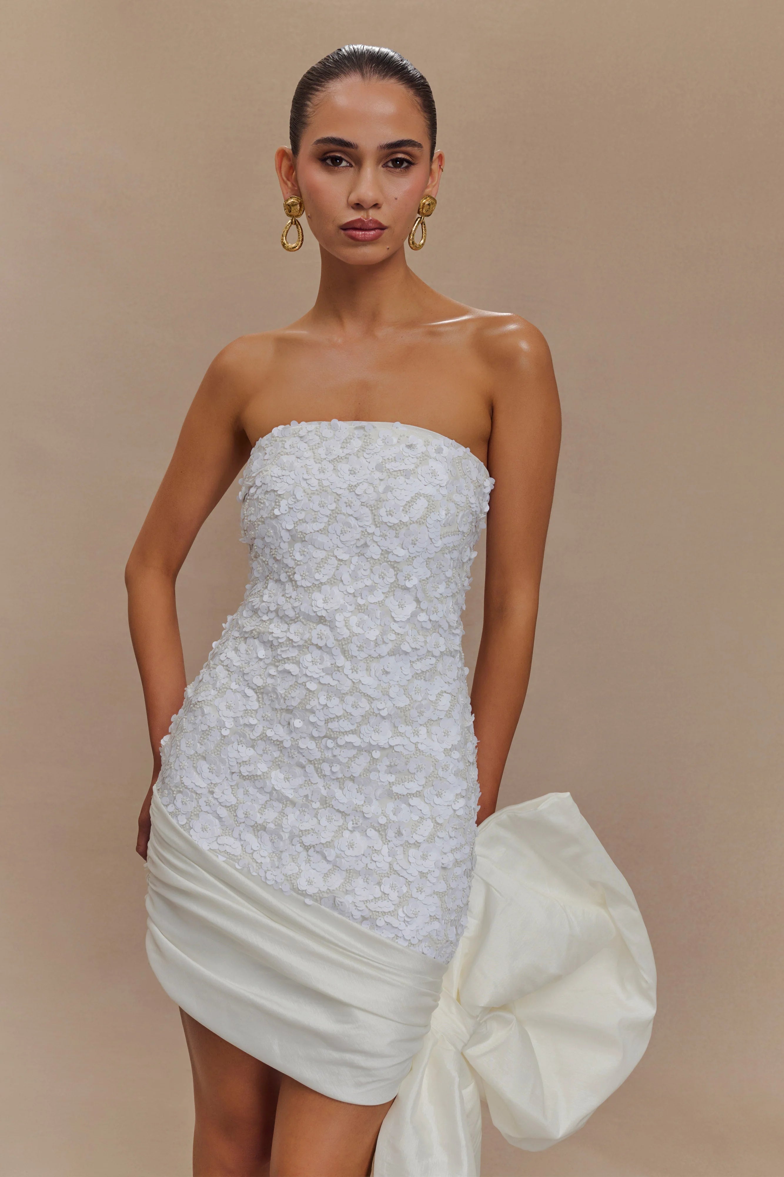 Make a statement in the FRANKA Strapless Bow Mini Dress, where bold glamour meets playful sophistication. The fitted strapless bodice is embellished with shimmering sequins, while the contrast skirt creates a sleek, modern look. An oversized bow on the hip adds a dramatic touch, enhancing the dress’s unique charm. With its mini length and centre back zip for effortless wear, the Franka dress is the perfect choice for any event that calls for a mix of elegance and fun.