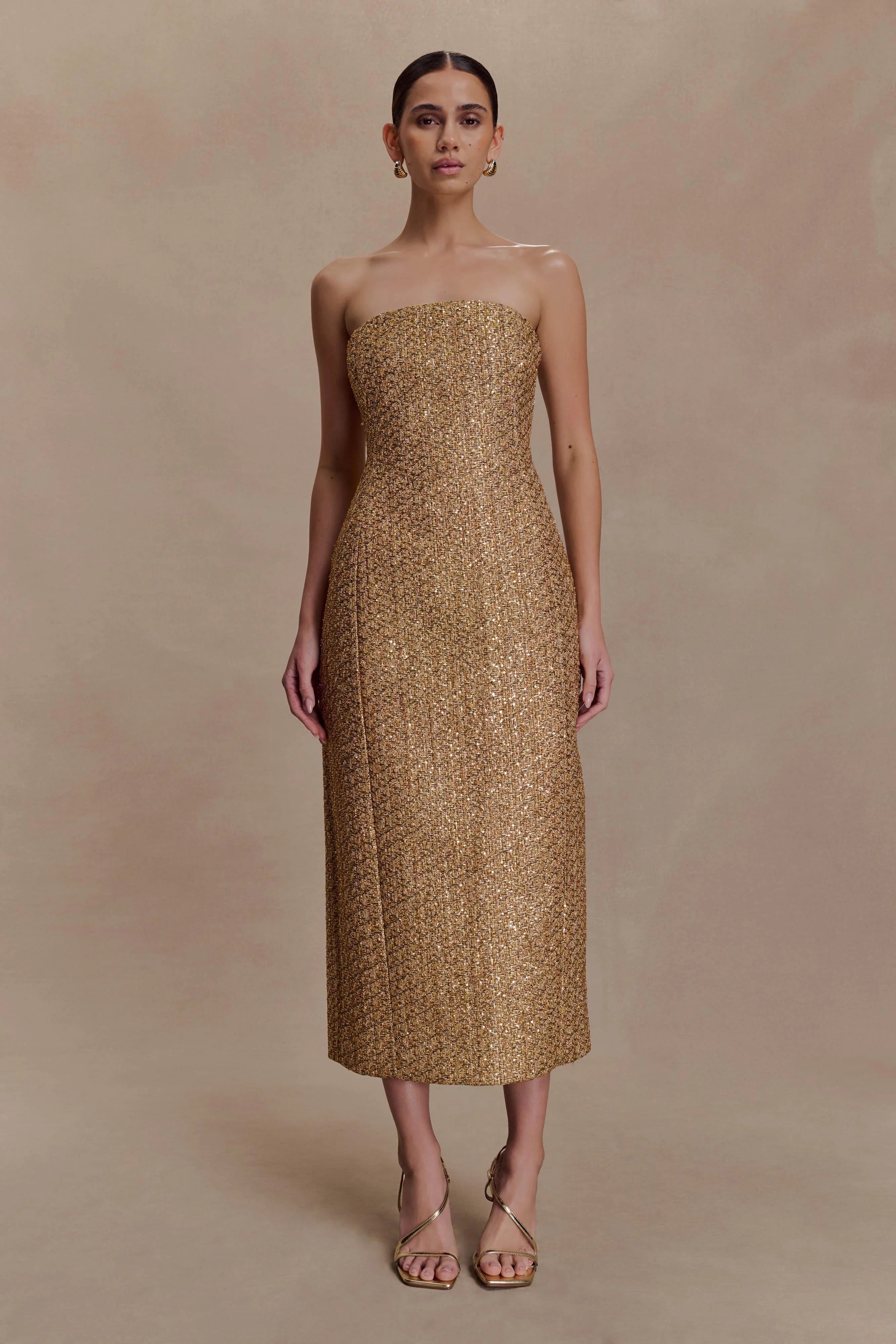 The GALA Strapless Tweed Midi Dress combines timeless tailoring with a sleek, feminine silhouette. Designed in a structured tweed fabrication, it features a strapless neckline that highlights the shoulders and neckline with refined simplicity. Fully lined for comfort and finished with an invisible centre back zip, the midi-length cut is completed by a subtle back split for ease of movement. This dress brings polish and poise to any occasion—where classic texture meets contemporary design.
