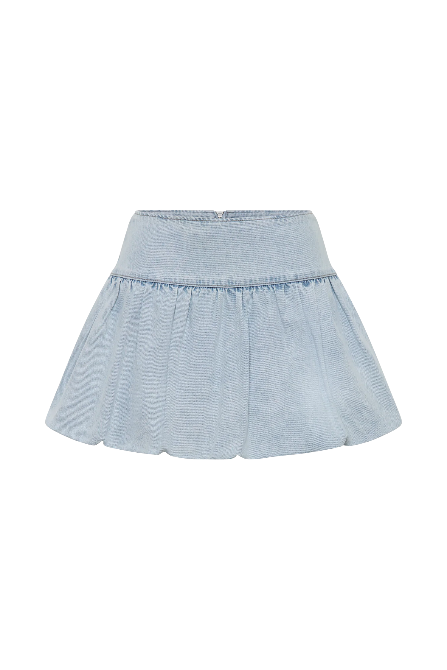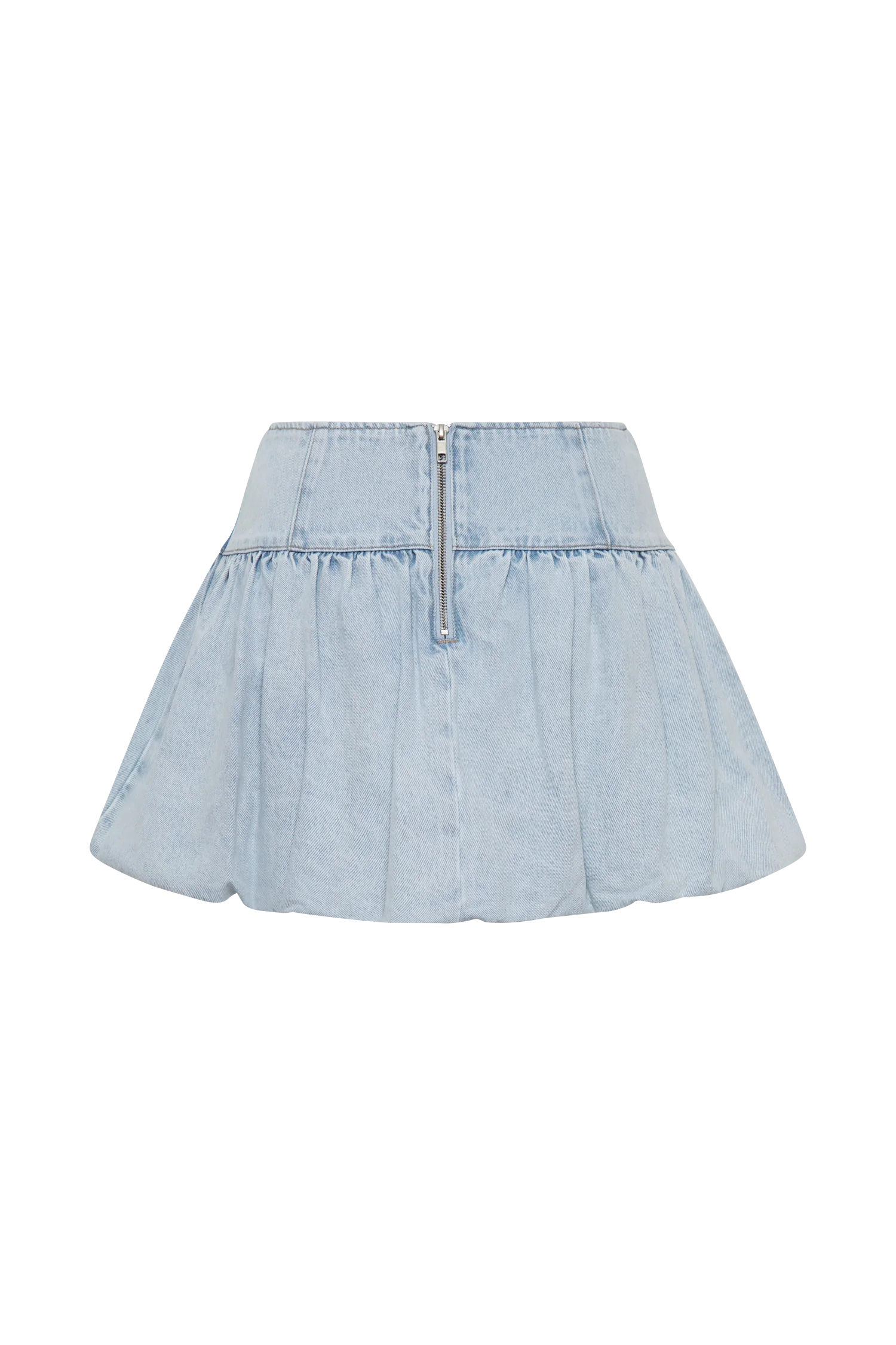 The GENIA Denim Bubble Mini Skirt is designed with a flat yoke and a centre back zip for a sleek fit. They feature a bubble shaped lower skirt, creating a playful and voluminous silhouette, with a mini length and a fully lined interior for comfort. This skirt is an ideal match with the , offering a coordinated and stylish ensemble.