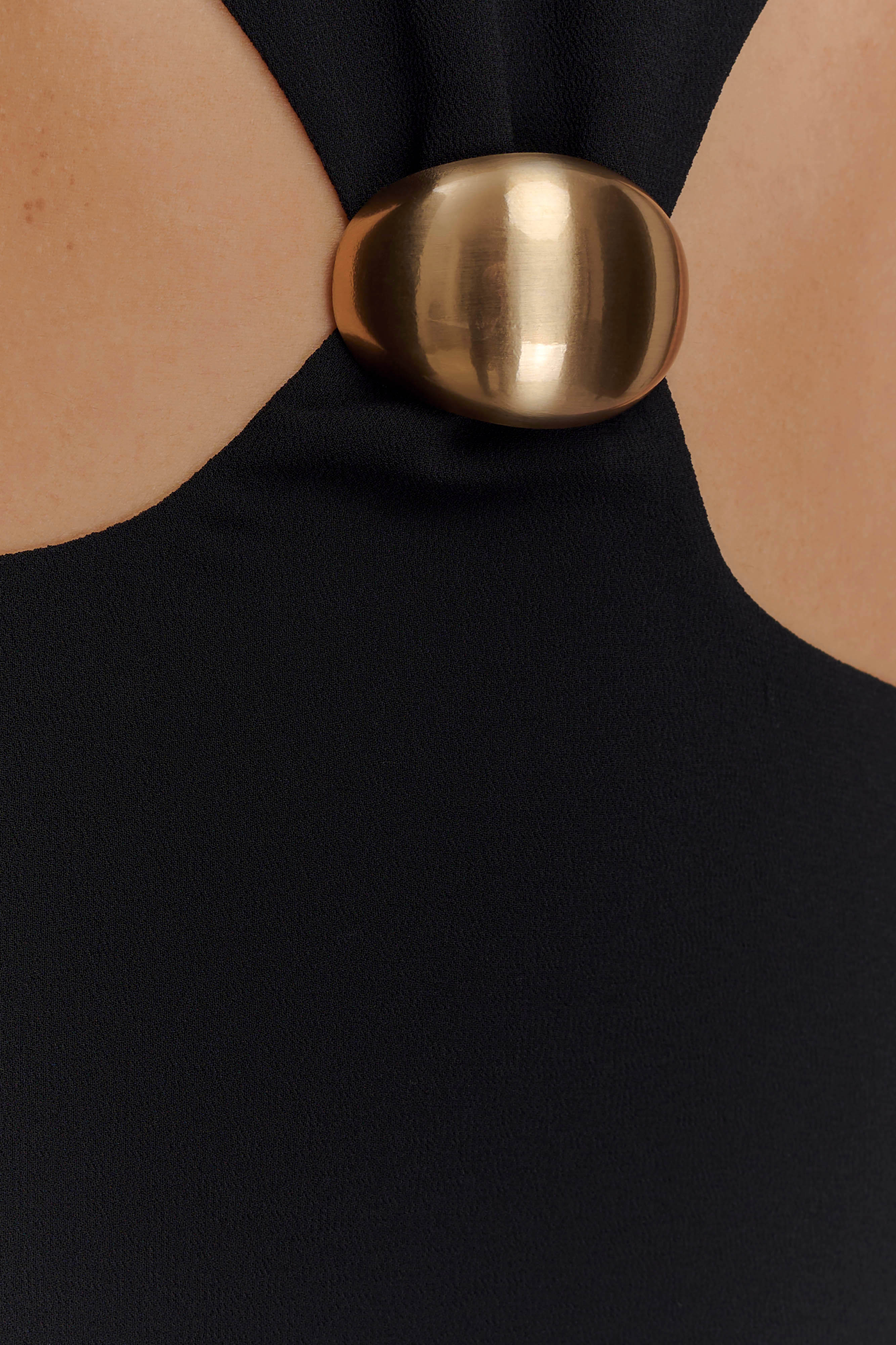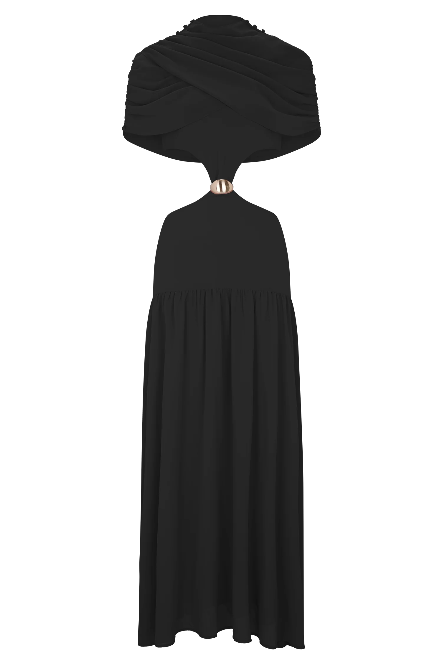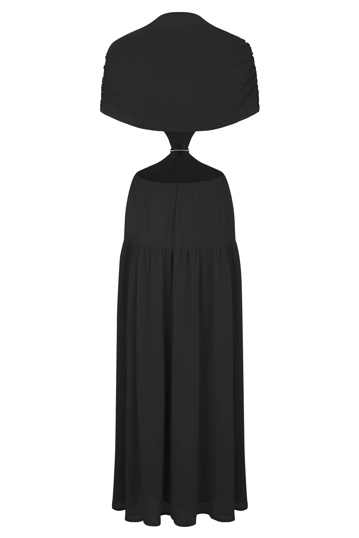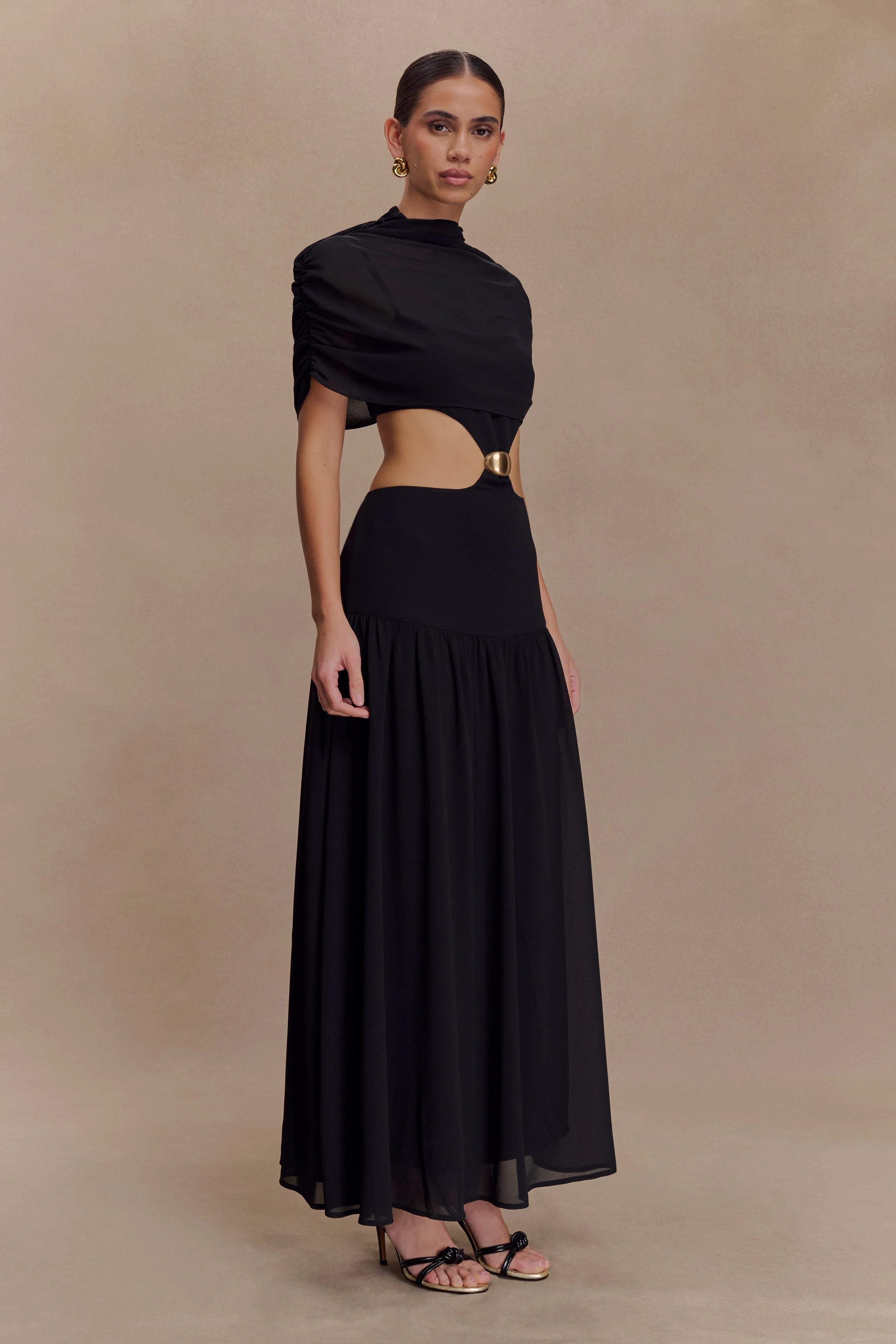 The GEORGINA Chiffon Midi Dress is an ode to effortless sensuality. Designed with a fluid, sleeveless chiffon overlay and a softly structured underdress, it features adjustable straps for a custom fit and gold-tone hardware for a refined finish. Side cut-outs and an open back elevate the silhouette, while the relaxed fit and pull-on design keep things breezy and chic. Whether you're heading to sunset cocktails or a summer soirée, this dress moves with ease and turns heads with grace.