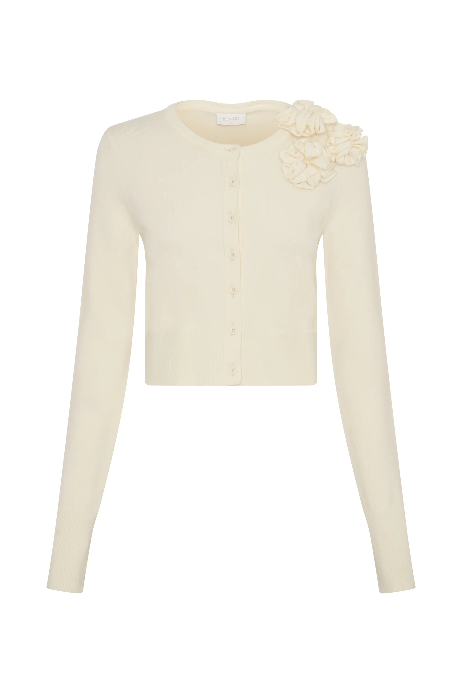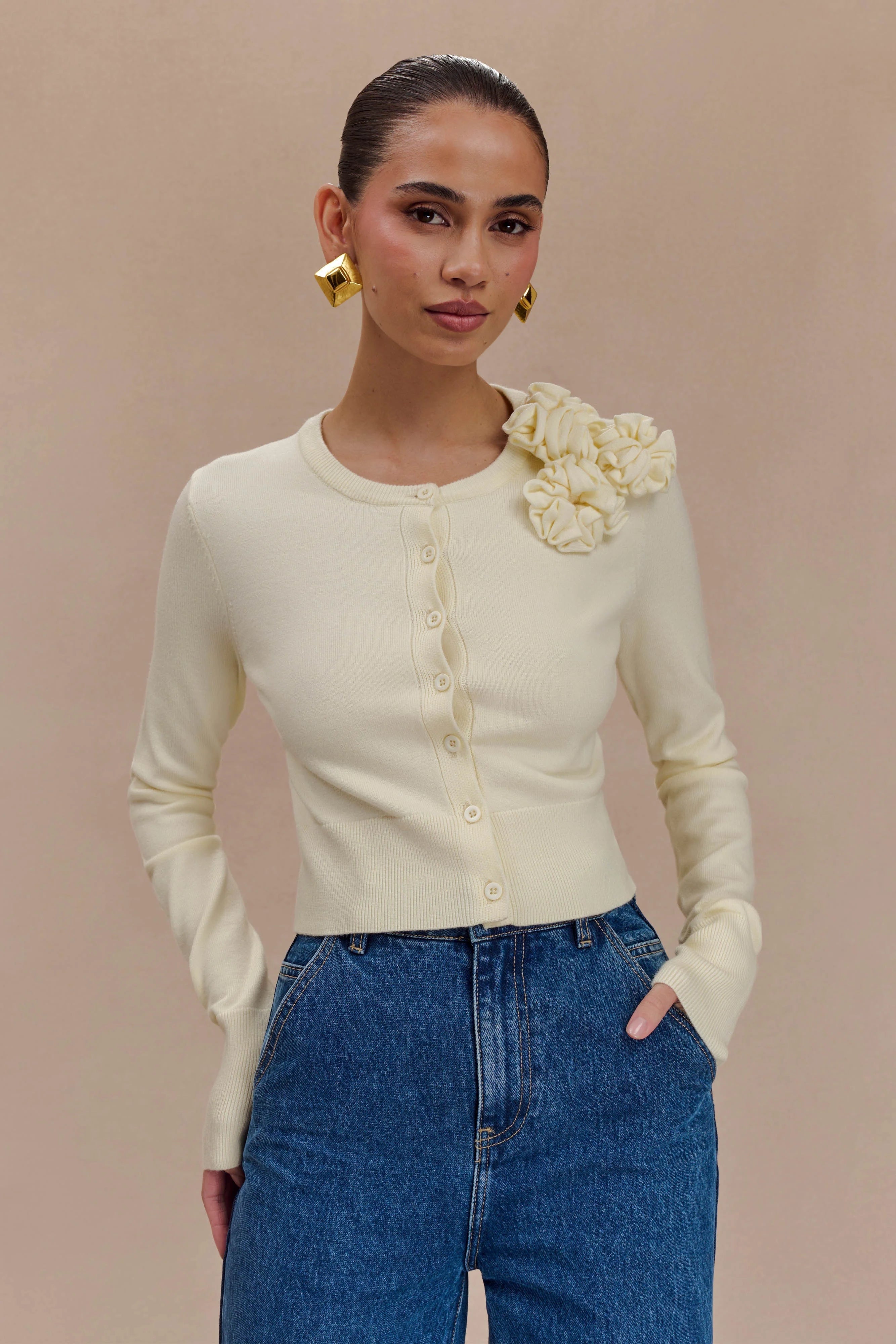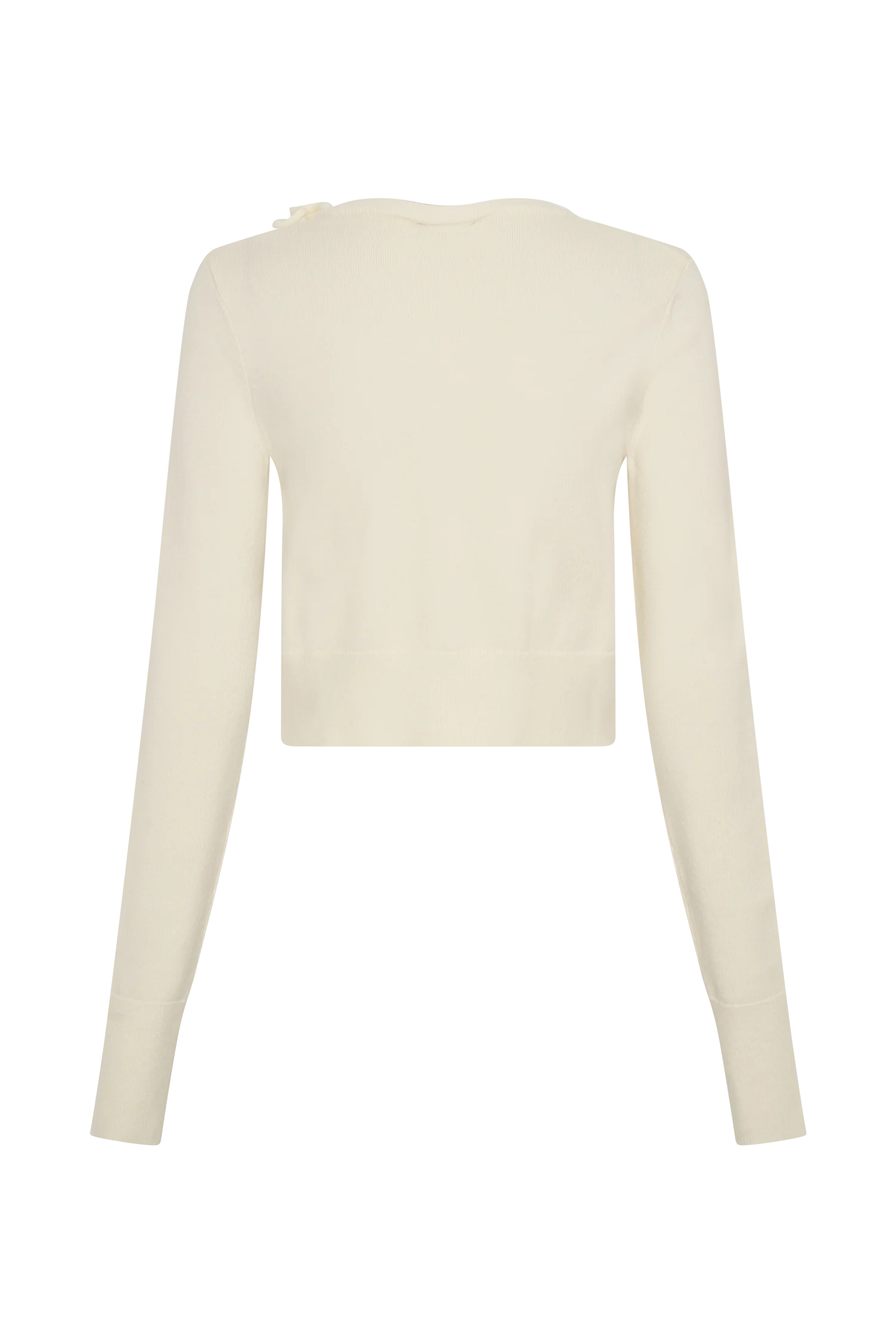 Embrace cosy elegance with the GIANNA Knit Cardigan with Flowers. This delightful piece features a classic crew neckline and a button front closure, making it easy to layer over any outfit. The ribbed waist provides a flattering fit, while the long, straight sleeves add a touch of sophistication. Adorned with beautiful flower details at the shoulder and cropped length, this cardigan brings a playful yet refined element to your look.
