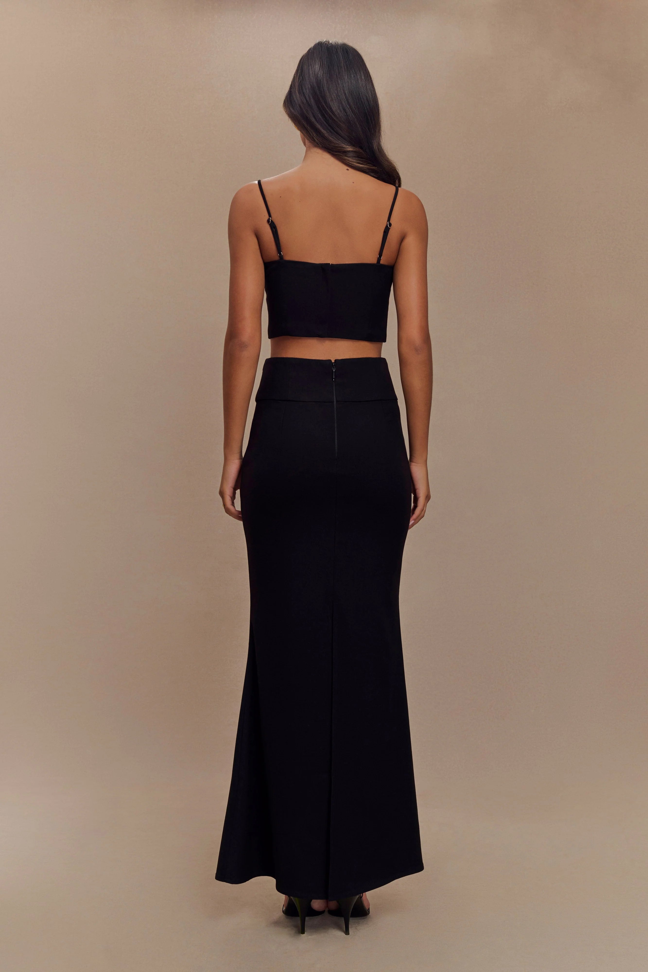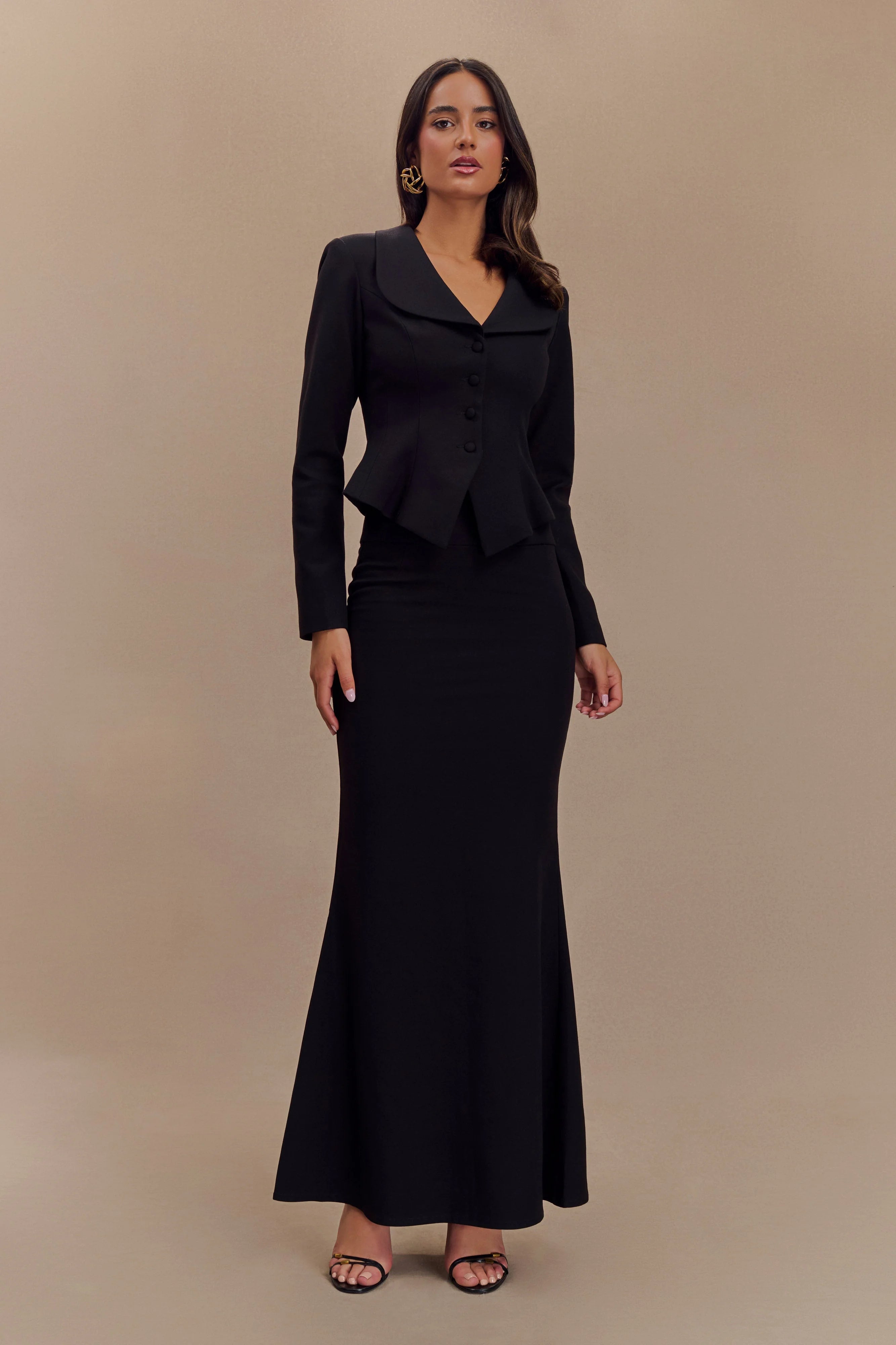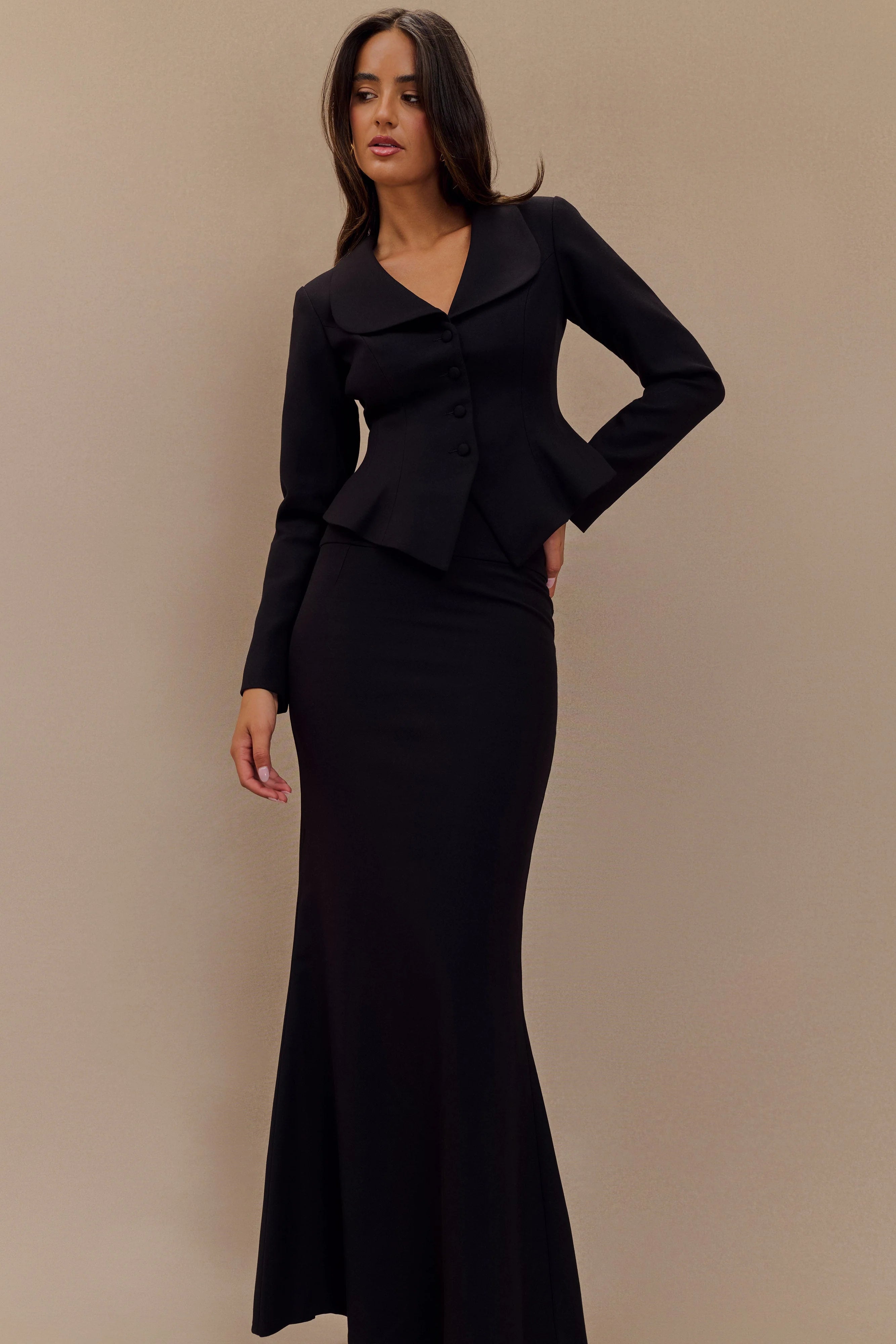 Step out in the GRACE Suiting Maxi Skirt, a refined piece designed to make a sophisticated statement. With its high-waisted, tailored shape, this skirt flatters your silhouette while offering an elegant fishtail hem and maxi length for added drama. The back vent ensures ease of movement, while a front non-functional button detail adds a subtle, polished touch. Fully lined for comfort and structure, it pairs seamlessly with the for a chic, coordinated look that exudes confidence and style at any event.