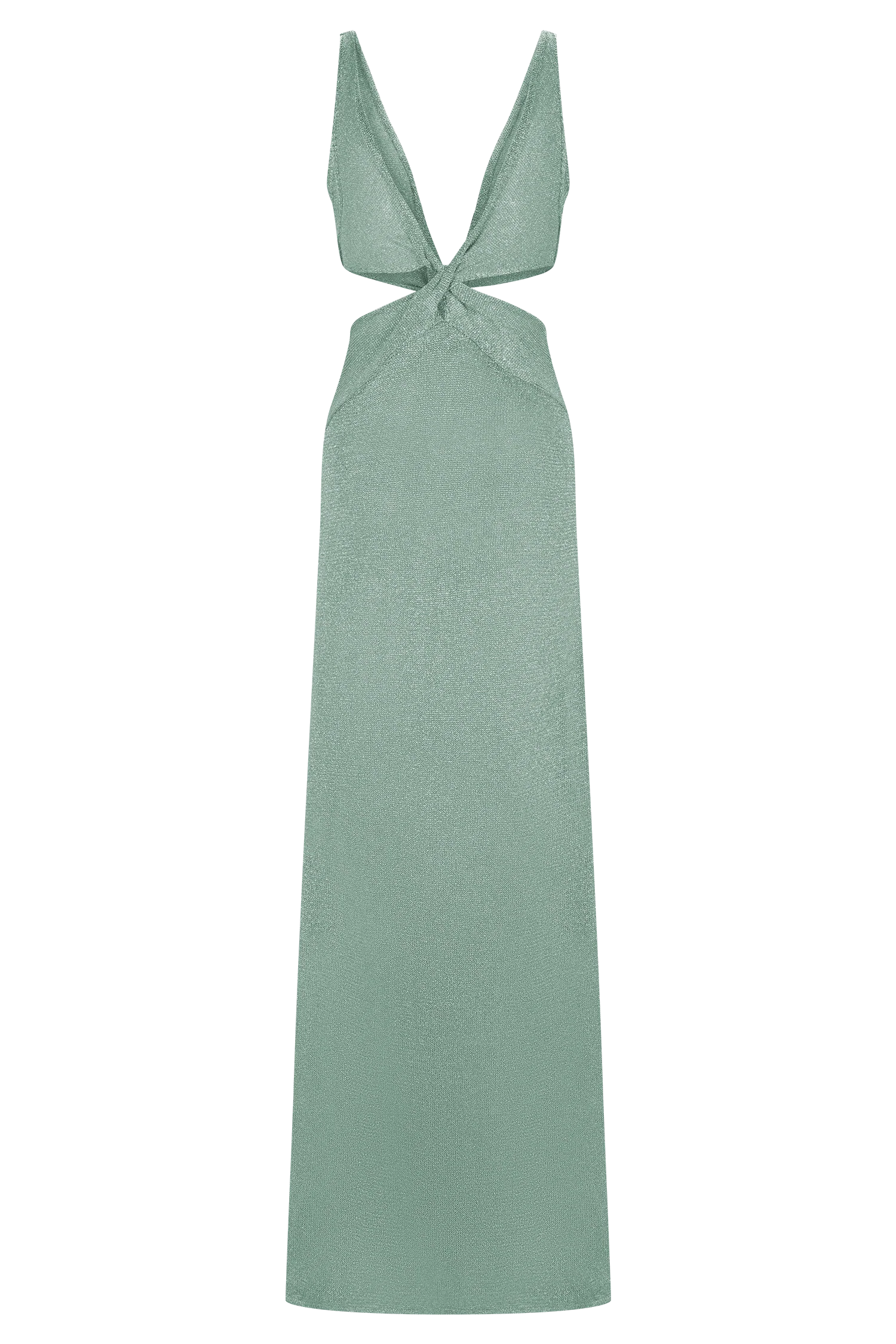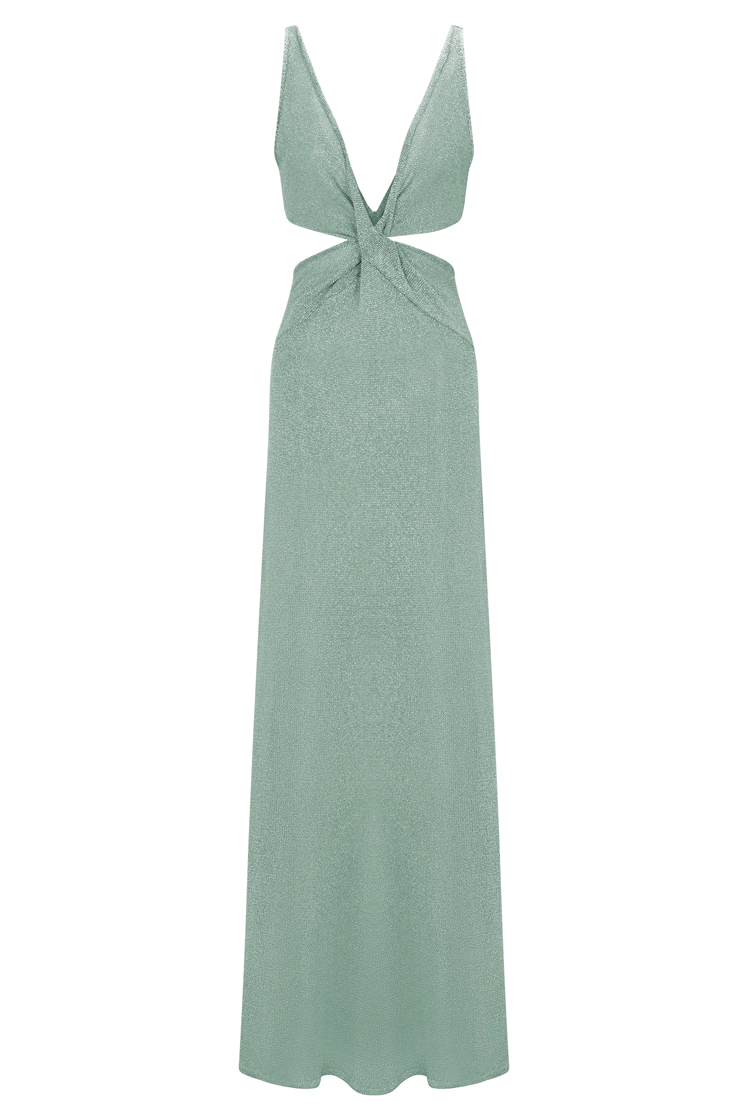 The GRACELYN Twisted Metallic Knit Maxi Dress is designed to make a bold, unforgettable entrance. Featuring a deep plunge neckline and low open back, this statement silhouette is elevated with front and back twist detailing and waist cutouts that sculpt and define. Crafted from shimmering metallic yarn, the unlined knit hugs the body with a soft stretch and a straight skirt shape that elongates the figure. Perfect for after-dark events, sunset soirees, or any occasion where all eyes are on you.