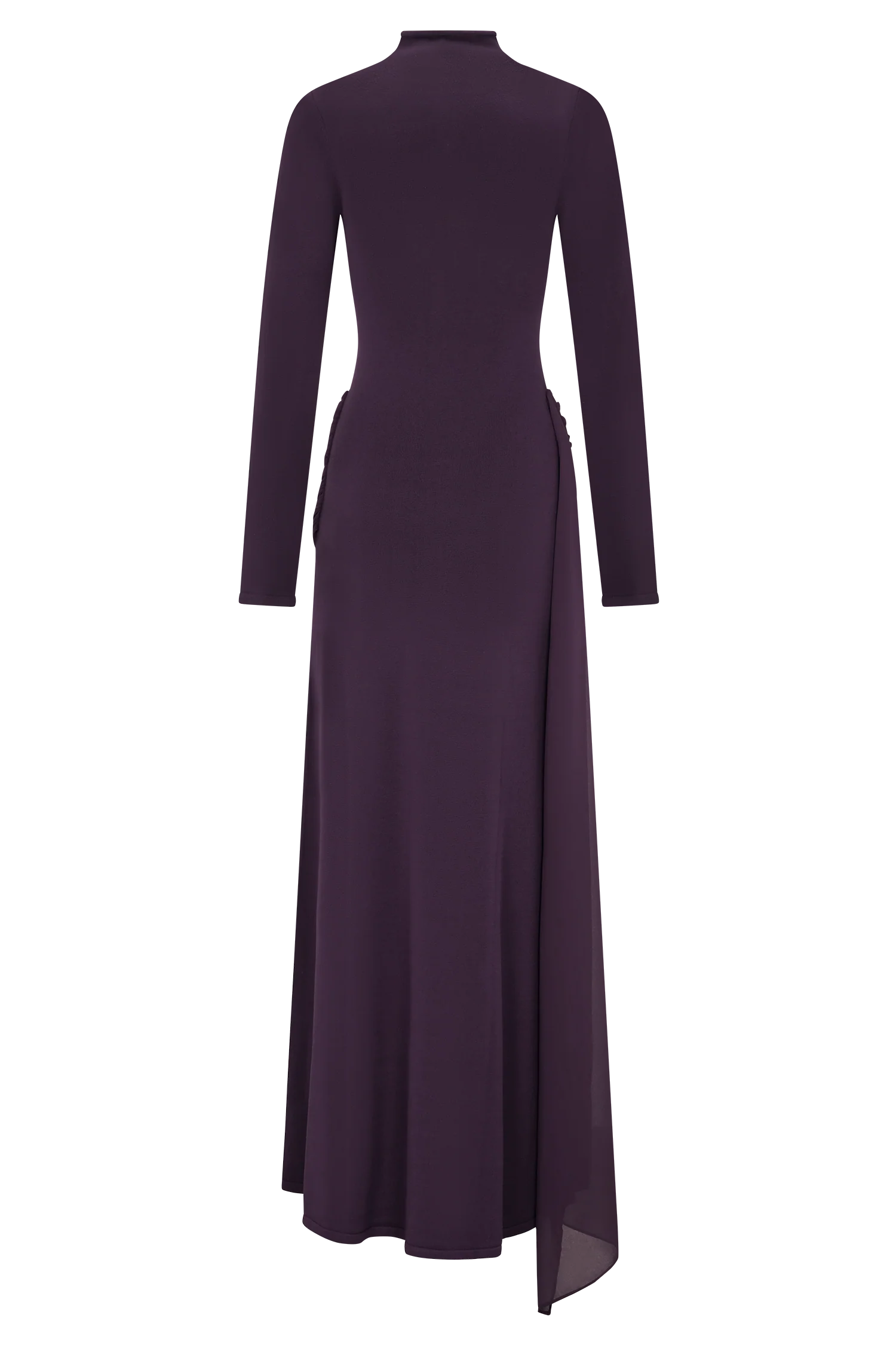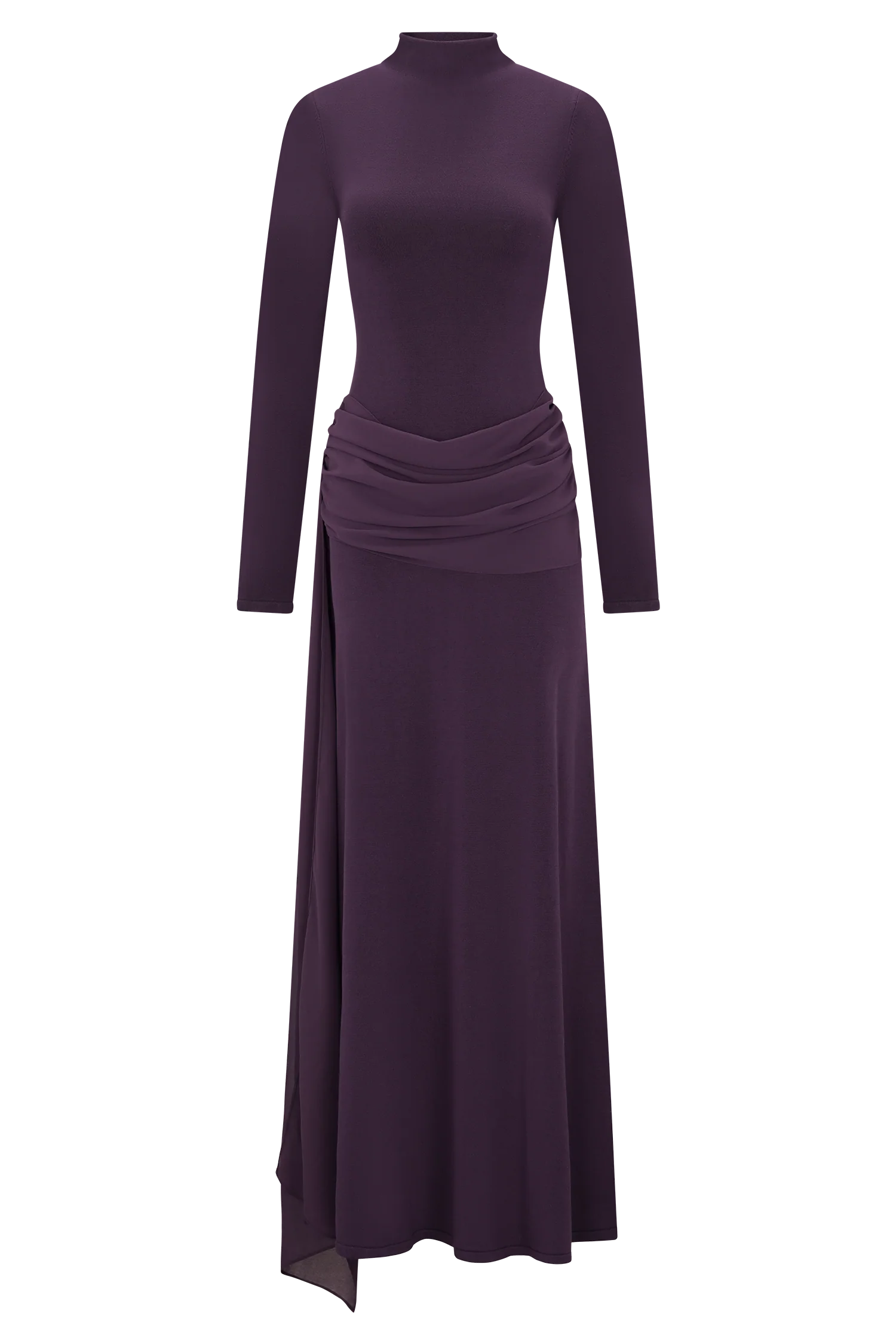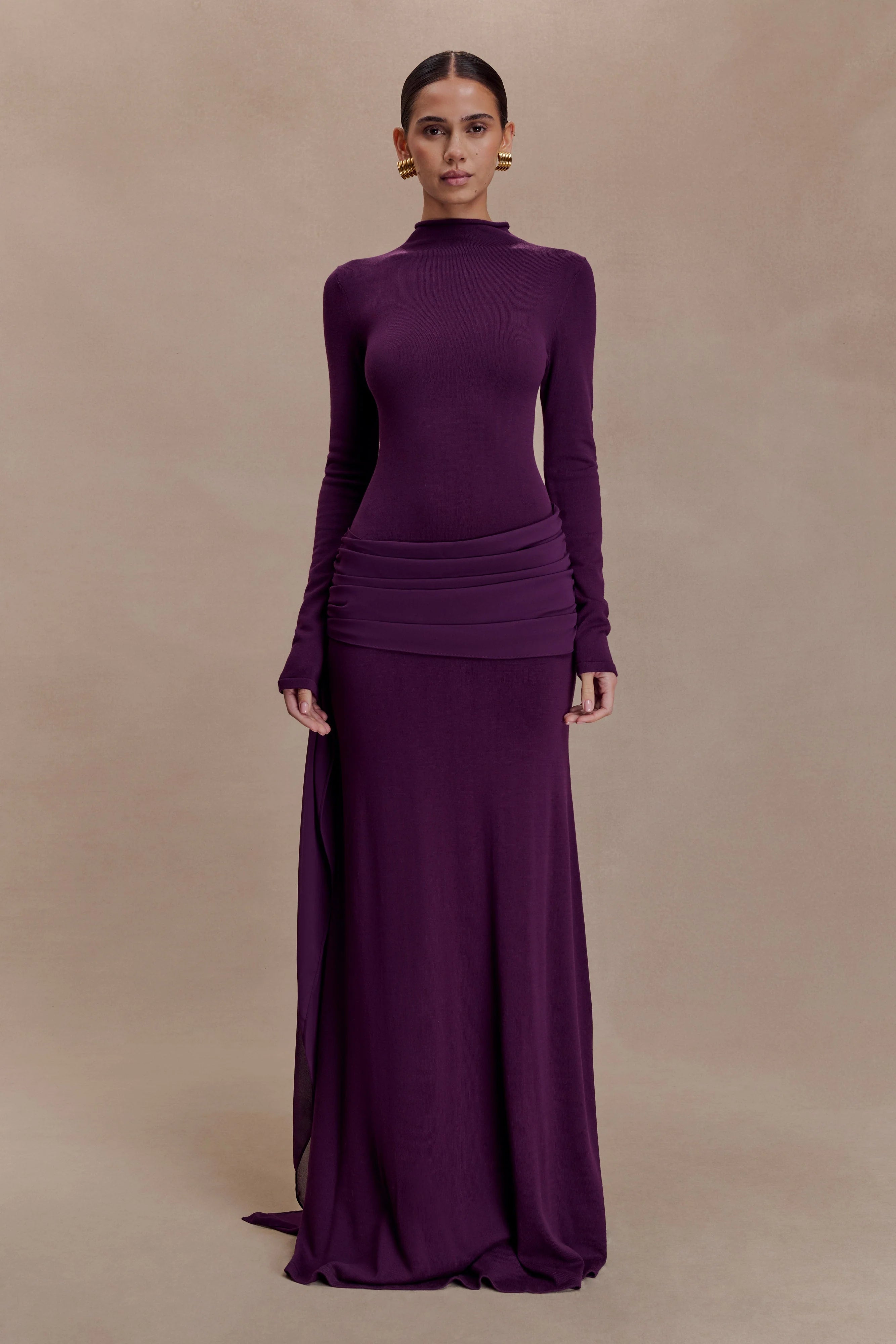 The GRAYSON Knit Chiffon Maxi Dress brings together the structure of knitwear with the fluidity of chiffon. Designed with a high neckline and long sleeves, it’s cut to a bodycon fit through the torso before falling into an A-line skirt that flows gracefully with every step. A chiffon draped overlay detail adds soft dimension and movement, balancing texture with ease. Unlined for a lightweight feel, this dress embodies understated sophistication — refined, modern, and effortlessly wearable.