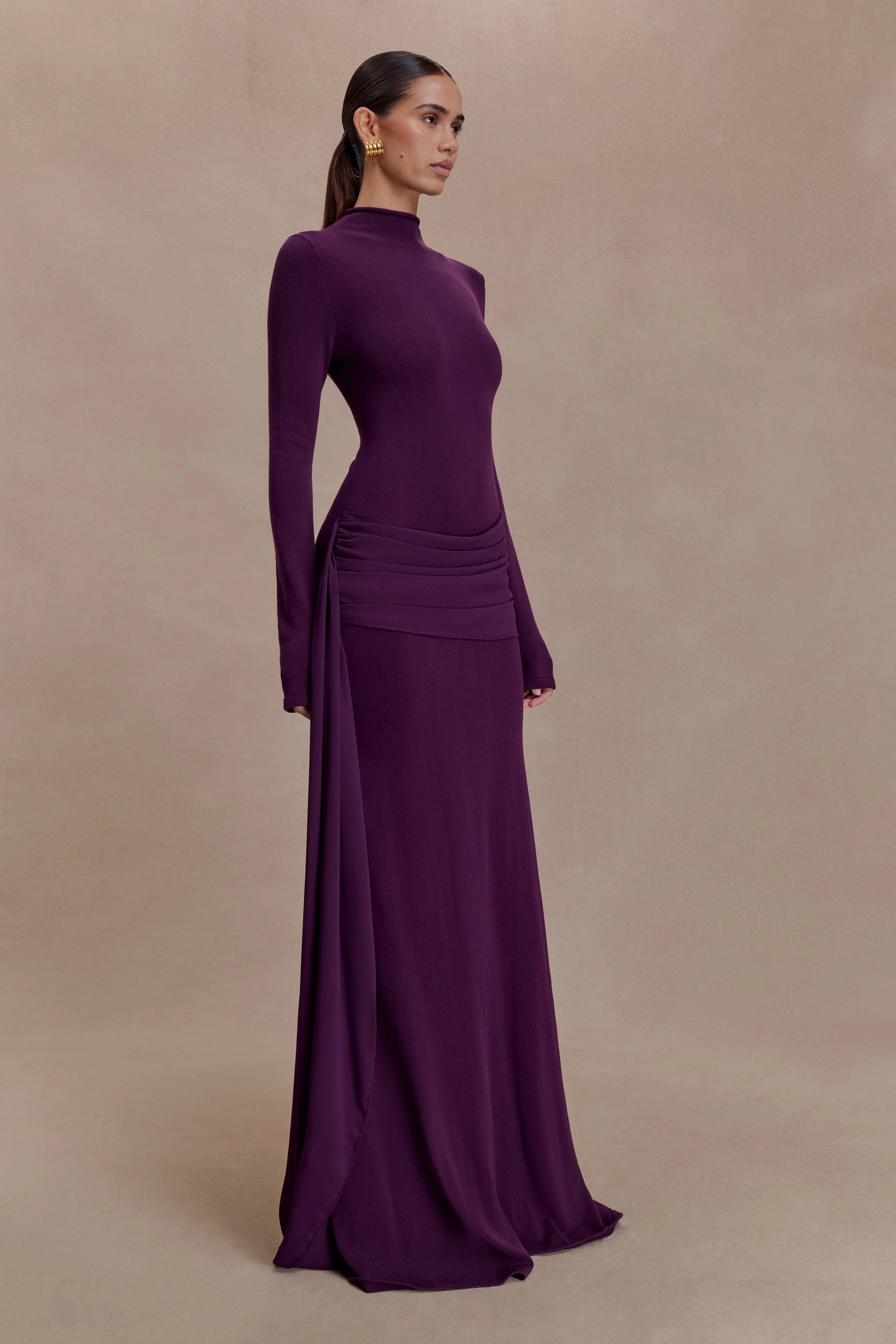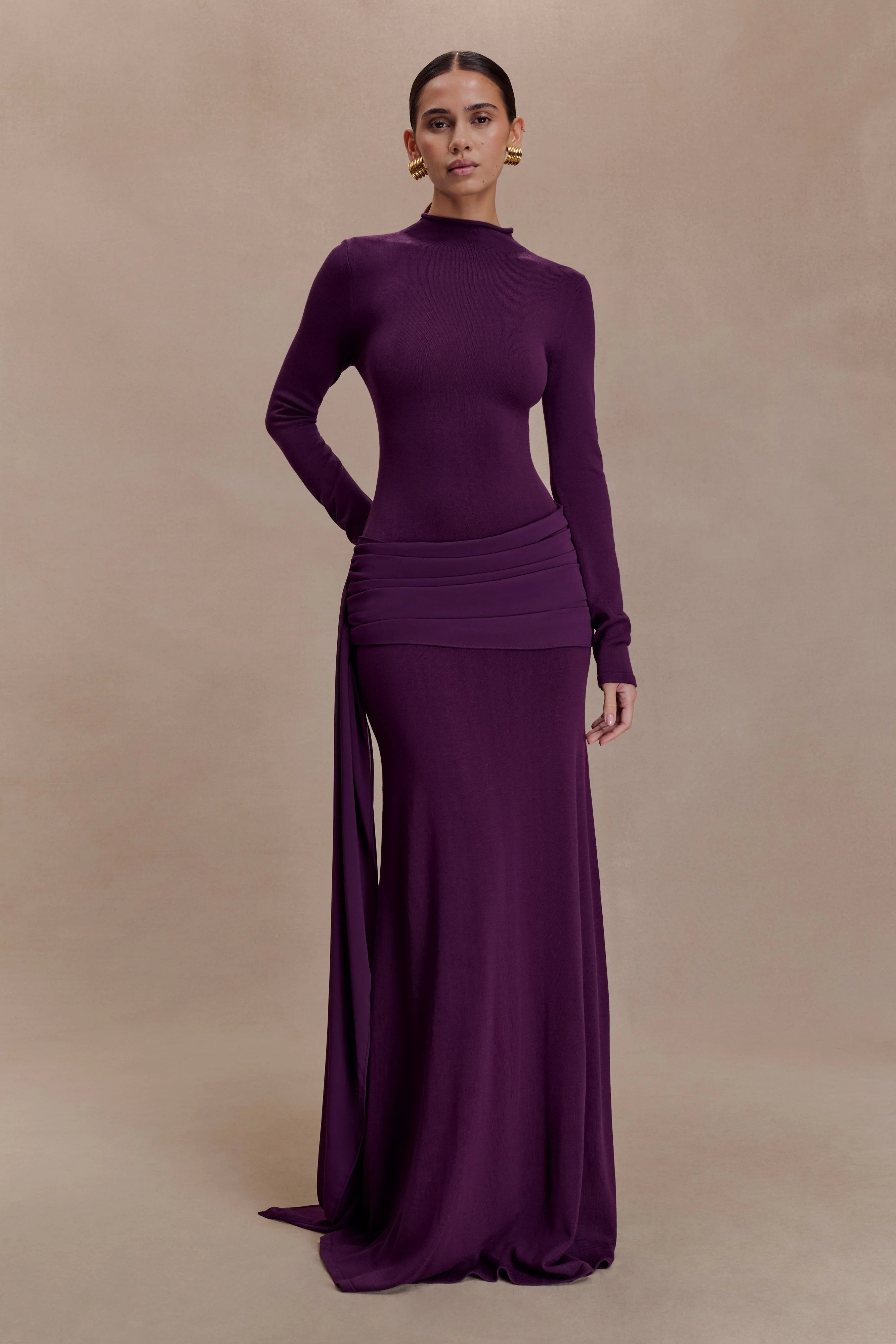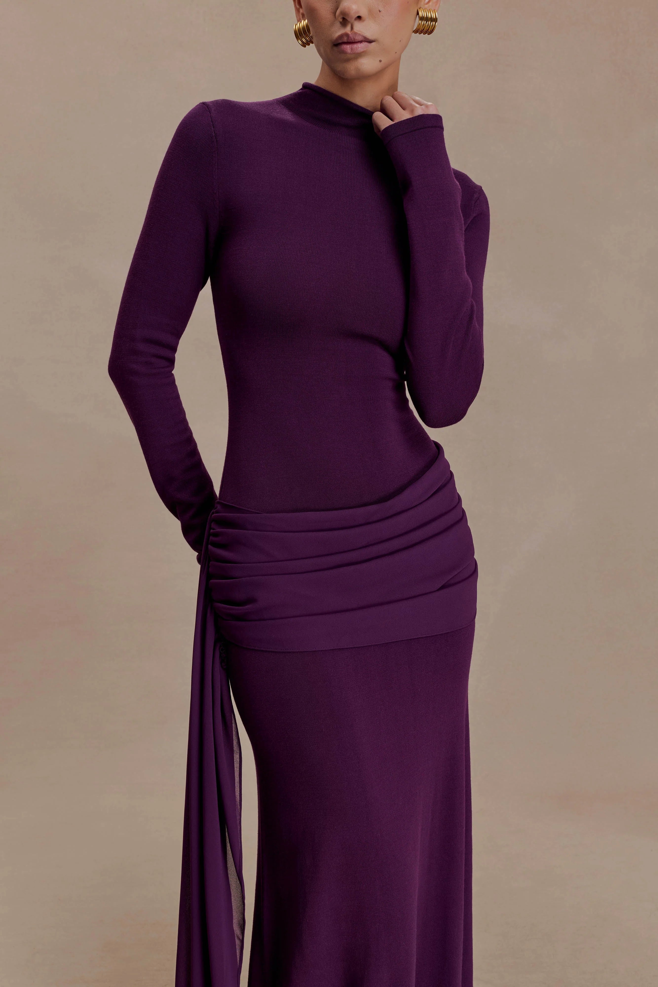 The GRAYSON Knit Chiffon Maxi Dress brings together the structure of knitwear with the fluidity of chiffon. Designed with a high neckline and long sleeves, it’s cut to a bodycon fit through the torso before falling into an A-line skirt that flows gracefully with every step. A chiffon draped overlay detail adds soft dimension and movement, balancing texture with ease. Unlined for a lightweight feel, this dress embodies understated sophistication — refined, modern, and effortlessly wearable.