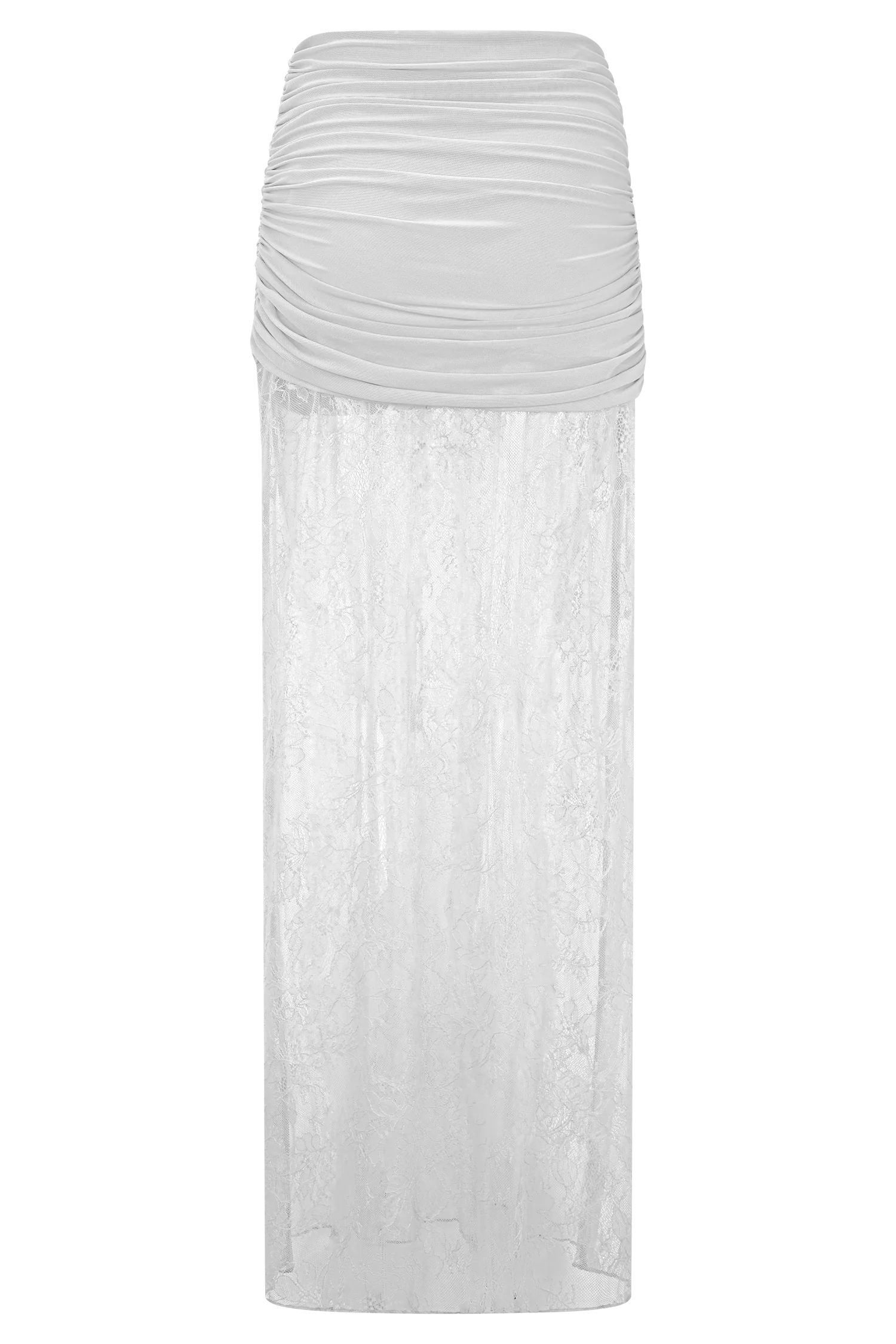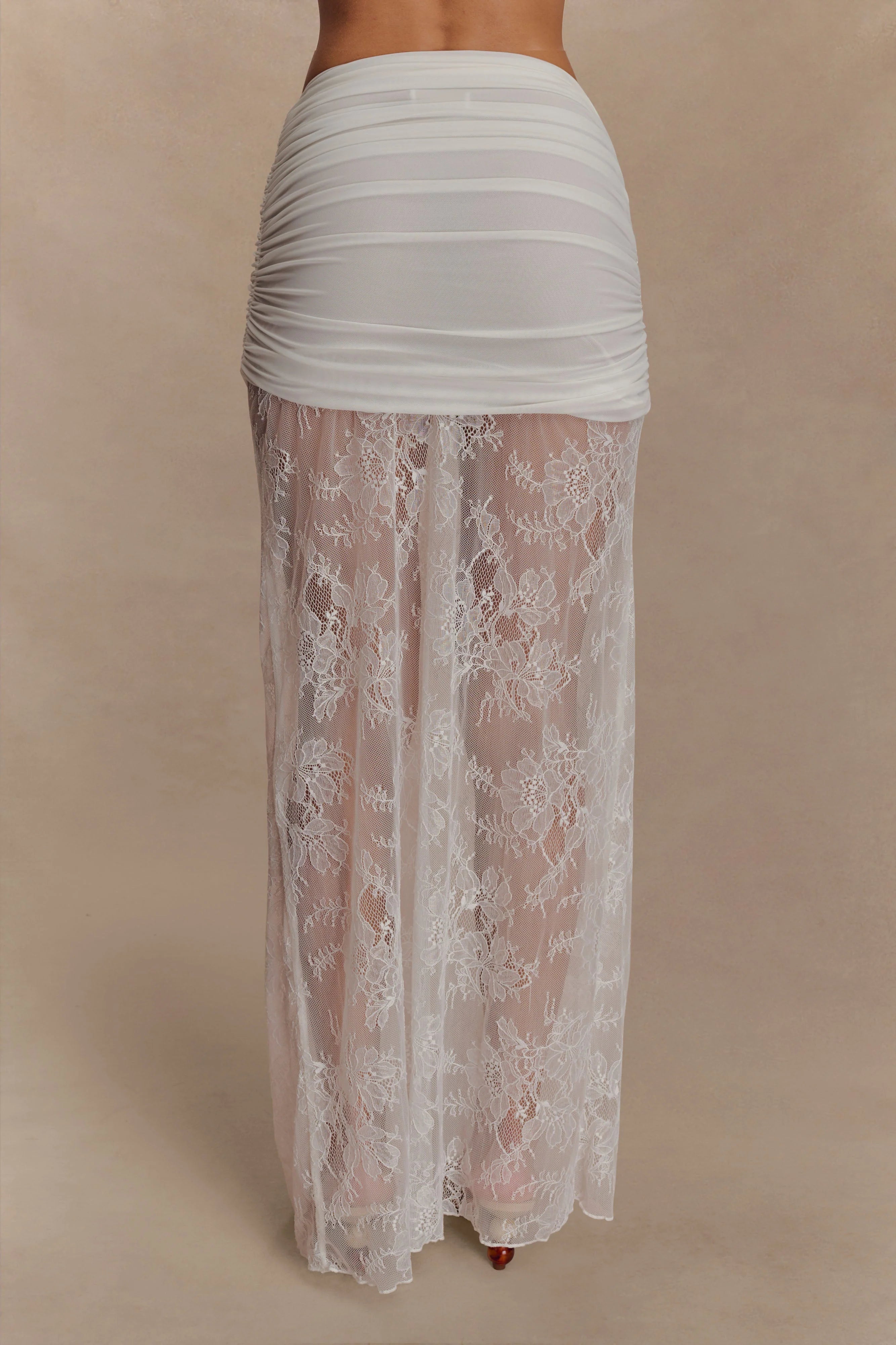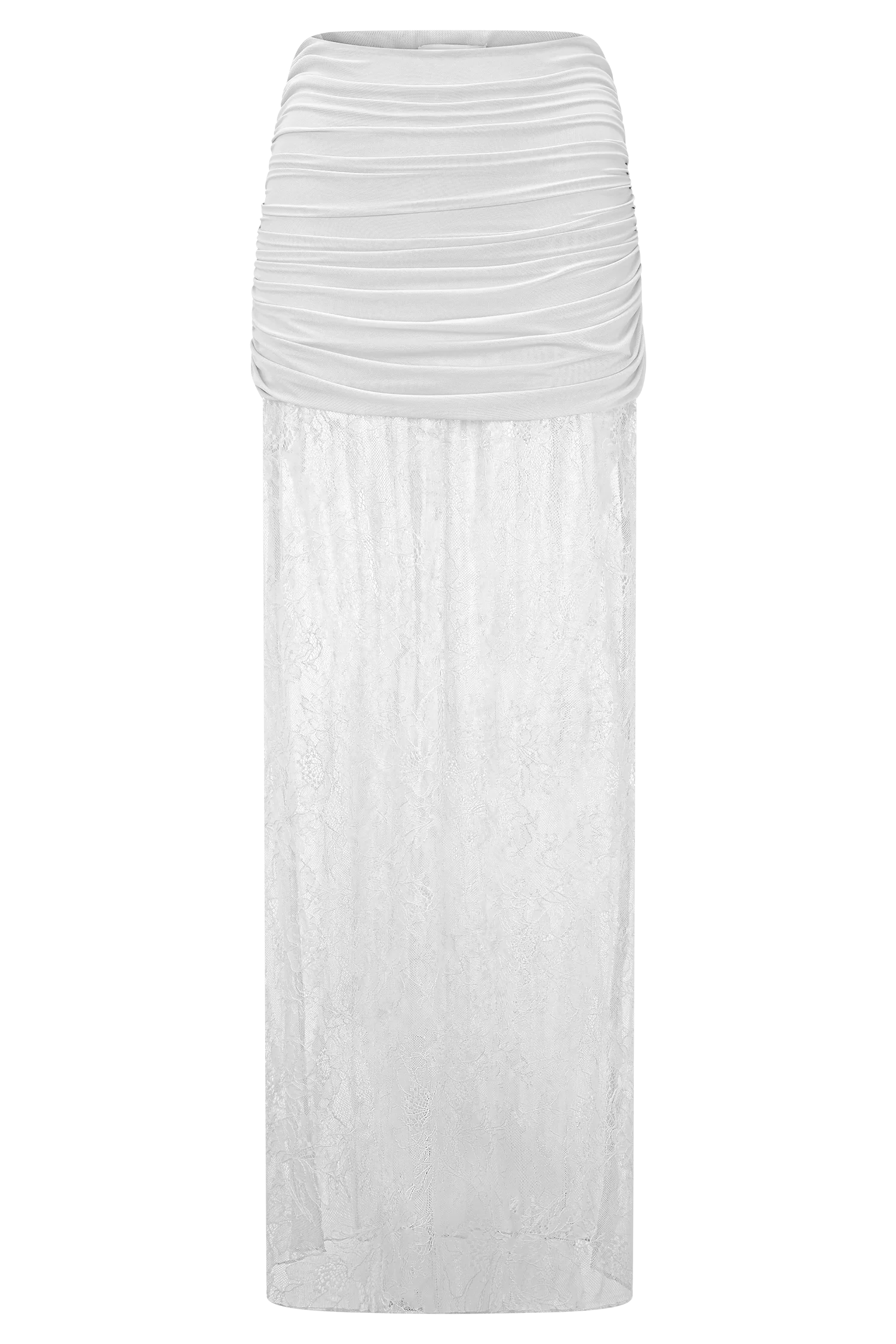 The GUINEVERE Lace and Mesh Maxi Skirt brings a delicate balance of texture and movement to your occasionwear wardrobe. Designed with a high waisted fit, this maxi skirt features a sheer mesh overlay with a lace underskirt, creating soft contrast and visual depth. The fitted waist flatters, while the relaxed hem adds graceful flow. With a slip-on design and partially lined finish, it offers ease without compromising on drama.