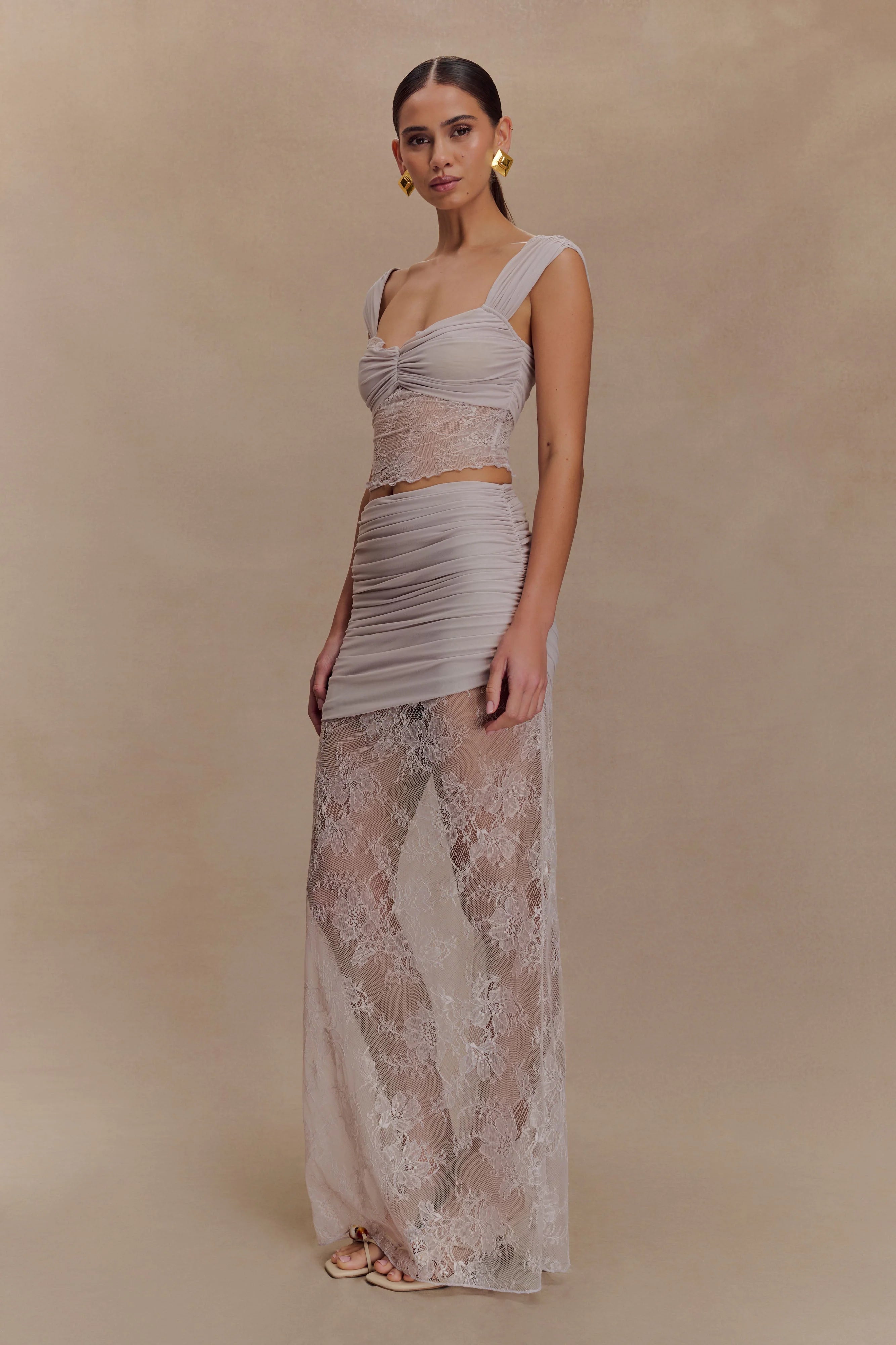 The GUINEVERE Lace and Mesh Maxi Skirt brings a delicate balance of texture and movement to your occasionwear wardrobe. Designed with a high waisted fit, this maxi skirt features a sheer mesh overlay with a lace underskirt, creating soft contrast and visual depth. The fitted waist flatters, while the relaxed hem adds graceful flow. With a slip-on design and partially lined finish, it offers ease without compromising on drama. Pair with the for a romantic, coordinated set that’s perfect for day-to-night events.