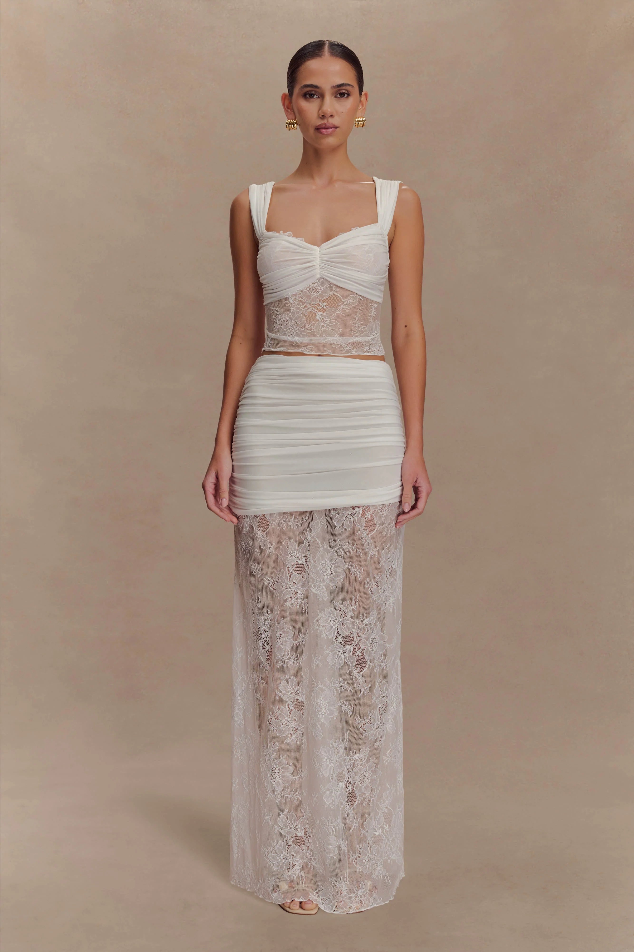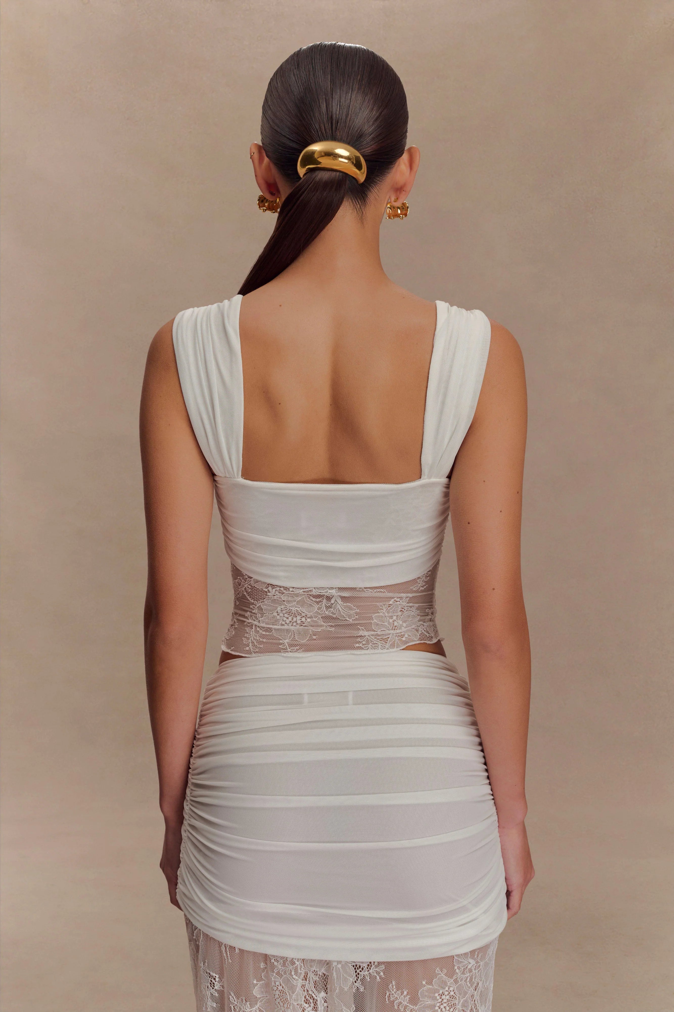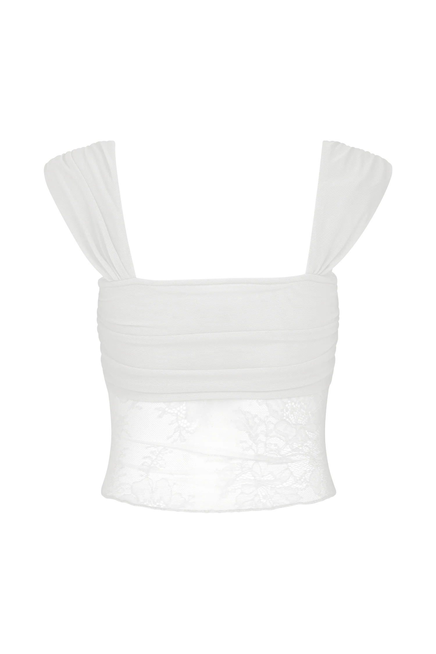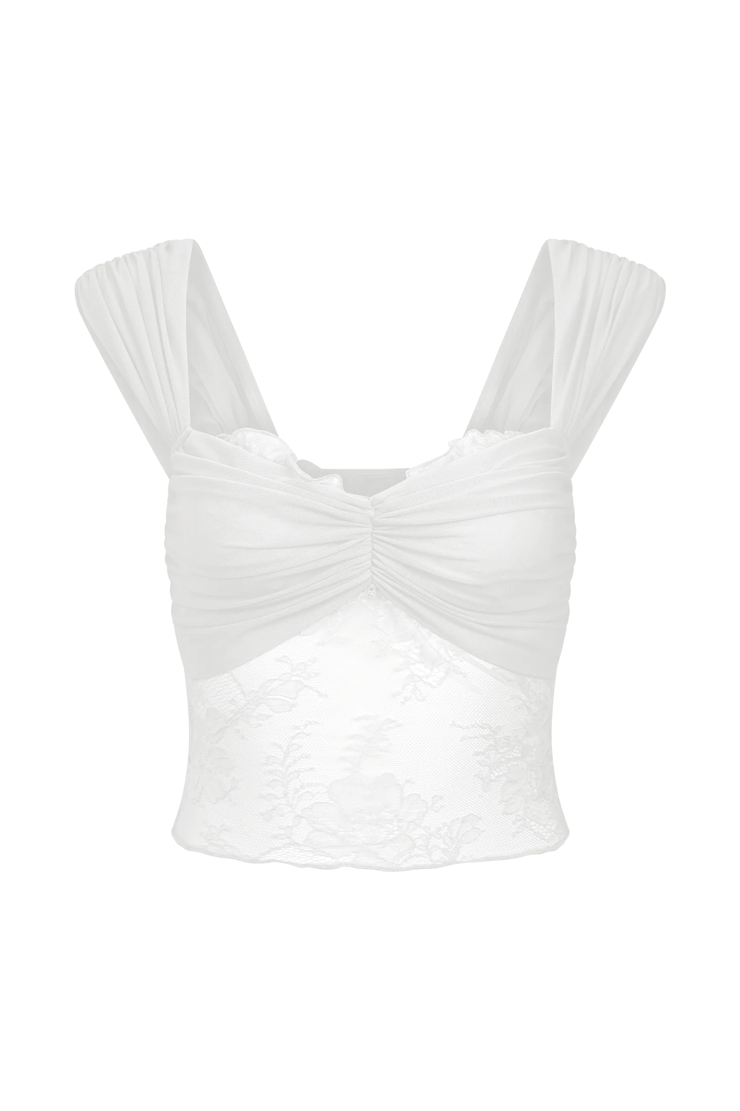 The GUINEVERE Lace and Mesh Top is a feminine statement piece designed to captivate. Featuring a sweetheart neckline and ruched cap sleeves, this cropped silhouette combines delicate mesh and lace panels for a beautifully textured finish. A ruched bust adds soft volume, while the open back brings an unexpected edge. Partially lined for comfort and sheerness in all the right places.
