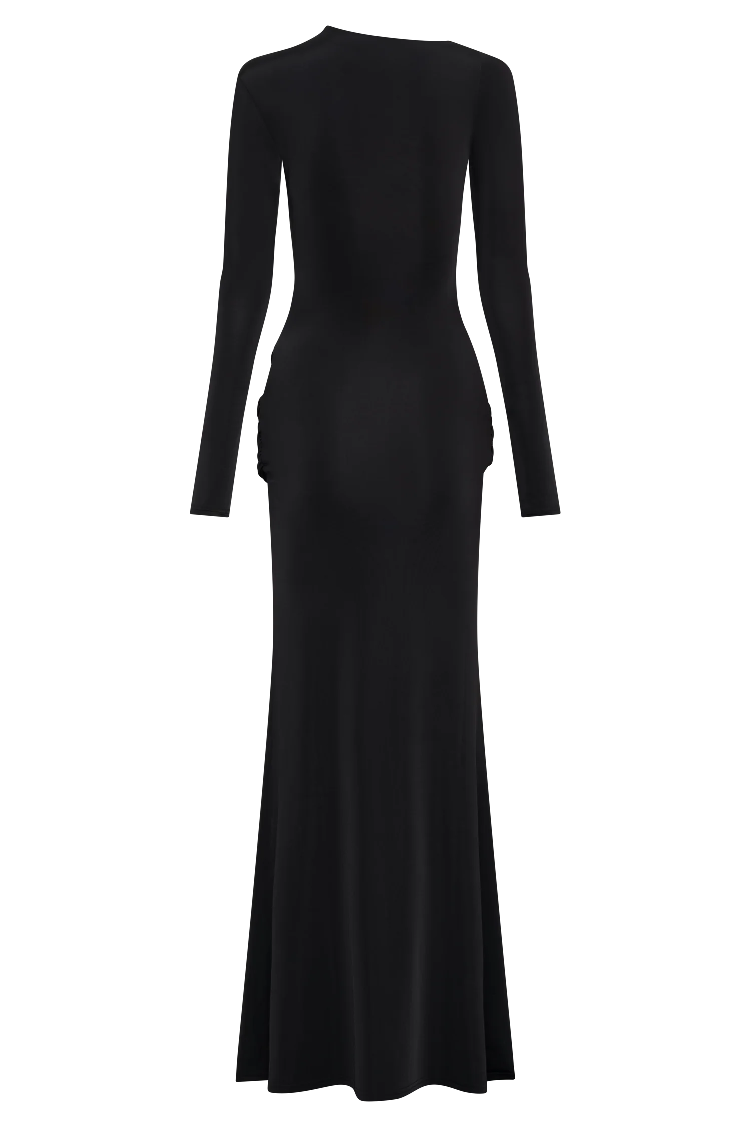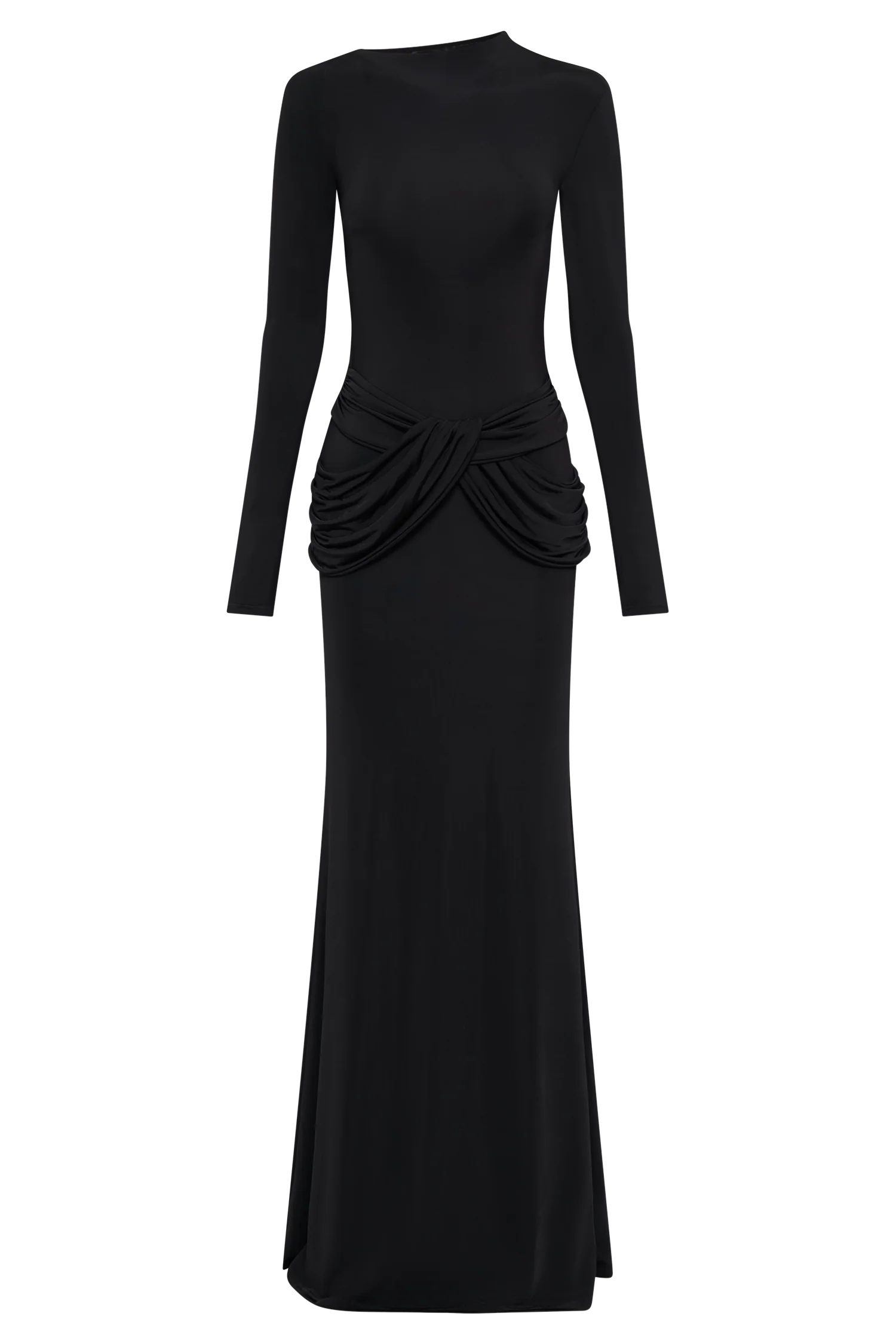 The HALCYON Long Sleeve Slinky Maxi Dress is a stunning and elegant choice for any formal event. It features an asymmetrical neckline and long sleeves, creating a sleek and sophisticated silhouette. The twist overlay detailing at the front hip adds a unique touch, while the fishtail hem shape and maxi length provide a dramatic and graceful finish. Fully lined for comfort, this dress combines style and elegance effortlessly.