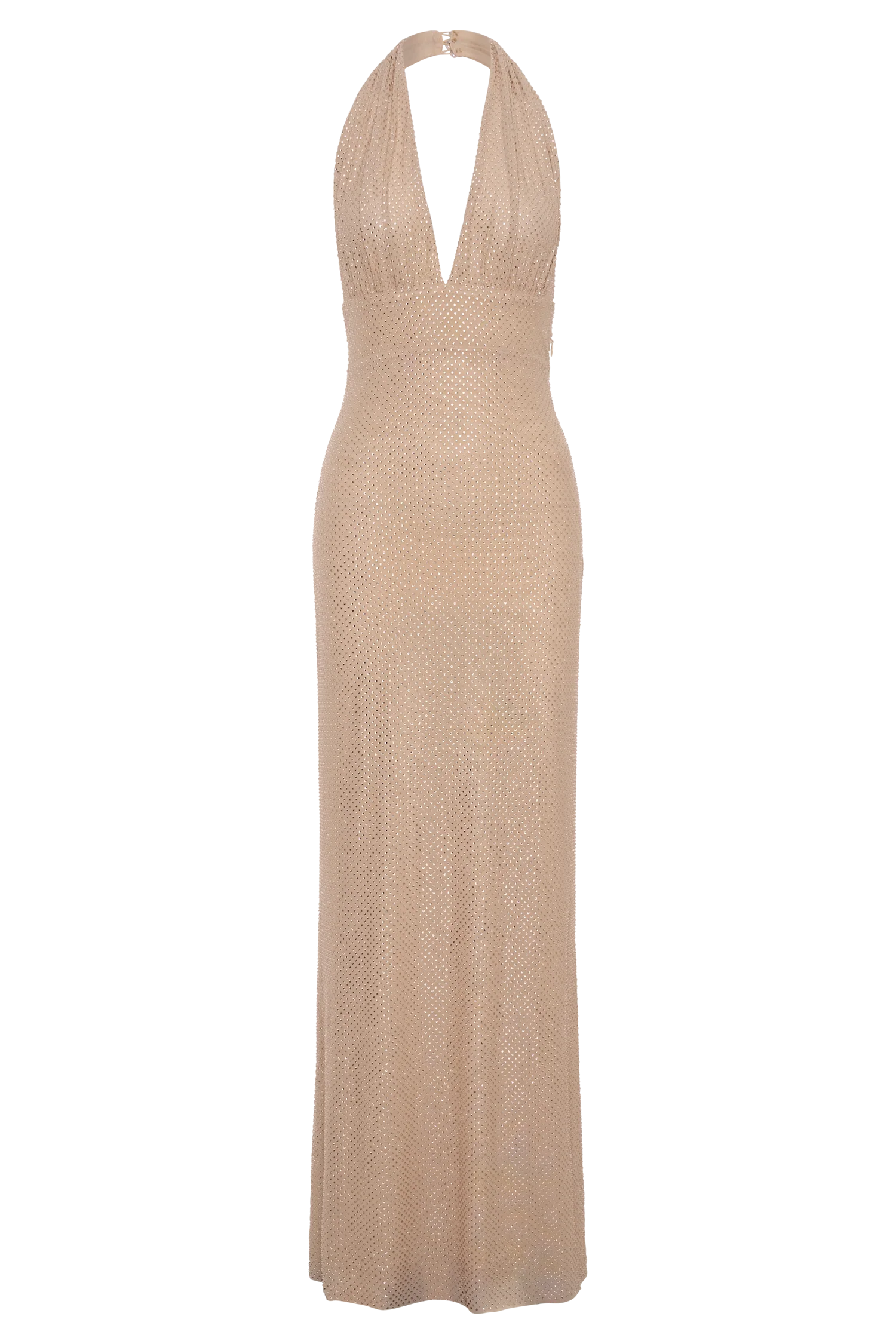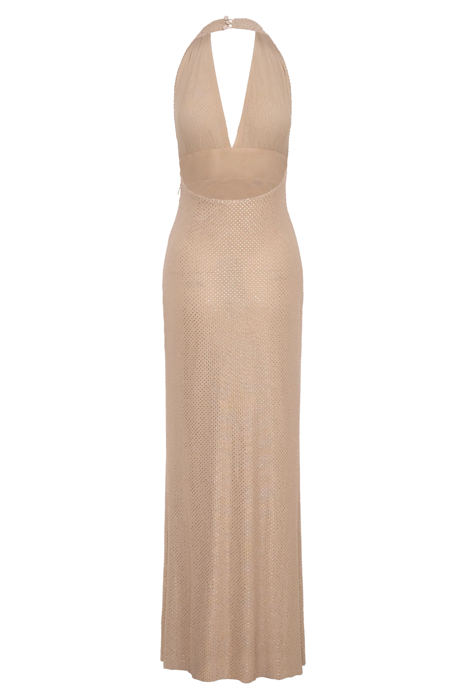 The HARRIET Halter Neck Diamante Maxi Dress is designed to shine under every spotlight. Featuring a halter neckline with a plunging V front, it fastens with a back neck button closure for a clean, secure finish. Gathering at the bust adds soft texture, while the fitted bodycon silhouette skims the frame to a floor-length hem. Fully mesh lined and completed with an invisible side zip, this dress delivers sleek glamour with a confident edge—perfect for statement evenings.