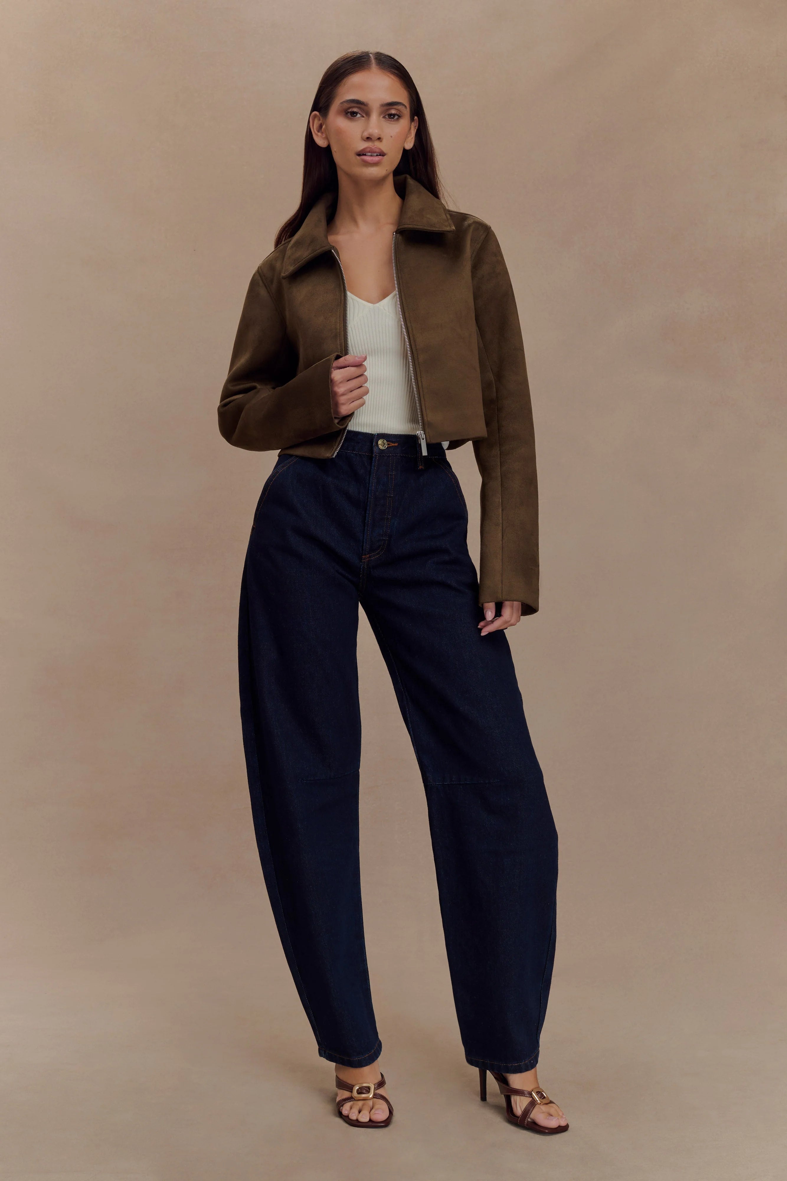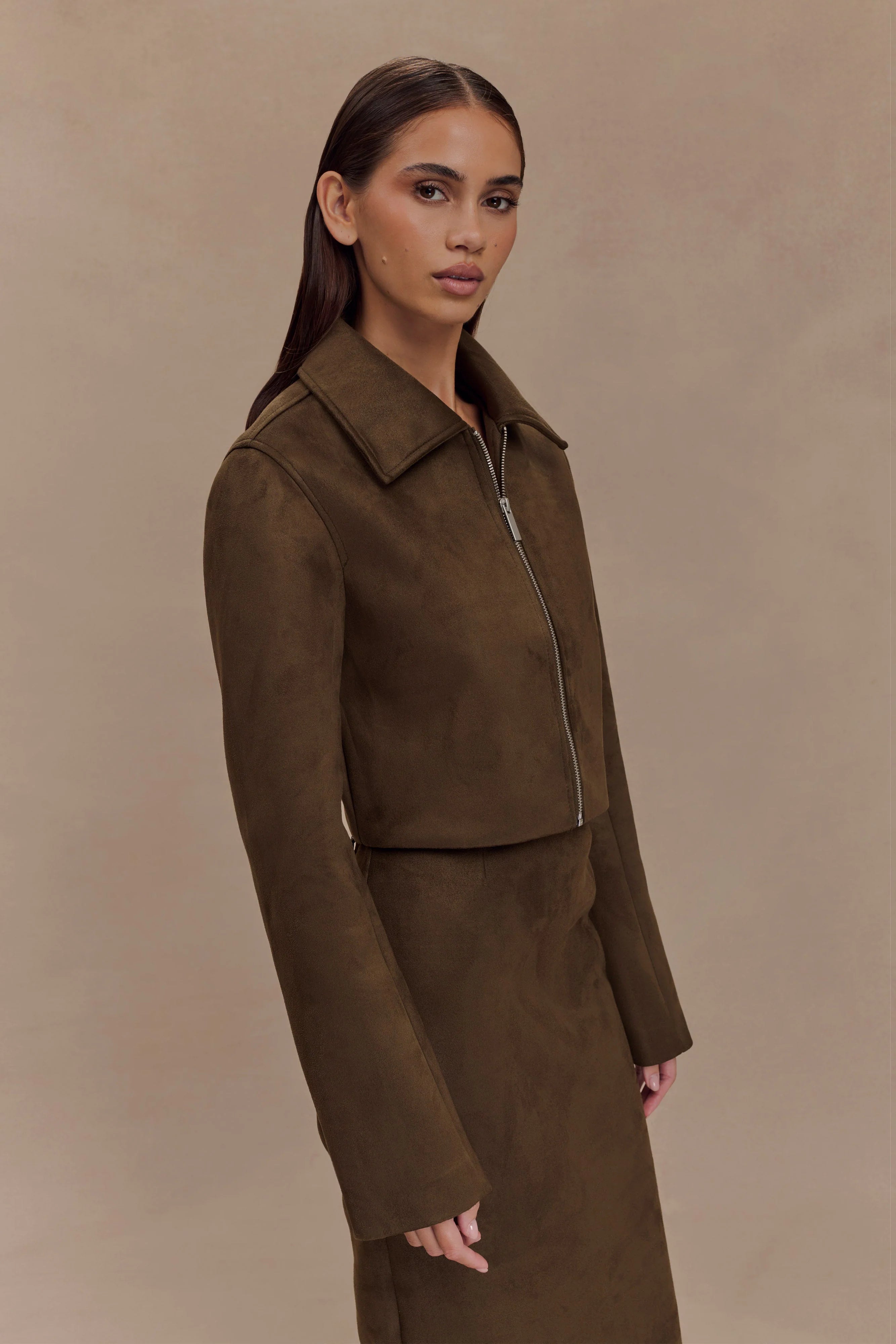Meet the HAYES Faux Suede Collared Jacket, a cropped silhouette crafted in buttery-soft faux suede for the perfect blend of structure and ease. Featuring a classic collared neckline, zip front closure, and long sleeves, this straight-fit jacket is fully lined for added comfort and refinement. Pair with the for a coordinated look that’s effortlessly elevated and endlessly versatile.