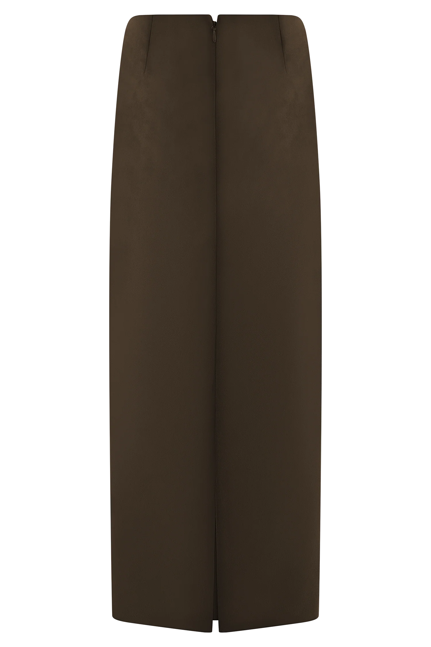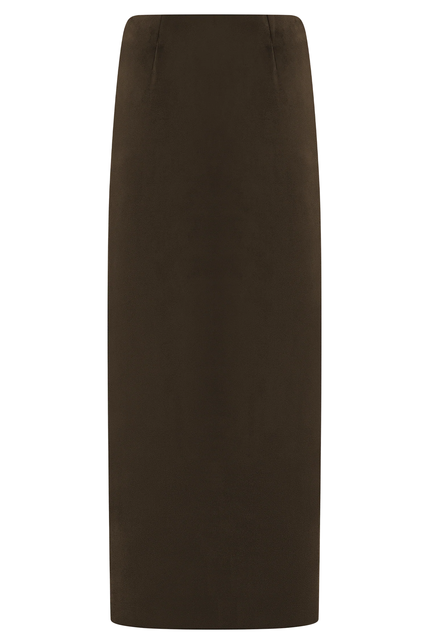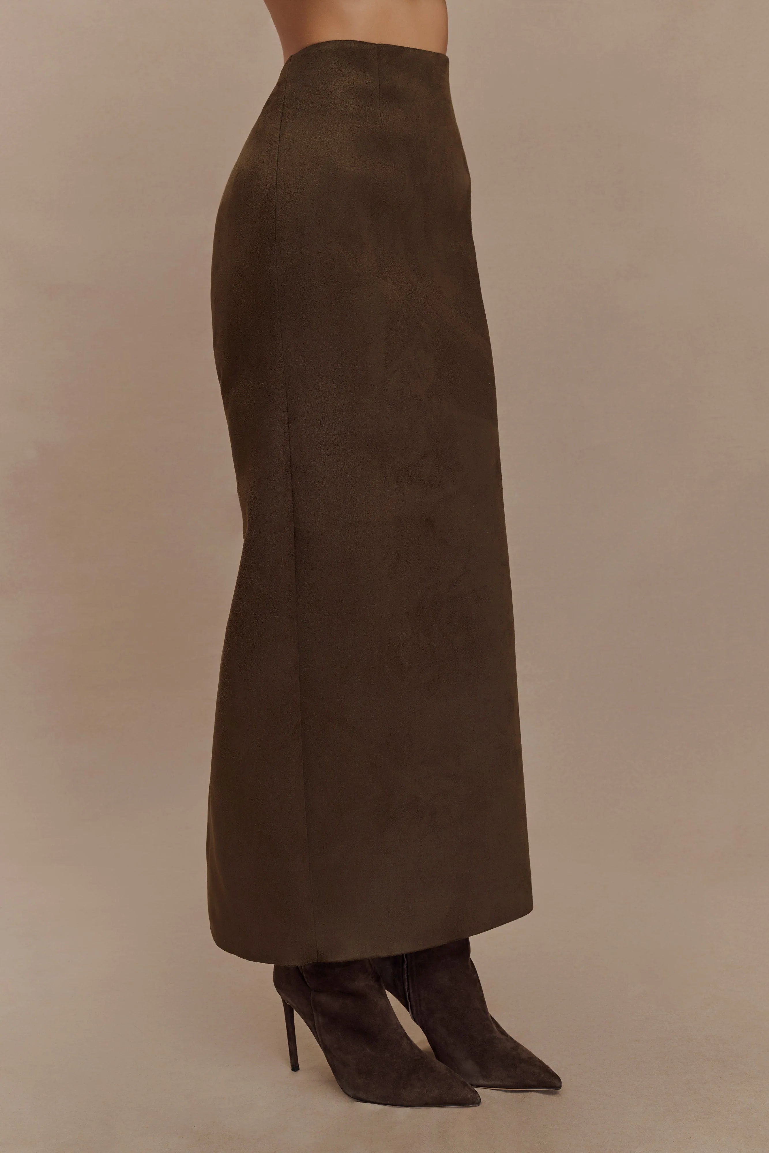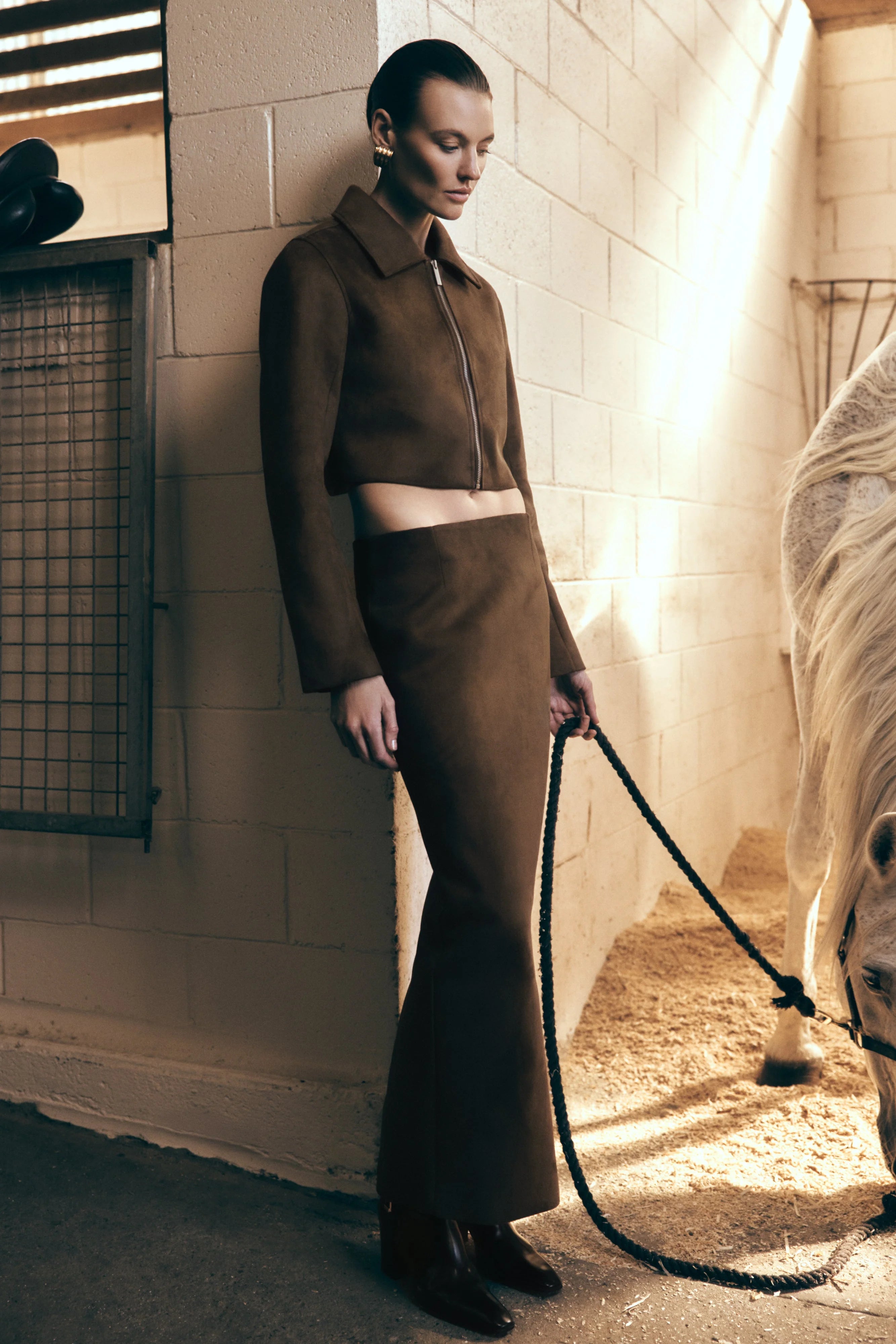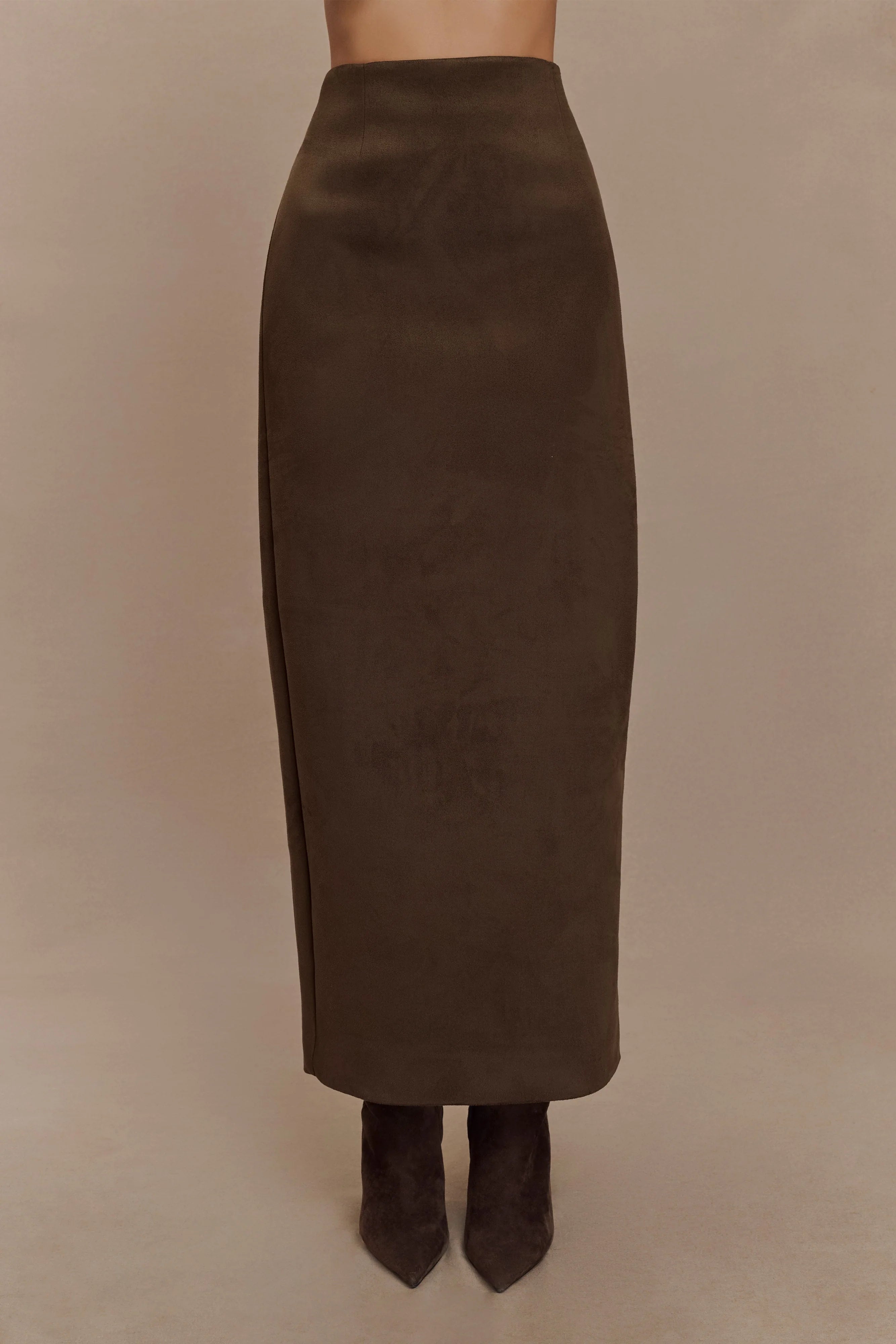 Refine your wardrobe with the HAYES Faux Suede Midi Skirt, a high-waisted staple crafted in luxe faux suede for a smooth, structured fit. This maxi-length silhouette features a front fly opening, belt loops, and back patch pockets for a subtle nod to utilitarian style. A centre back split adds ease of movement, while the full lining ensures all-day comfort. Designed to pair seamlessly with the , this set delivers effortless coordination with elevated edge.
