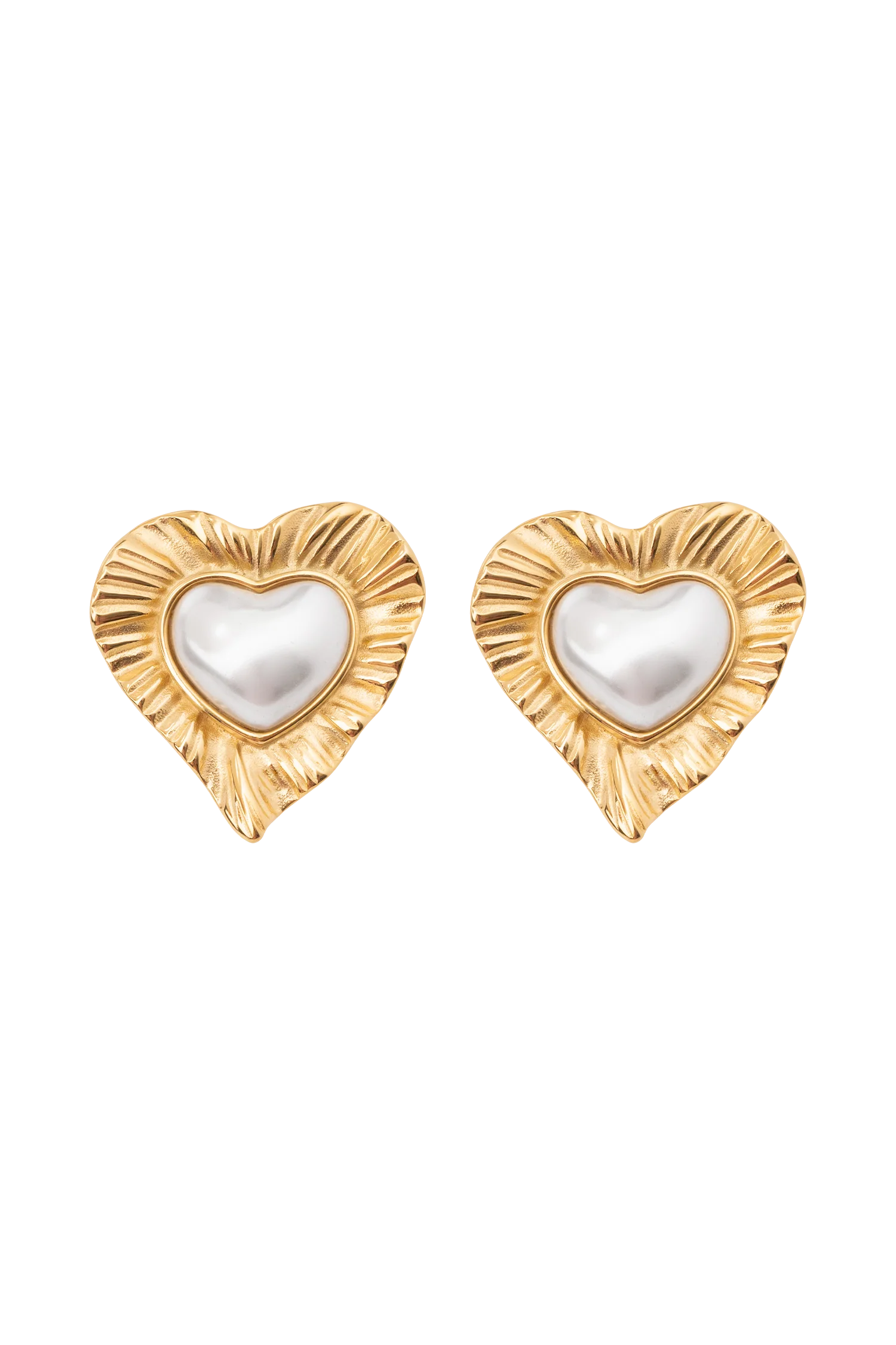 The HEART TO HEART Pearl Earrings are a perfect blend of romance and sophistication. Featuring gold organic heart shapes with a textured finish, these earrings are accented by delicate pearl hearts for a touch of charm. Designed with a stud post and butterfly back, they ensure a secure and comfortable fit. Perfect for adding a romantic touch to any outfit, these earrings are a must-have for your jewelry collection.