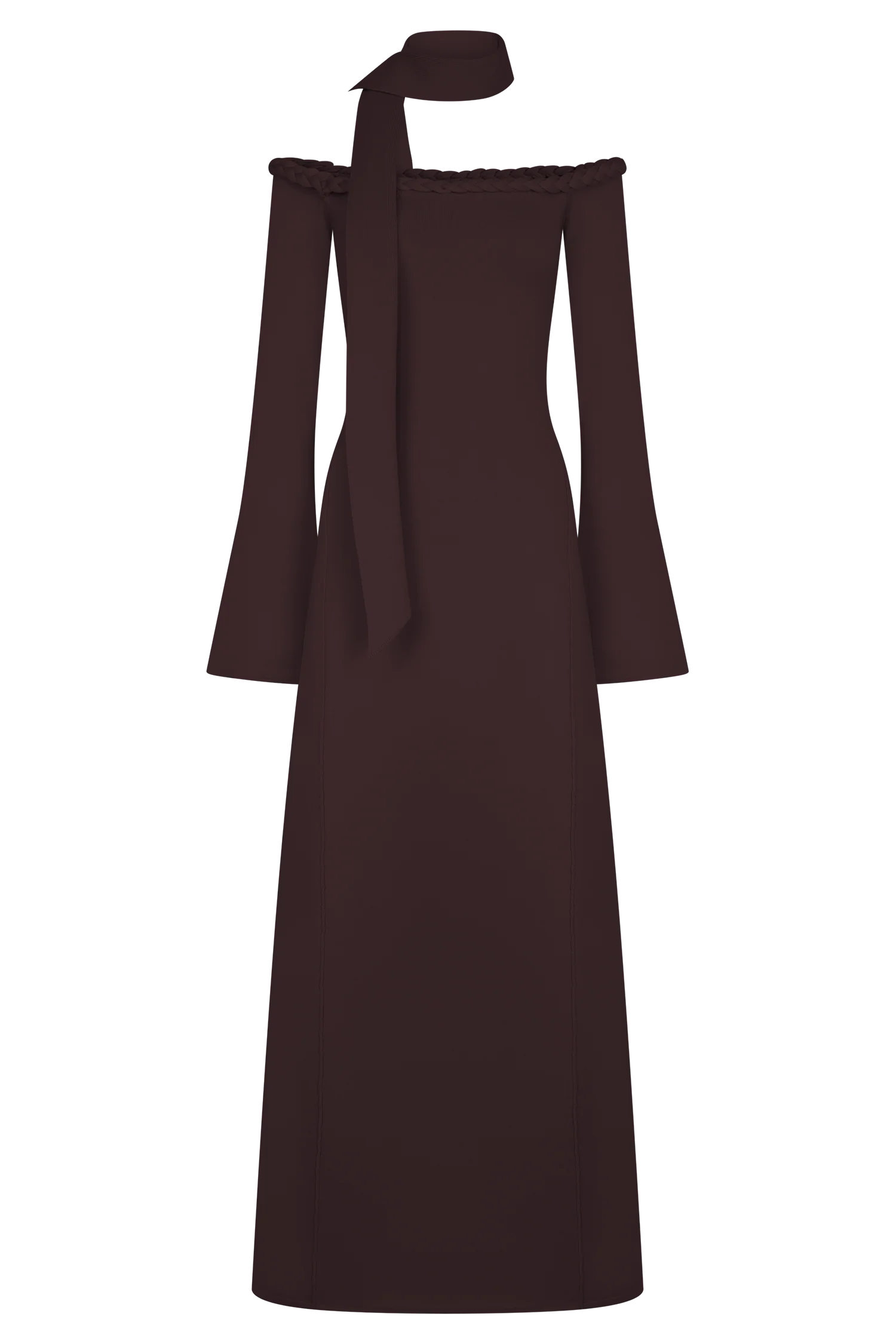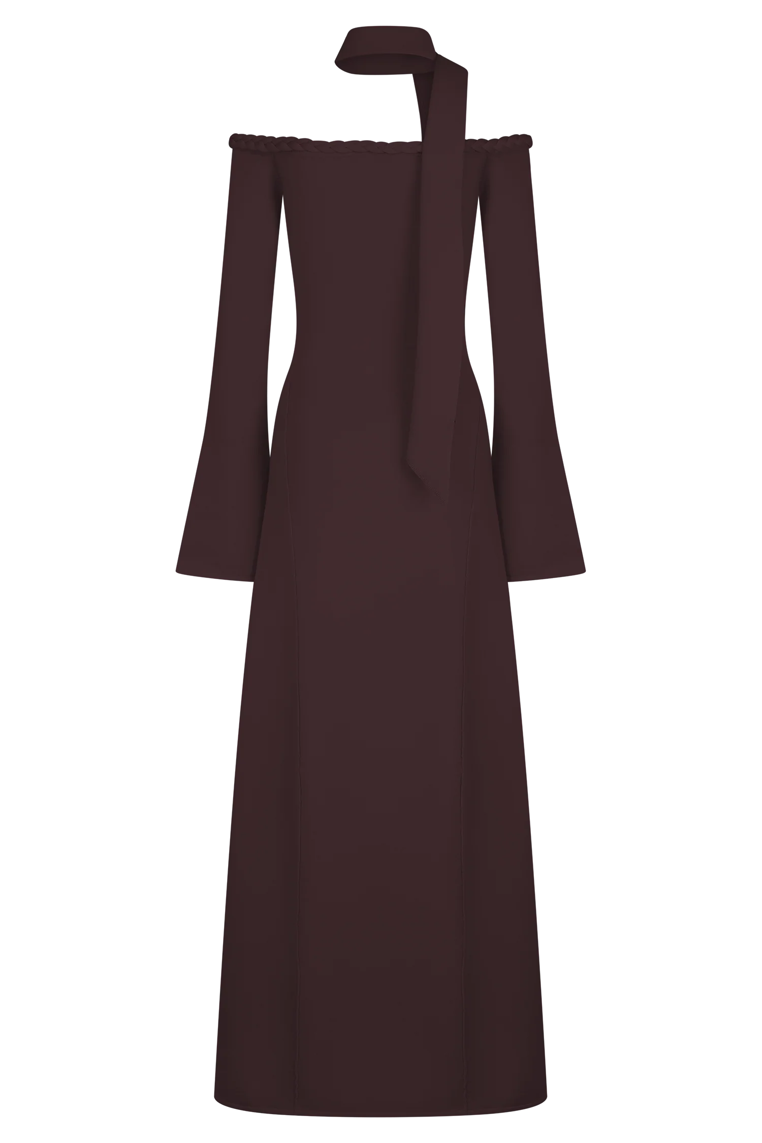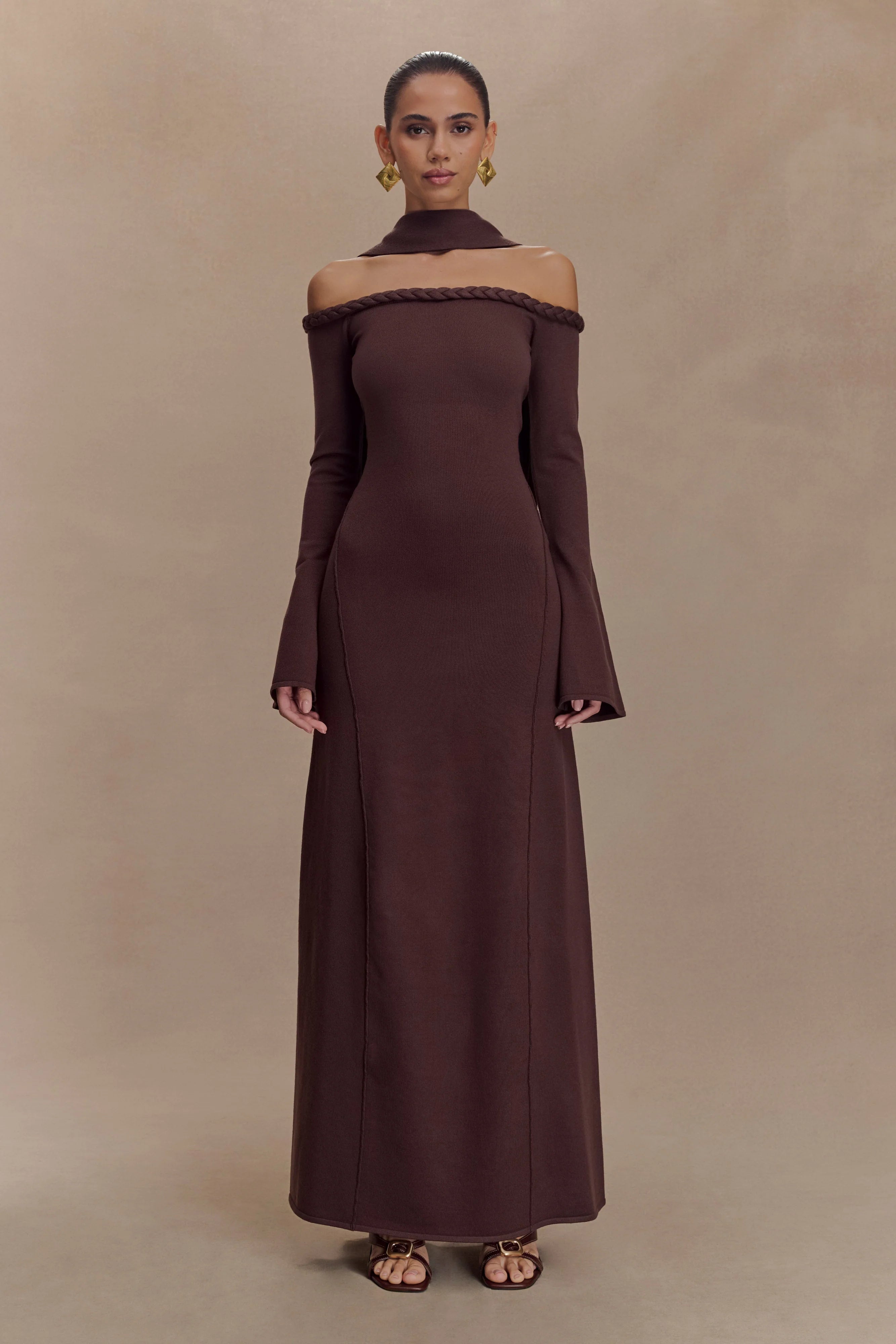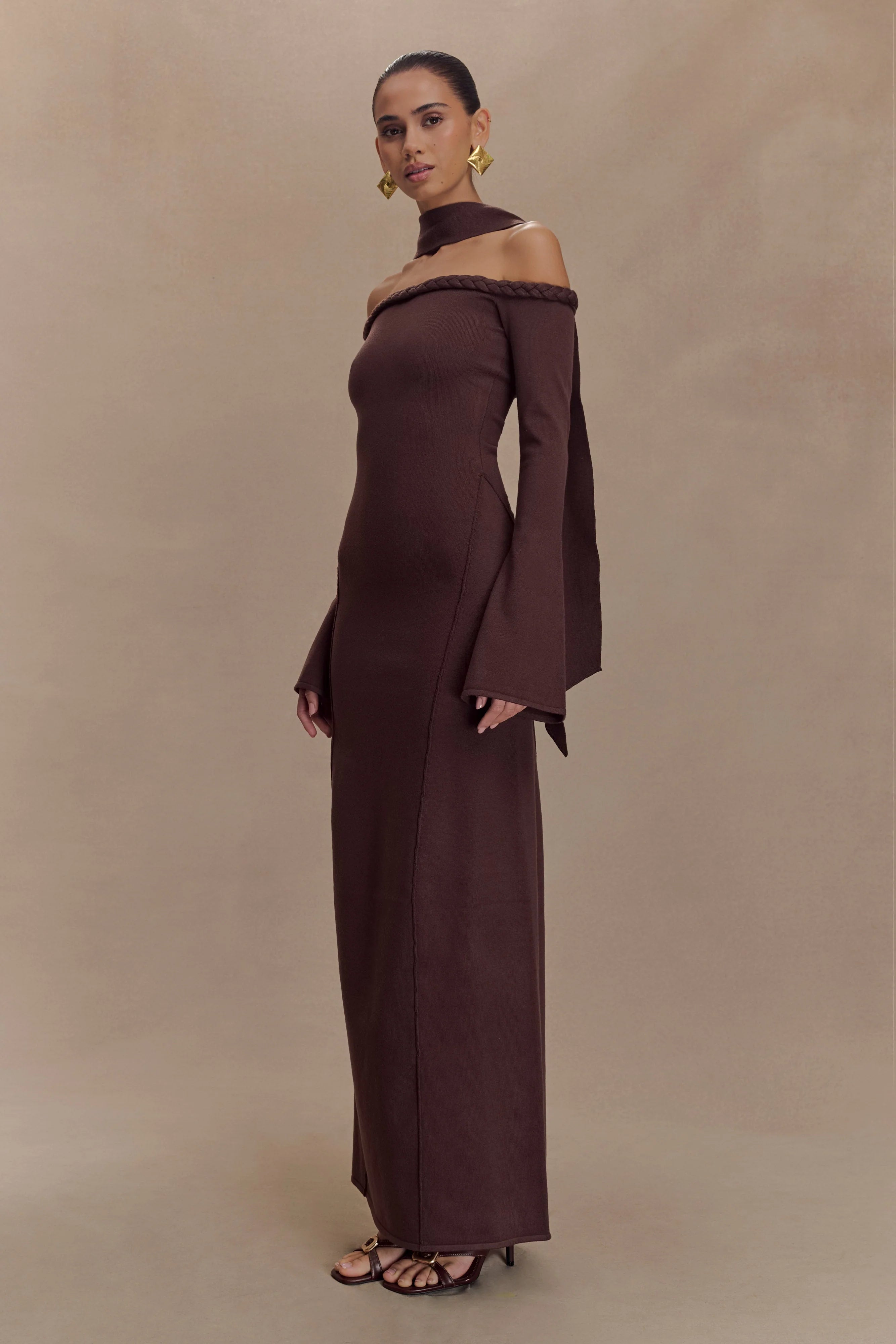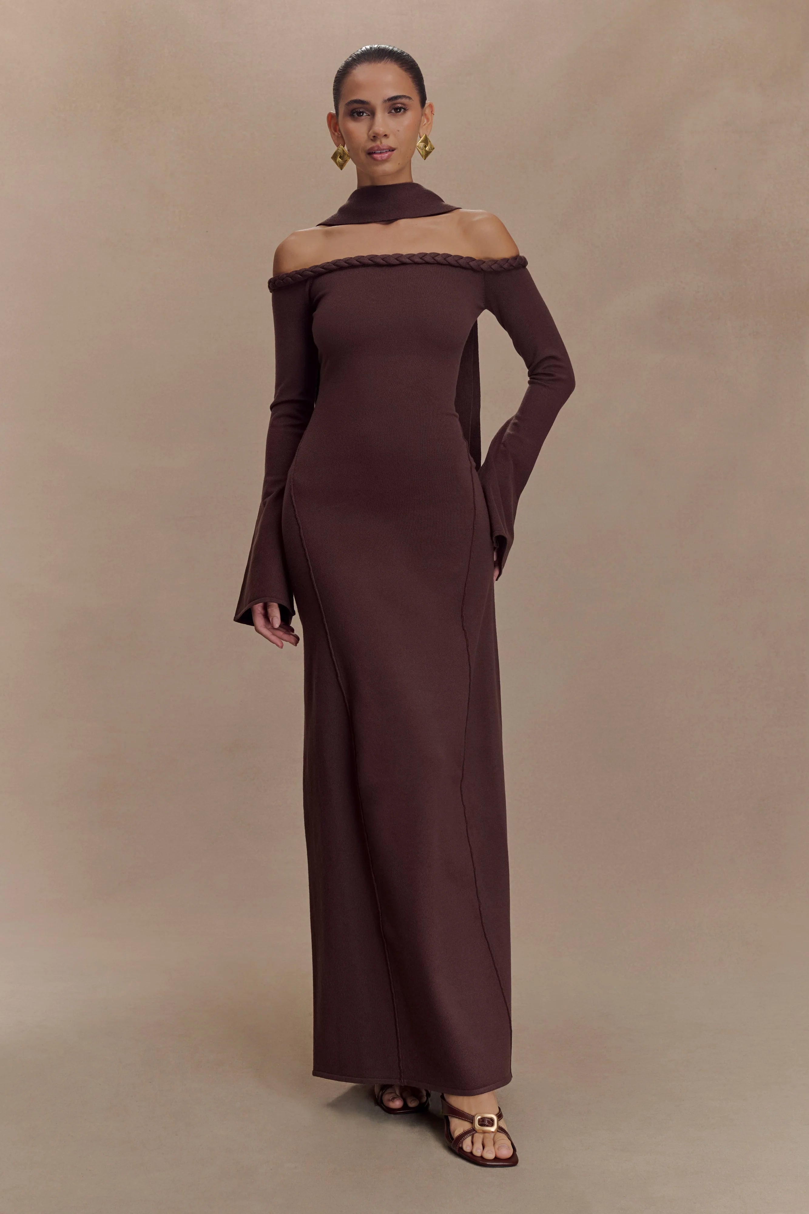 The HEIDI Strapless Knit Scarf Maxi Dress is a statement in sculpted elegance. Featuring a Bardot neckline and long sleeves with flared hems, this form-fitting silhouette gently flares into a fluid hem for graceful movement. Skirt paneling adds subtle structure, while the detachable scarf offers styling versatility—drape it, wrap it, or wear it your way. Perfect for cooler evenings or elevated daywear, this dress delivers modern femininity with a soft, statement-making twist.