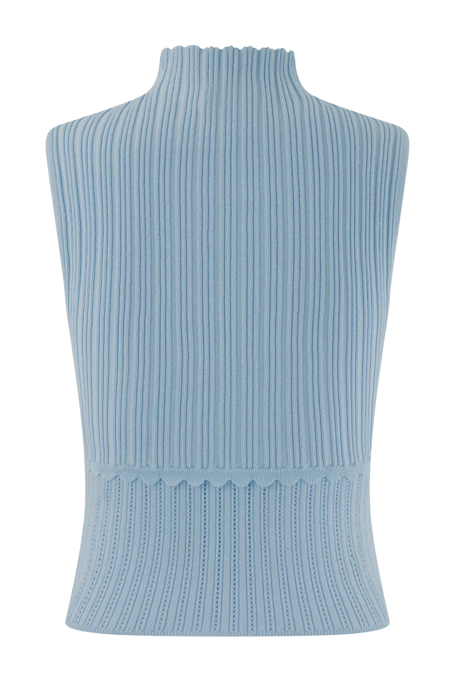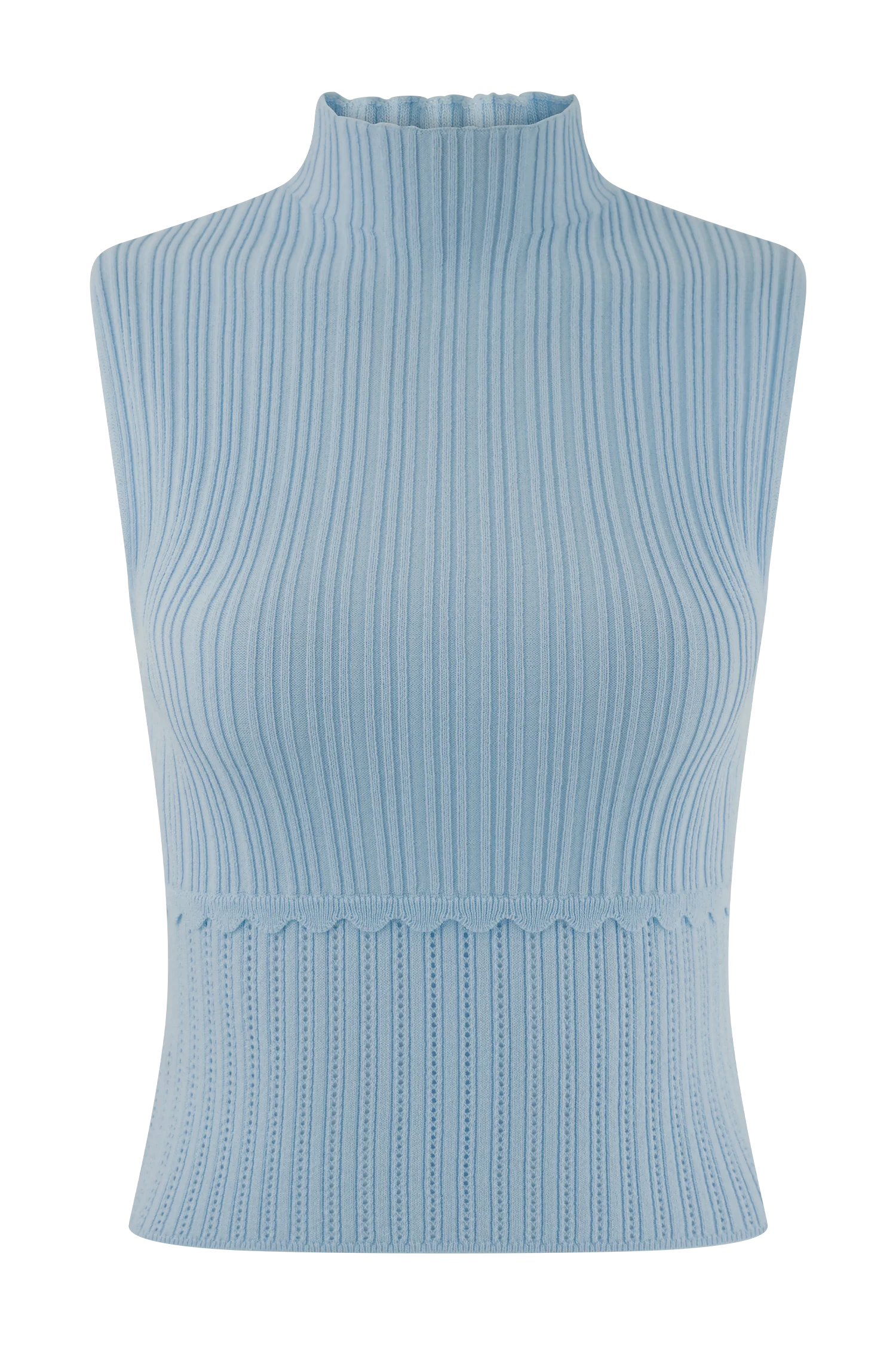 The INDY Pointelle Knit Top is a refined take on modern femininity. Designed with a high neckline and a sleeveless silhouette, this fitted top hugs the body while offering a delicate, textured appeal. Contrast rib detailing on the upper and lower body adds subtle dimension, while a scalloped waist frill brings a soft, romantic touch. Crafted in a pull-on design for effortless wear, this top pairs perfectly with the matching skirt for a coordinated look that blends sophistication with playful charm.