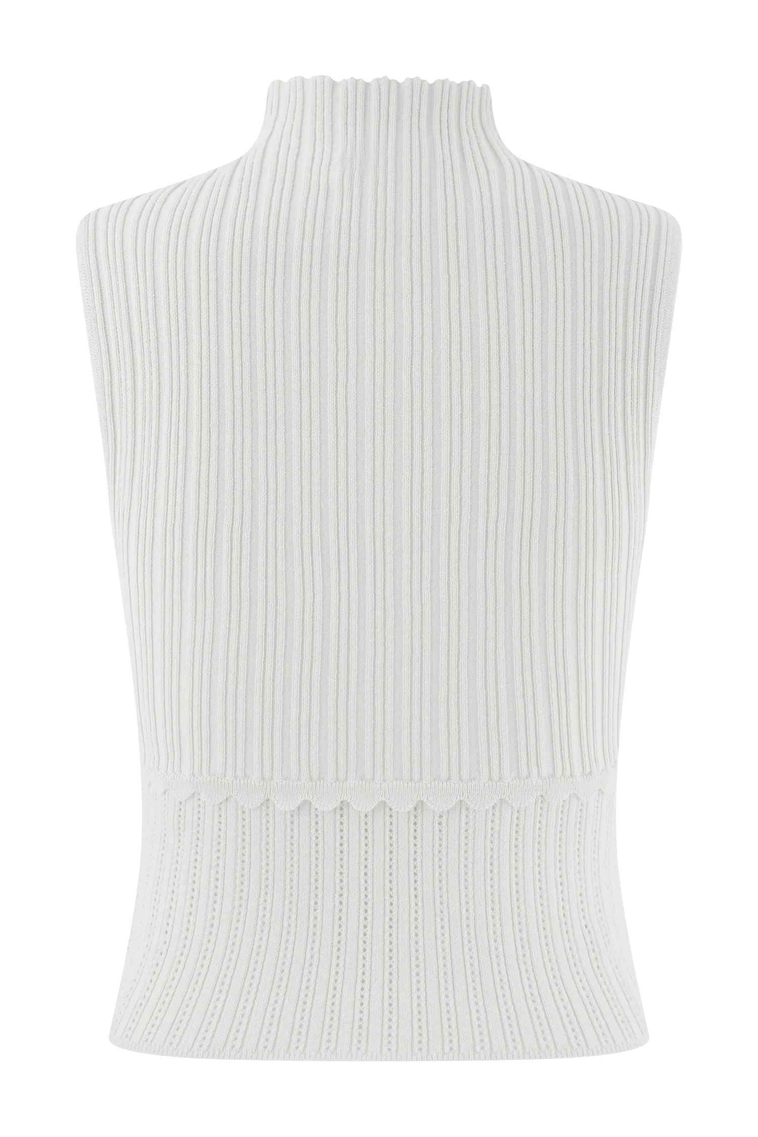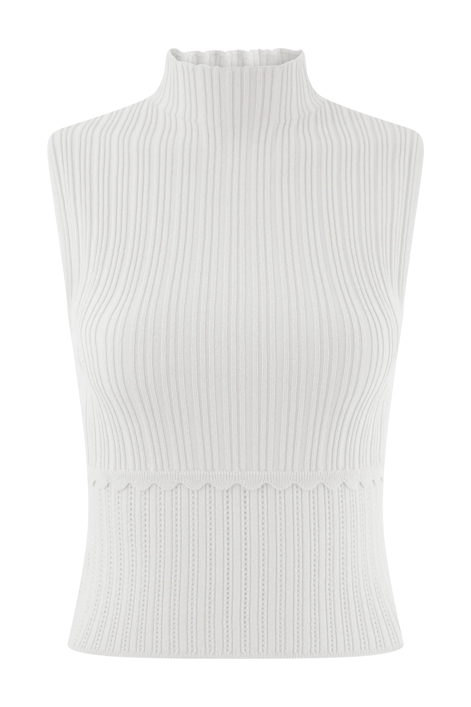 The INDY Pointelle Knit Top is a refined take on modern femininity. Designed with a high neckline and a sleeveless silhouette, this fitted top hugs the body while offering a delicate, textured appeal. Contrast rib detailing on the upper and lower body adds subtle dimension, while a scalloped waist frill brings a soft, romantic touch. Crafted in a pull-on design for effortless wear, this top pairs perfectly with the for a coordinated look that blends sophistication with playful charm.