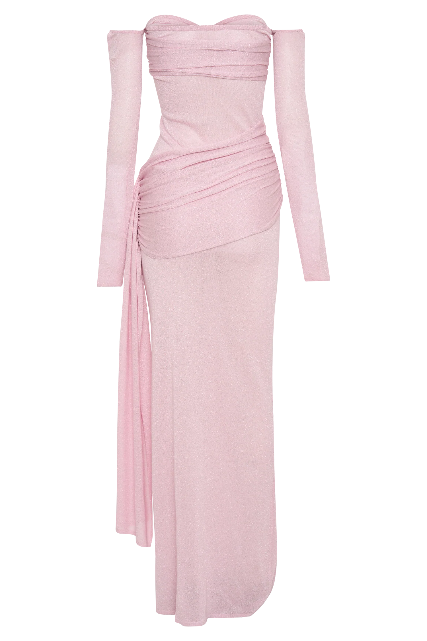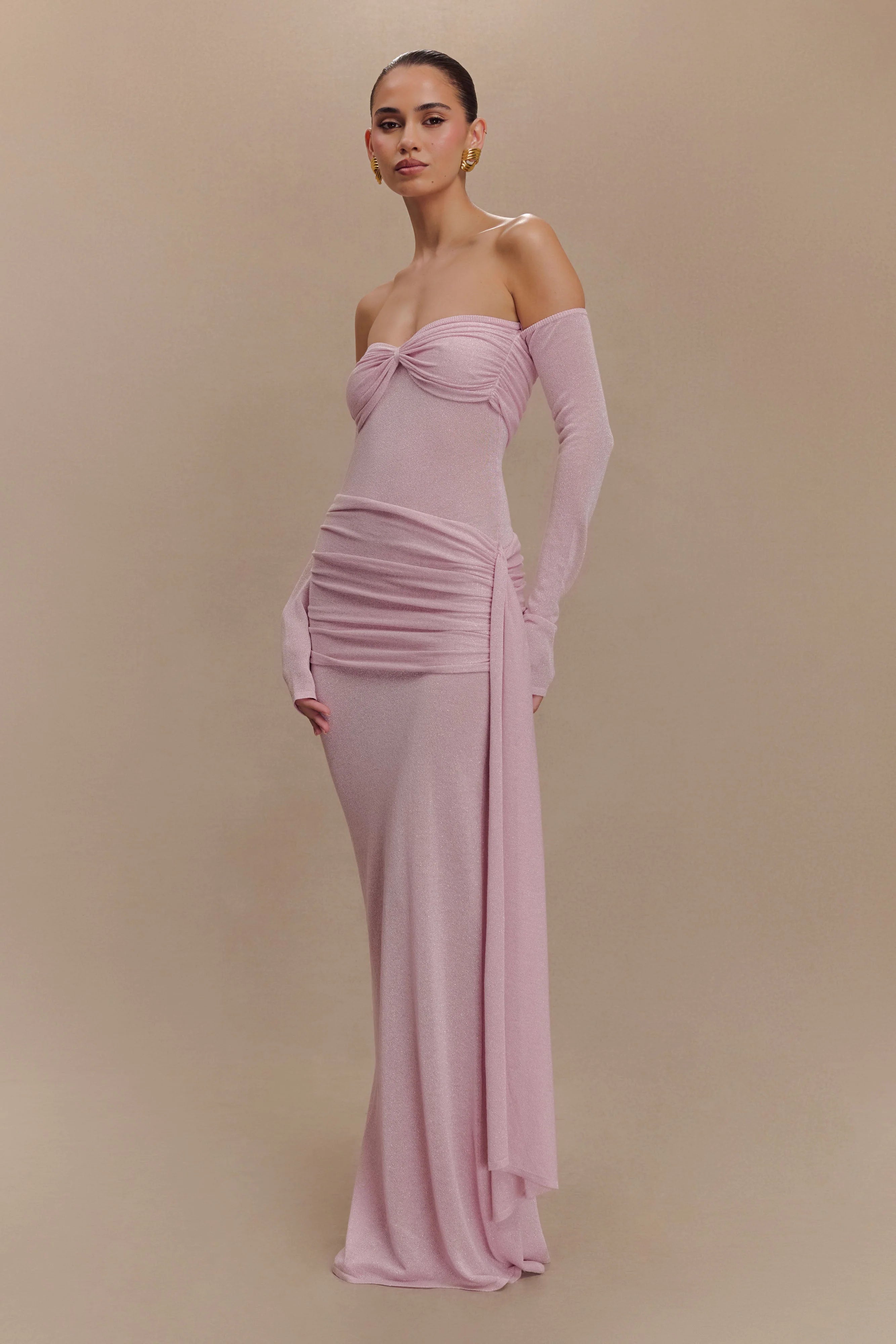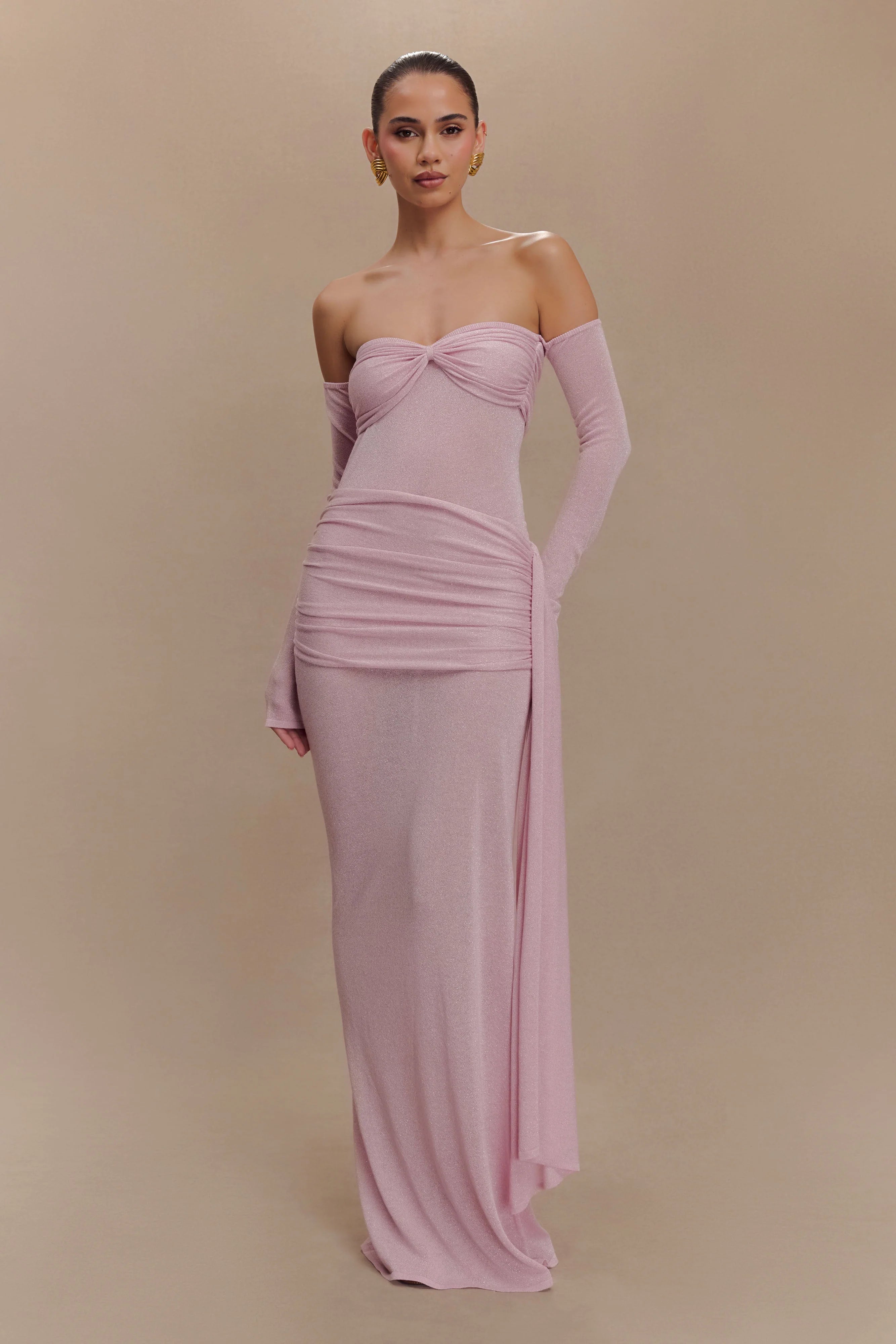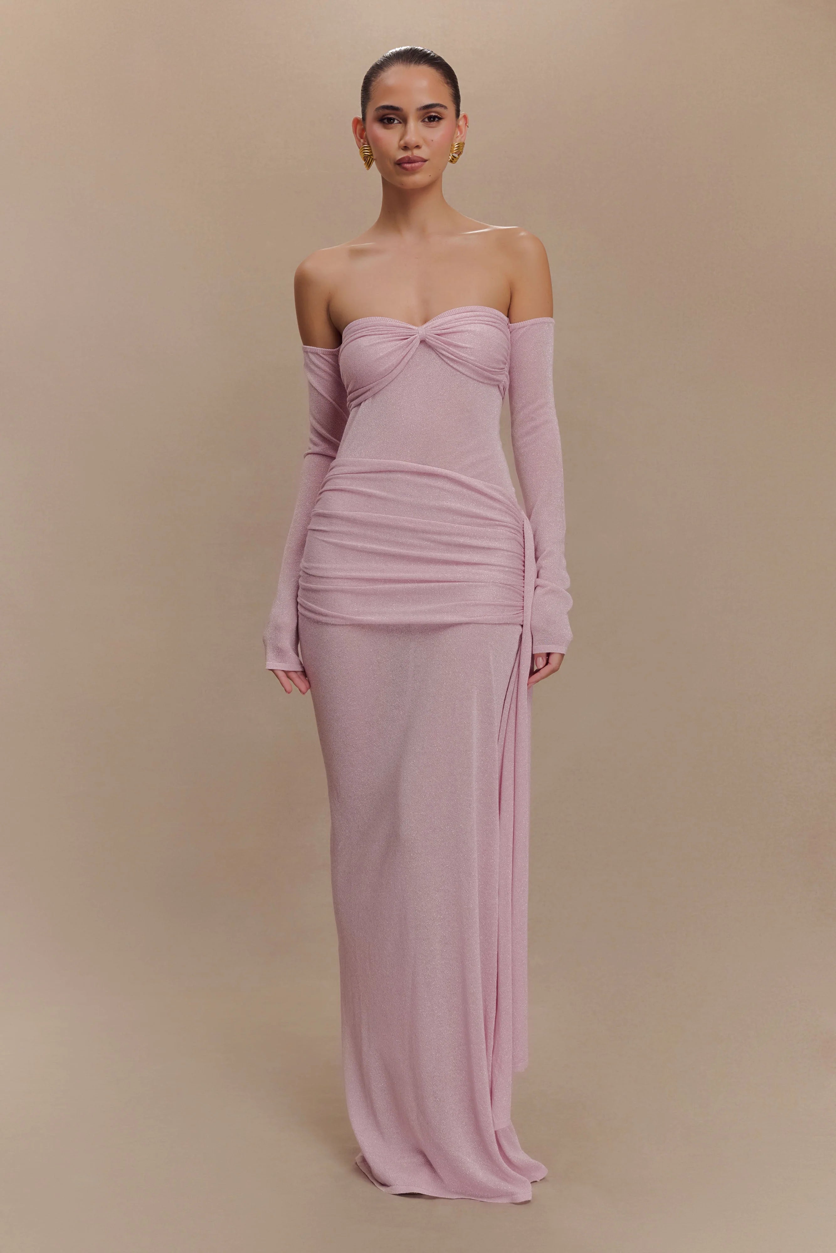 Make a statement with the INGRID Metallic Knit Maxi Dress, a show-stopping blend of glamour and elegance. Featuring a flattering Bardot neckline and long sleeves, this dress is designed for effortless sophistication. The sheer lurex knit, complemented by non-sheer lurex panels at the waist and bust, accentuates your curves while adding a touch of sparkle. The twist front bust detail draws attention and adds intrigue, while the gathered hip panel with sash creates graceful movement and enhances your silhouette. Finished with a dramatic maxi length and an unlined construction for a sleek, modern look, this dress is perfect for special occasions and evening events that demand to be unforgettable.