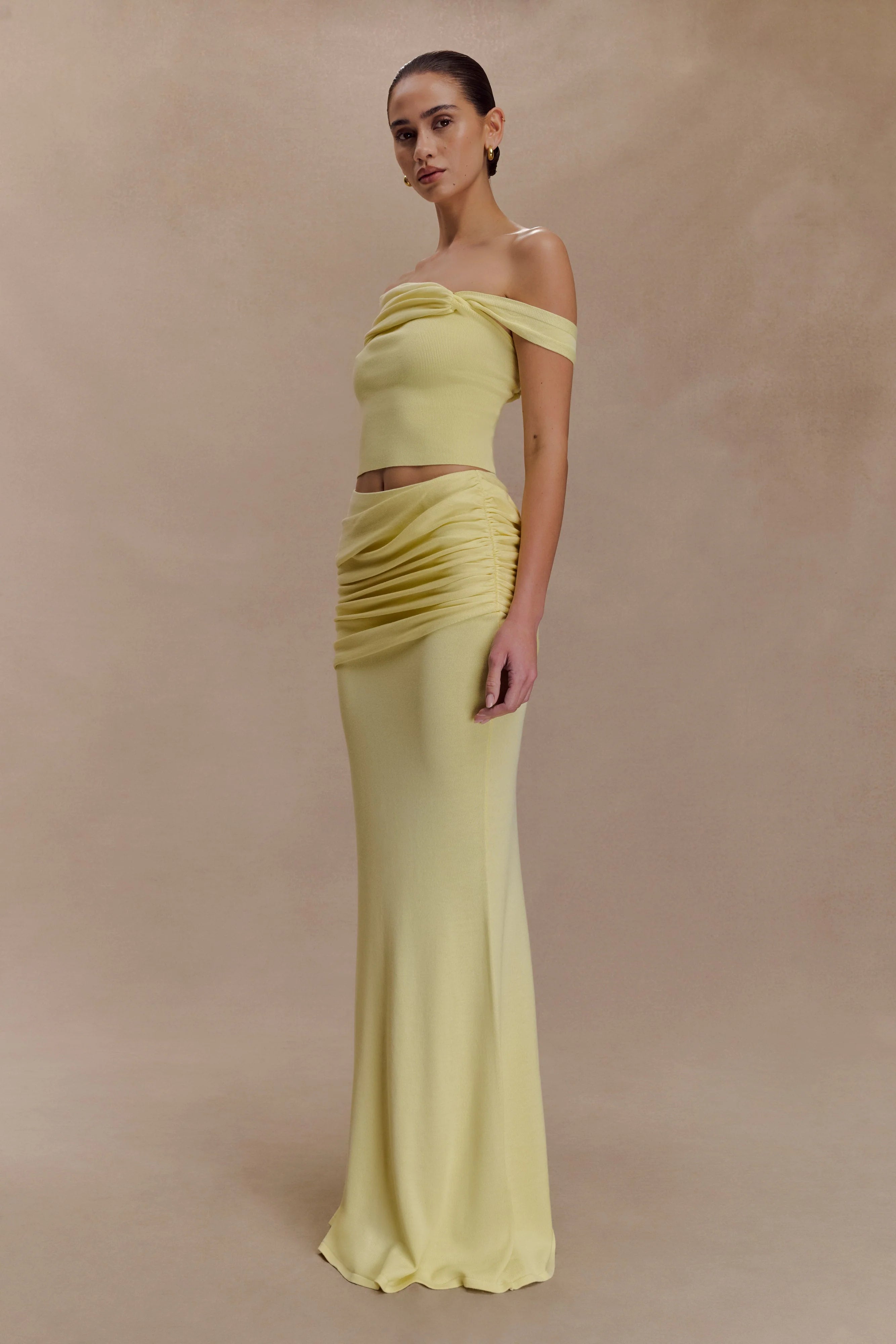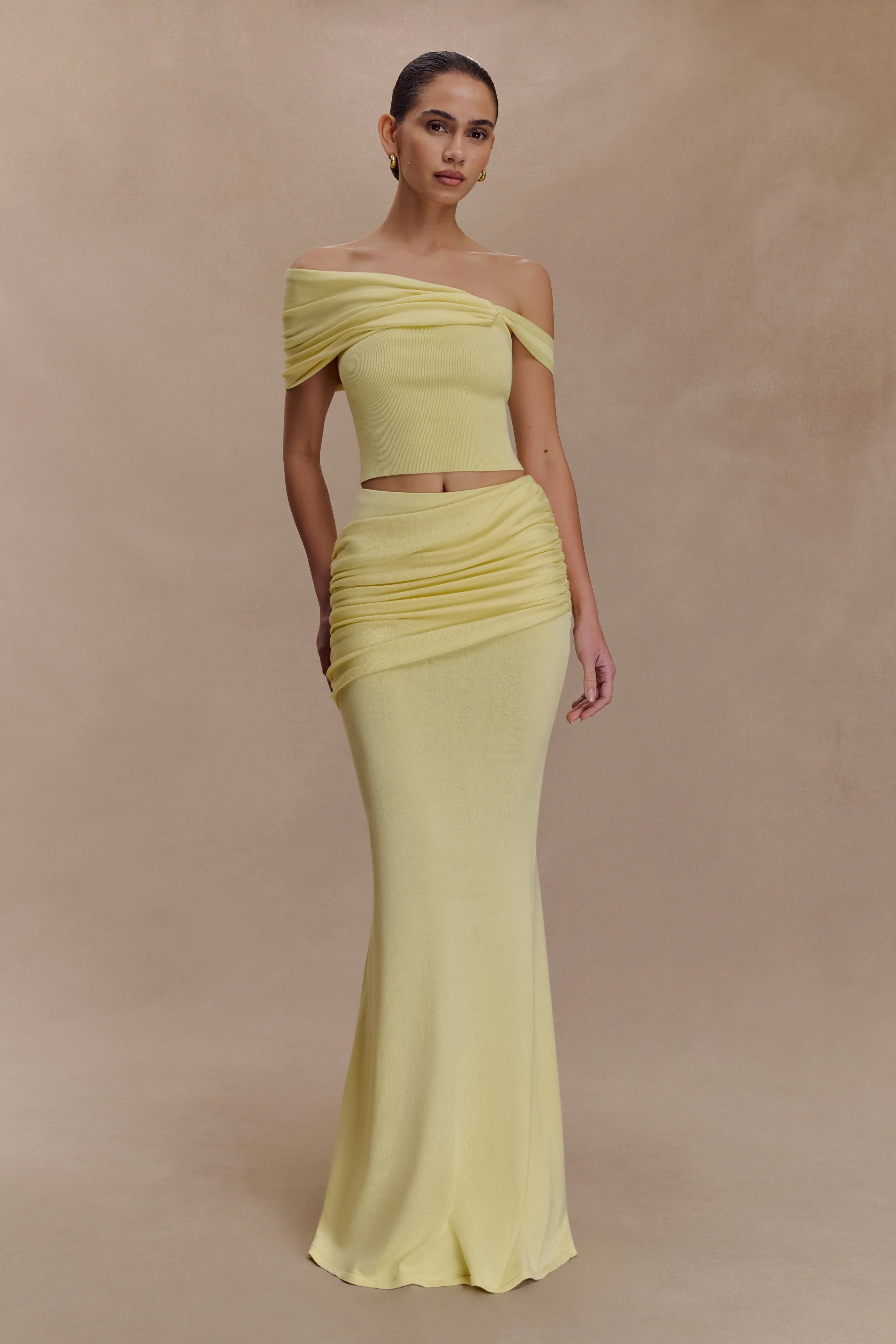 The IRENE Gathered Knit Top is a modern take on effortless elegance. Designed with an asymmetrical silhouette and off-the-shoulder Bardot sleeves, this bodycon fit contours the frame with soft, flattering gathers. The pull-on design ensures ease of wear, while the unlined knit fabrication keeps it lightweight and breathable. Perfectly paired with the , this coordinated set creates a sophisticated yet effortless statement for any occasion.