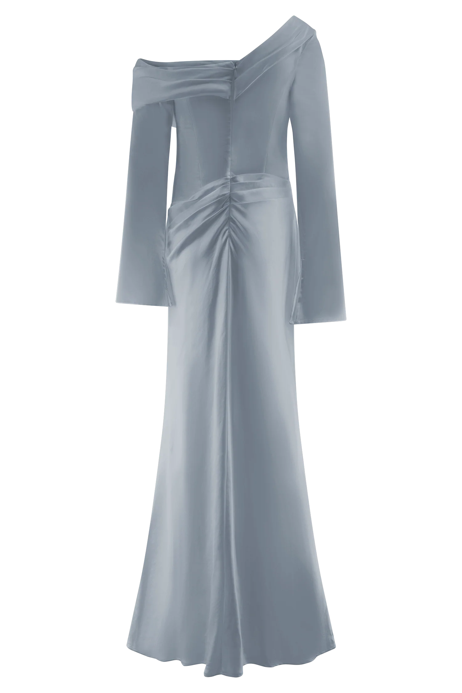 The IRIS Long Sleeve Satin Maxi Dress is a statement of refined elegance. Designed with an asymmetrical neckline and a gathered bust overlay, this silhouette drapes beautifully while enhancing the figure. The fitted, boned bodice provides structure and support, while the gathered hip detail adds soft dimension. A flowing maxi-length skirt completes the look with effortless grace. Finished with an internal elastic waist stay for a secure fit and a back zip with hook-and-eye closure, the Iris dress is perfect for formal occasions, black-tie events, and unforgettable moments.