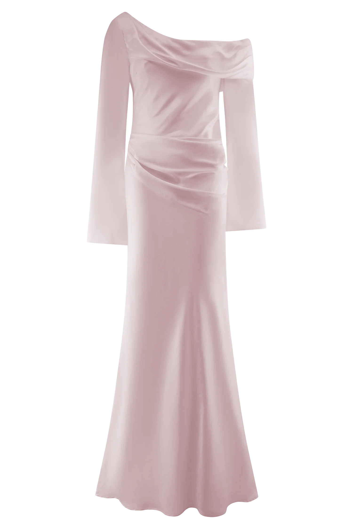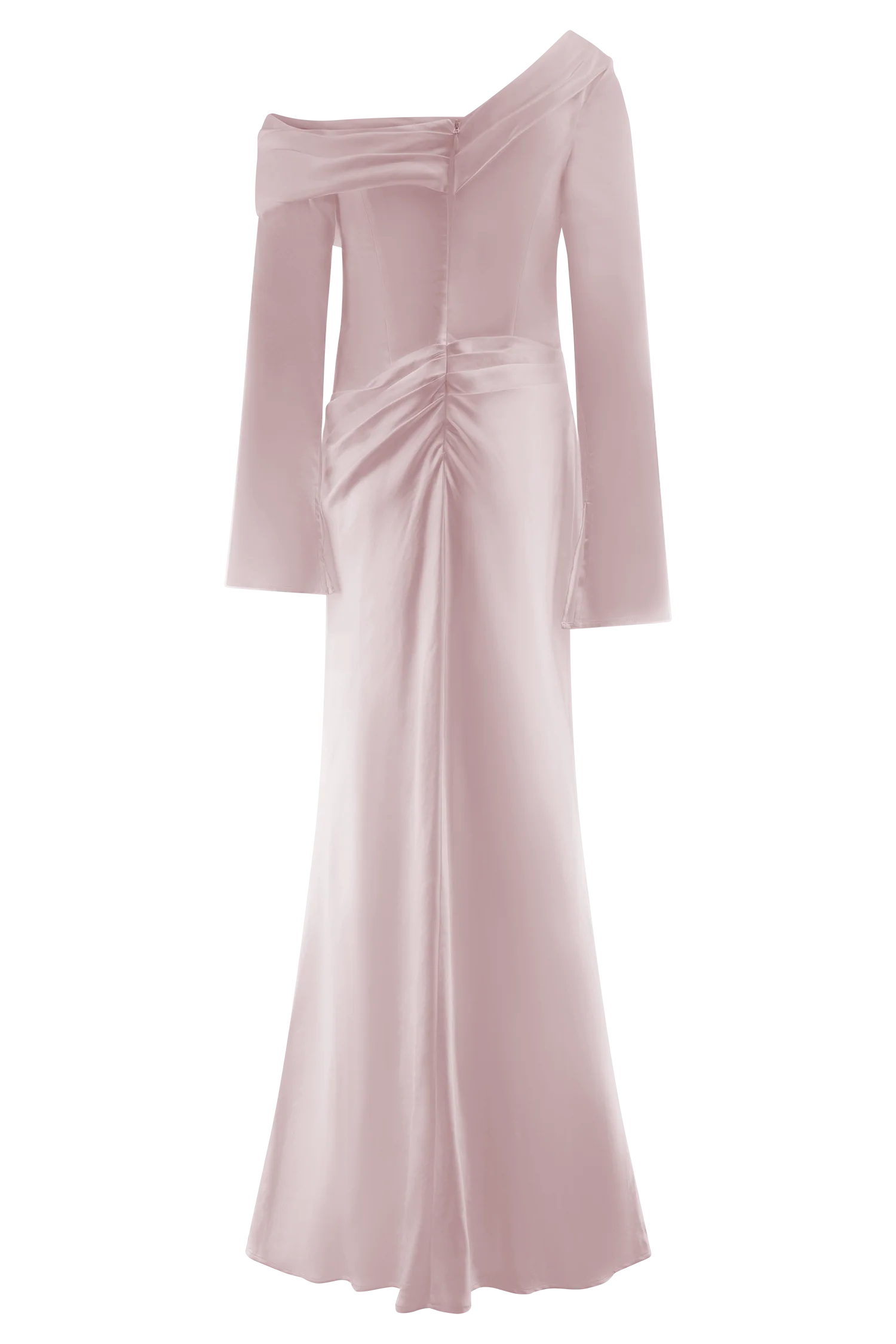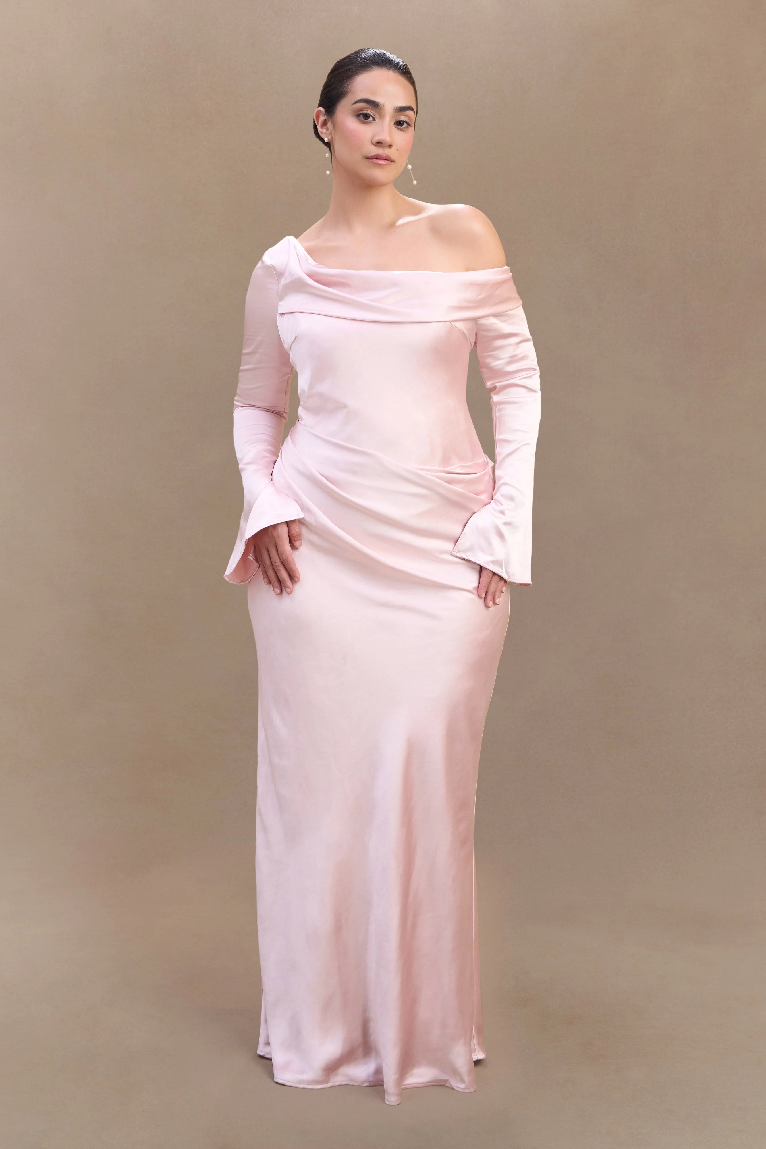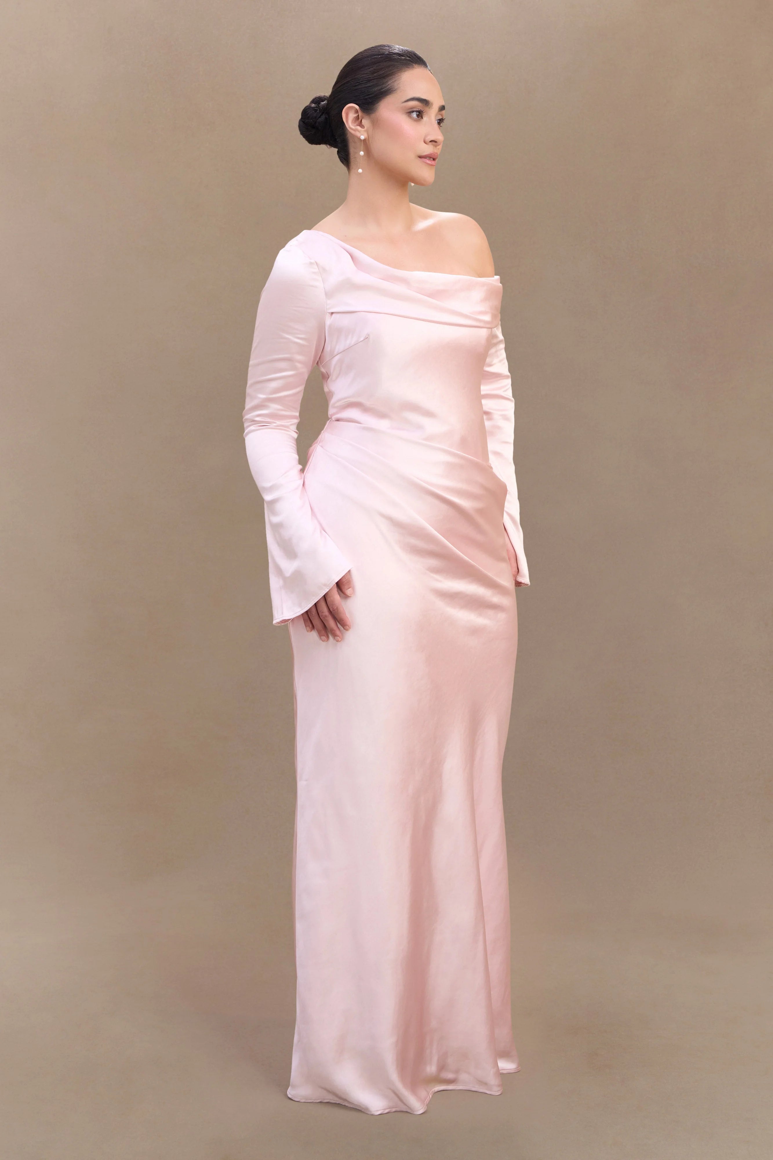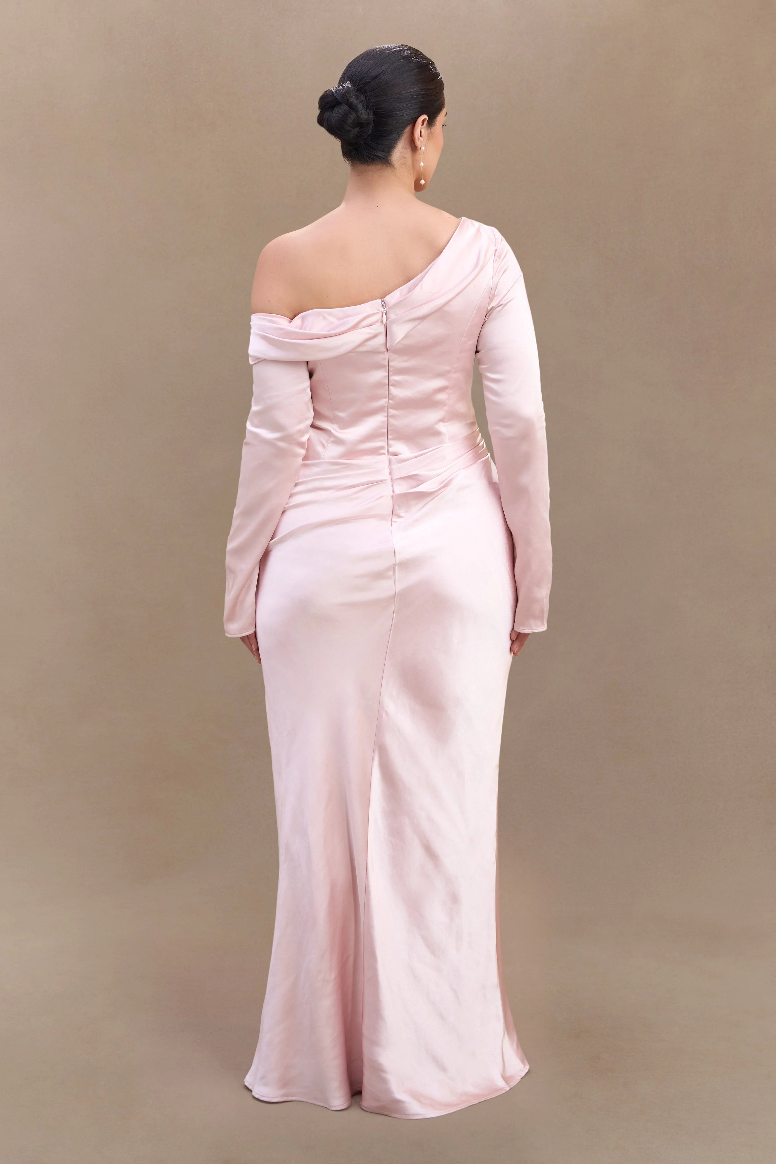 The IRIS Long Sleeve Satin Maxi Dress is a statement of refined elegance. Designed with an asymmetrical neckline and a gathered bust overlay, this silhouette drapes beautifully while enhancing the figure. The fitted, boned bodice provides structure and support, while the gathered hip detail adds soft dimension. A flowing maxi-length skirt completes the look with effortless grace. Finished with an internal elastic waist stay for a secure fit and a back zip with hook-and-eye closure, the Iris dress is perfect for formal occasions, black-tie events, and unforgettable moments.