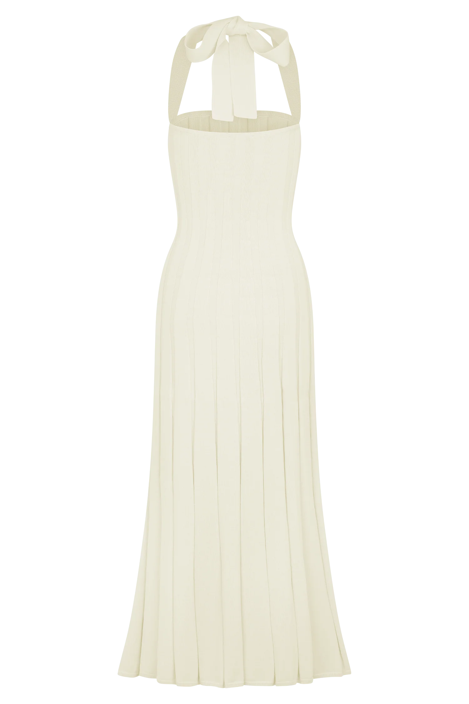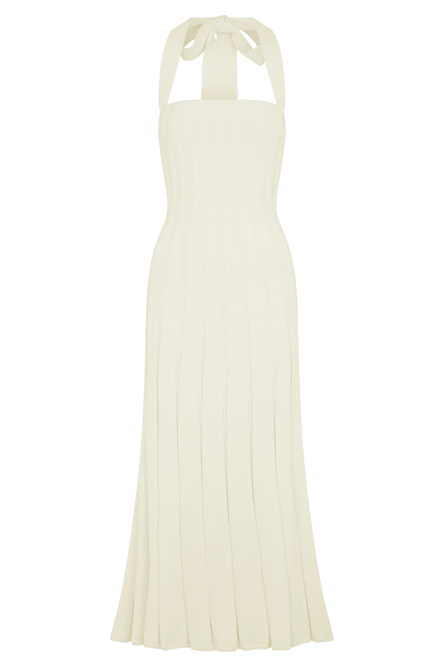 The JACQUI Halter Knit Midi Dress is a refined blend of modern simplicity and feminine charm. Designed with a sleek halter neckline, this dress beautifully elongates the silhouette while offering a timeless, sophisticated look. The ribbed knit fabric provides a figure-hugging fit, while the pleated hem detail adds movement and texture for an elevated finish. Unlined for a lightweight feel, this midi-length dress is perfect for both casual and dressy occasions.