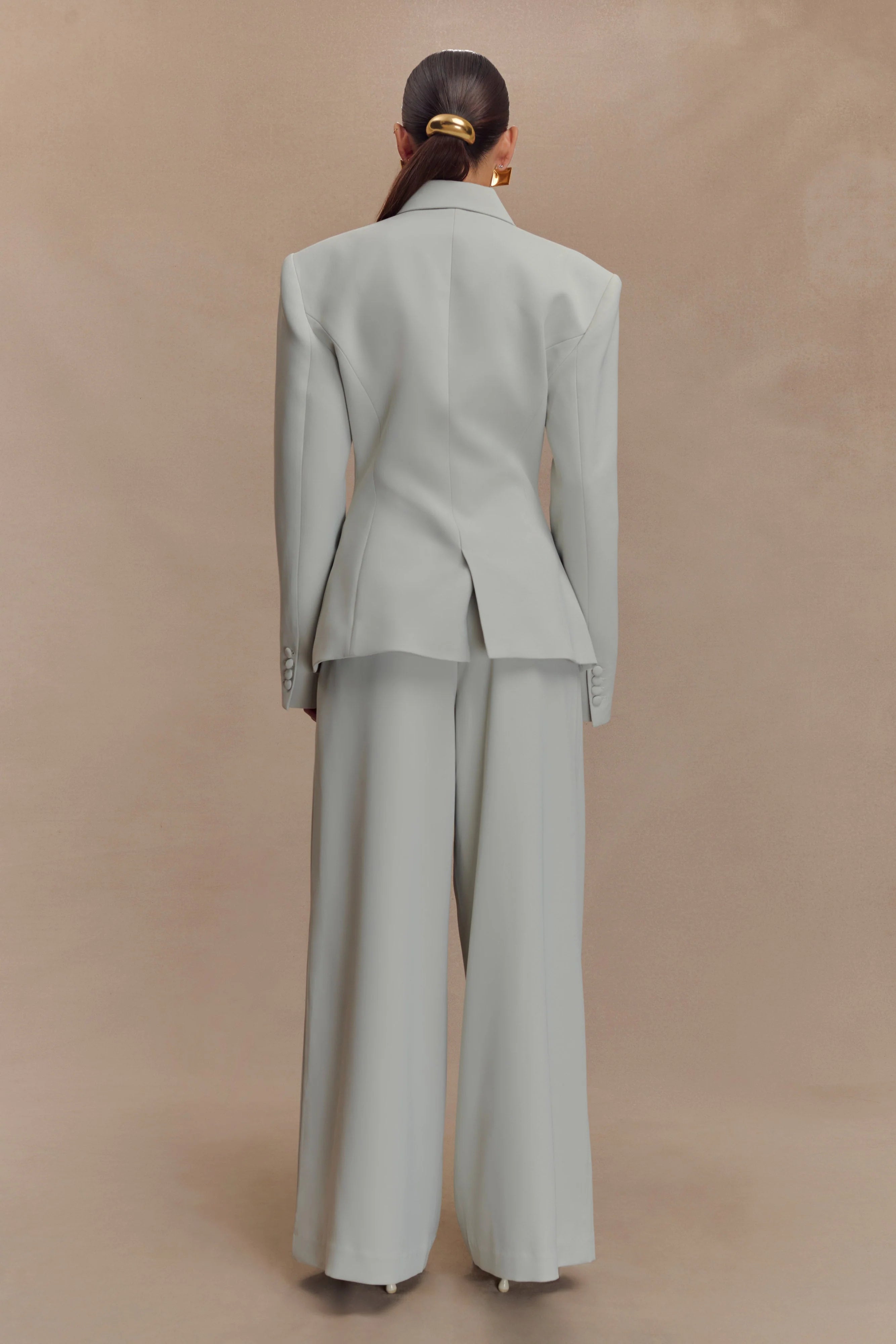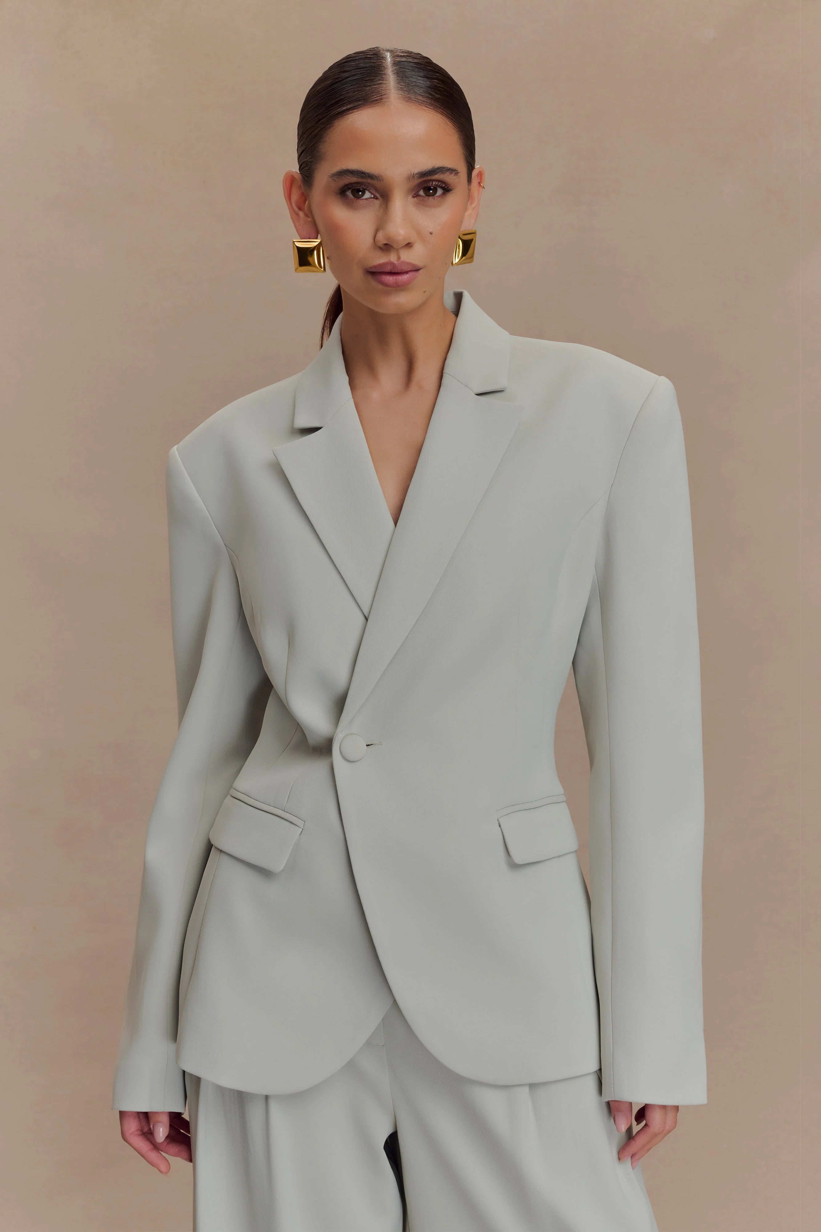 The JAMESON Cinched Suiting Blazer redefines classic tailoring with a contemporary twist. Featuring a sharp collar and lapel, this blazer stands out with its asymmetric wrap enclosure and button fastening that cinches the waist for a sculpted silhouette. Front pocket flaps add a refined touch, while the back vent ensures ease of movement. Fully lined for a polished finish, it pairs perfectly with the for a power set that balances sharp structure with effortless flow.