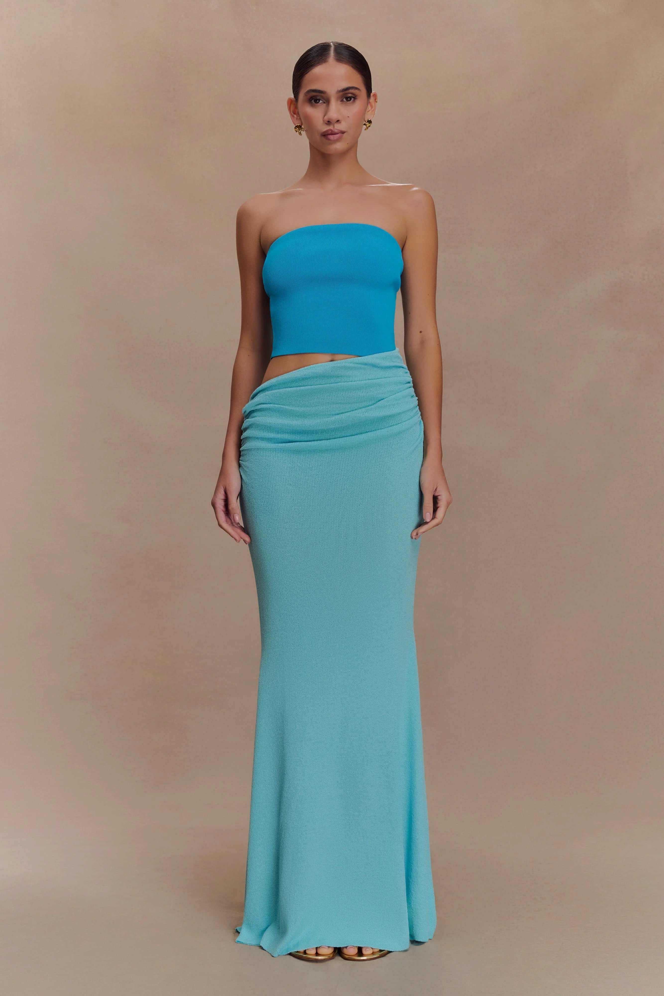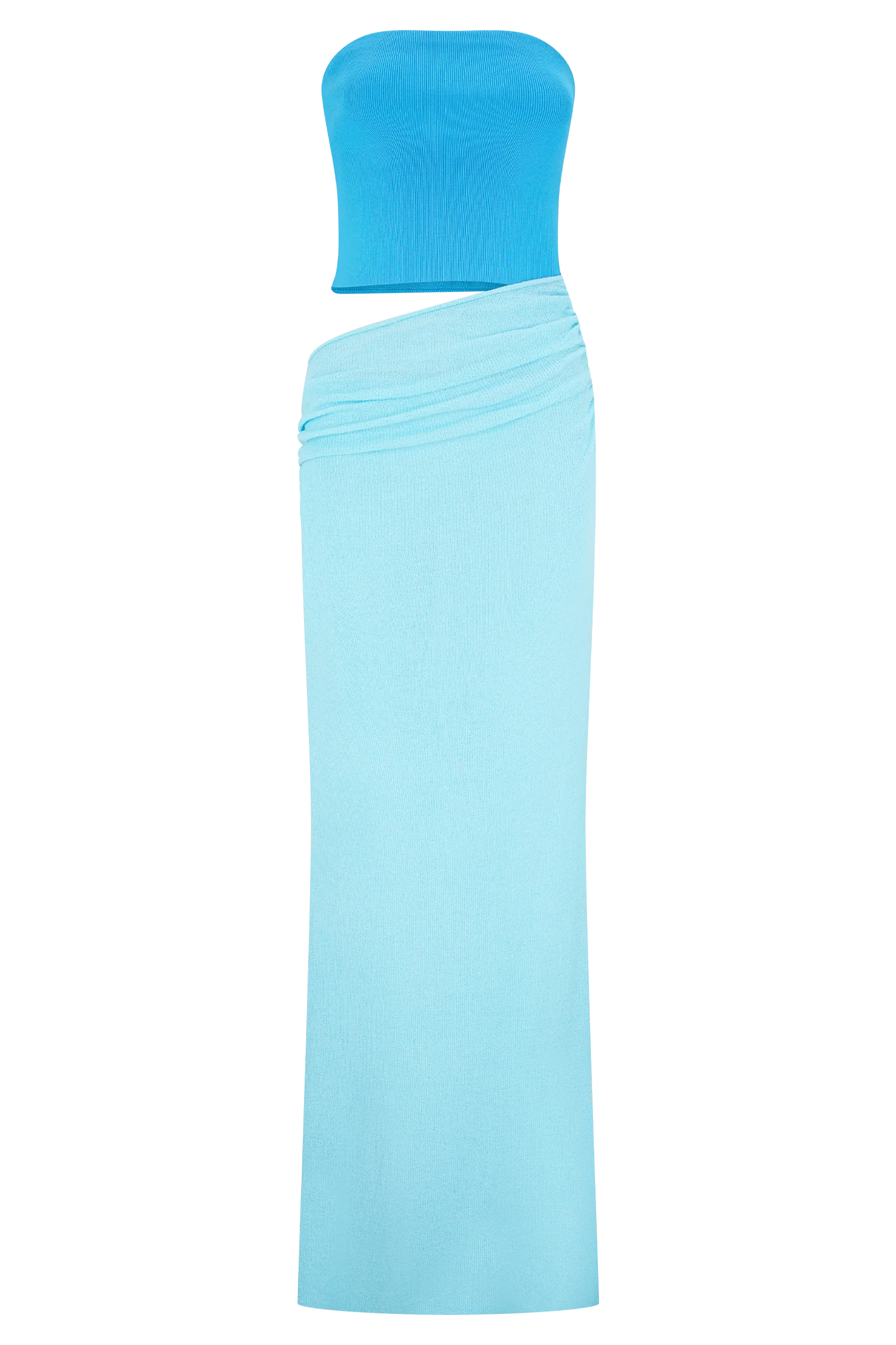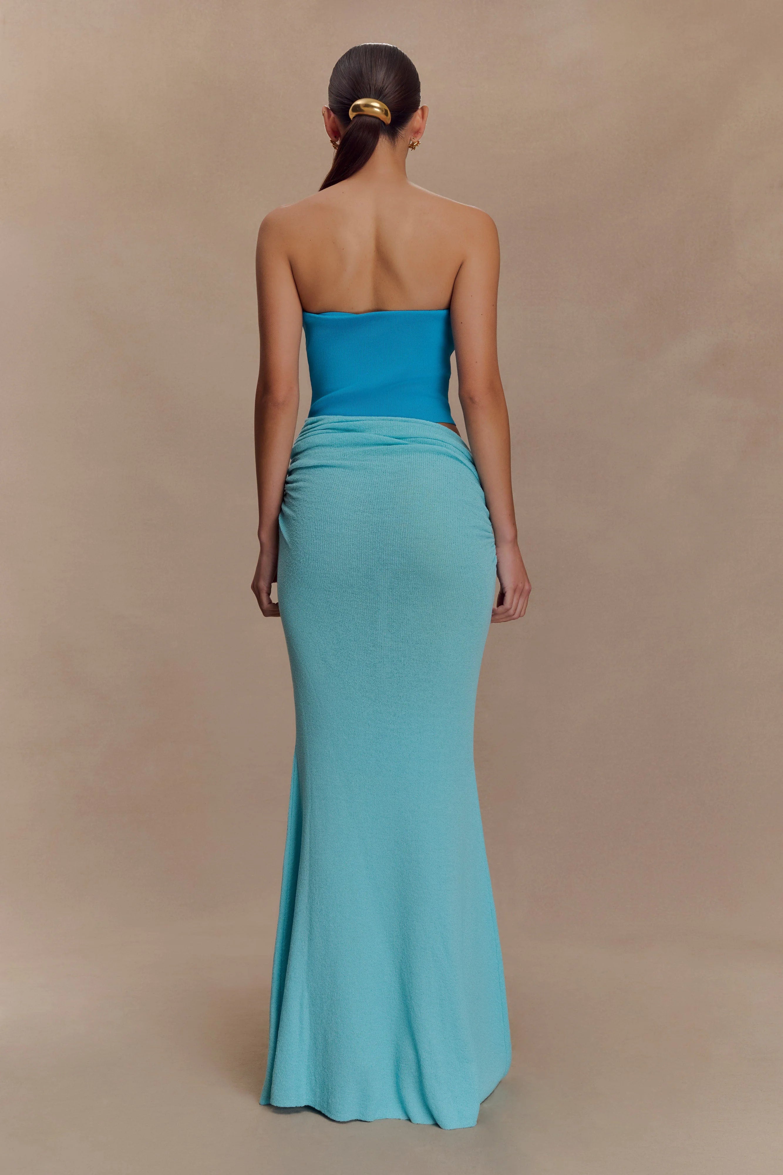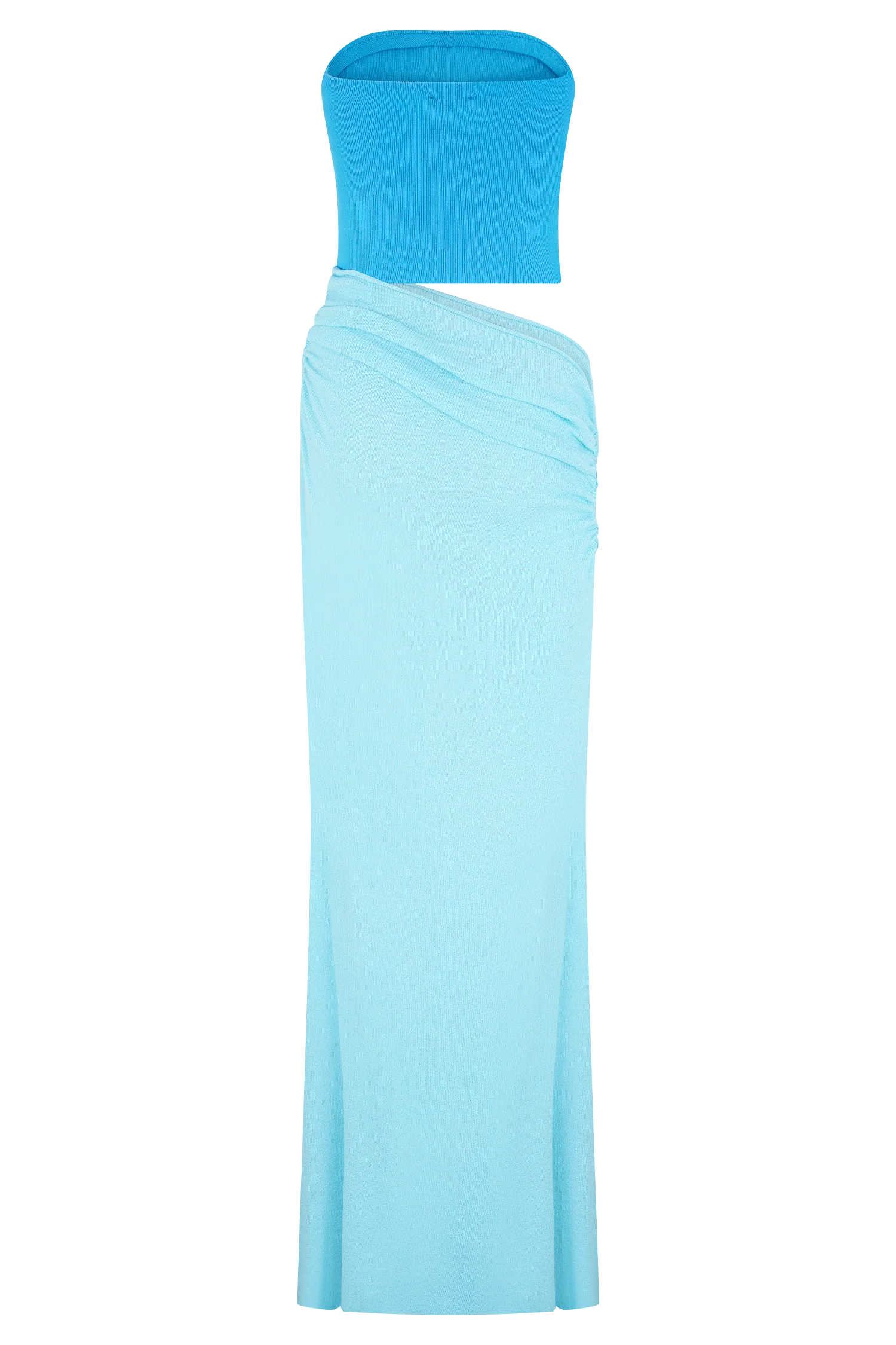 The JASIEL Strapless Knit Maxi Dress is designed to flatter with effortless ease. Featuring a fitted strapless bodice and a contrast knit skirt, this unlined maxi dress is elevated by an asymmetrical waistline and gathered hip detailing that enhances the body’s natural curves. The fishtail hem adds graceful movement, making this piece perfect for warm evenings, coastal escapes, or elevated everyday dressing with a refined twist.